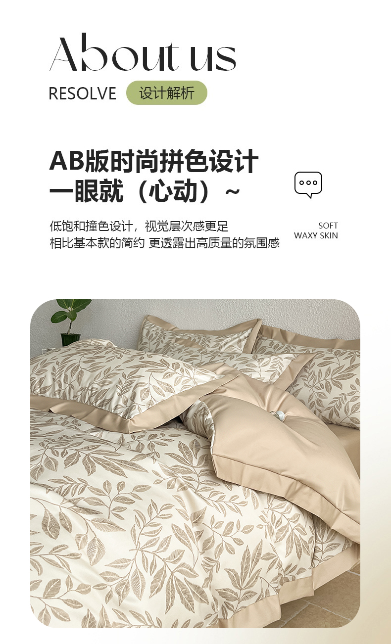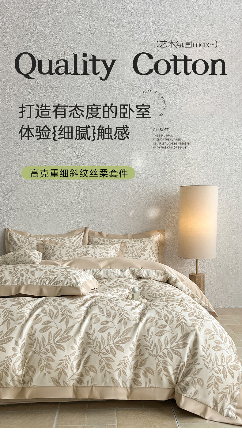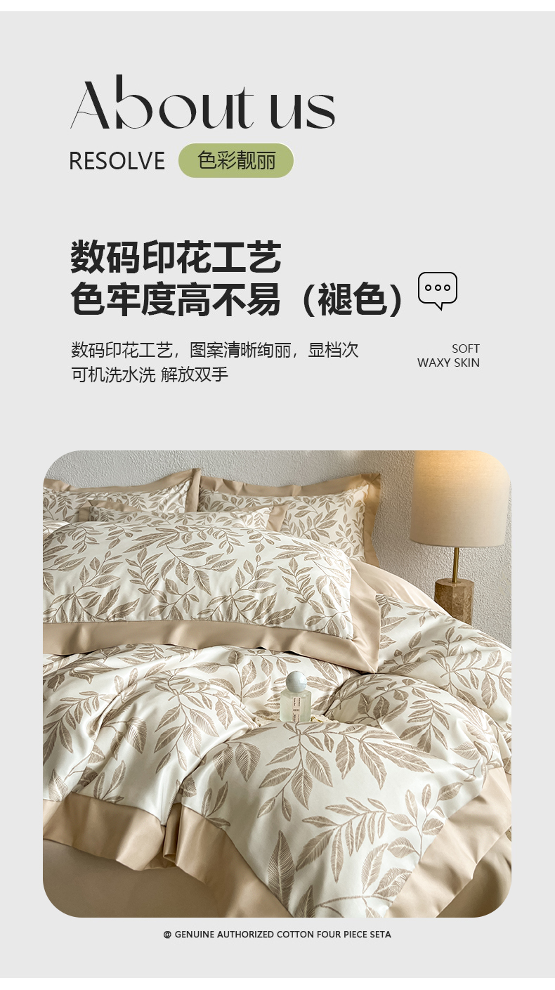 金牛座家纺 2026新款高克重细斜纹丝柔质感亲肤数码印花宽边四件套-叶舞系列 叶舞-香槟