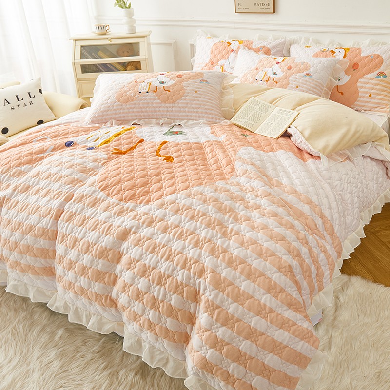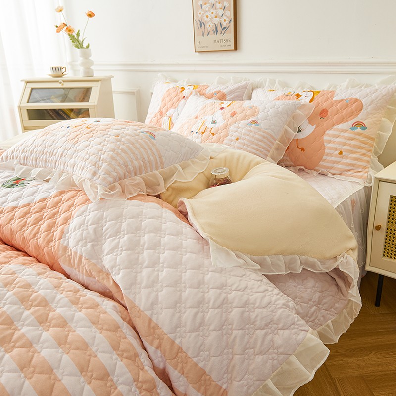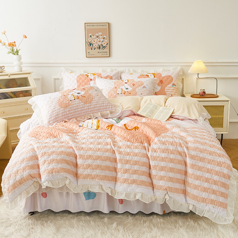当前位置: 91家纺网 > 商品网购 > 床品套件 > 四件套 > 水晶绒四件套 > 爱思佳2023新款180g水晶绒印花夹棉床裙款四件套卡通系列旅行鸭-米