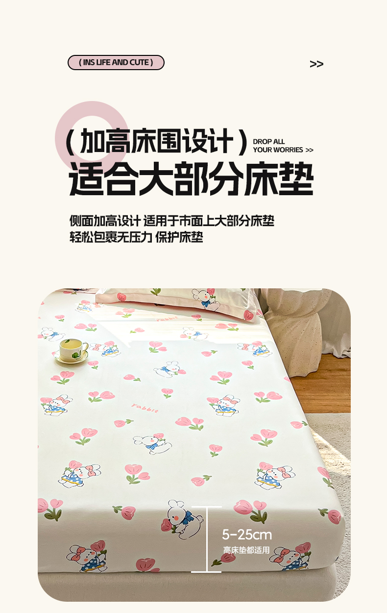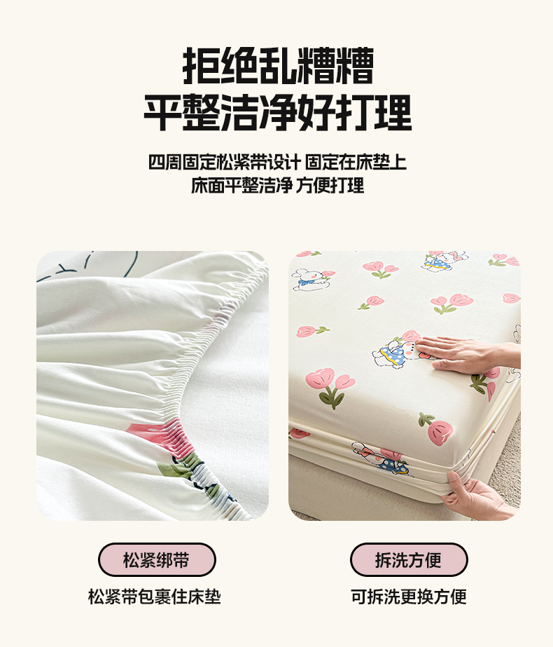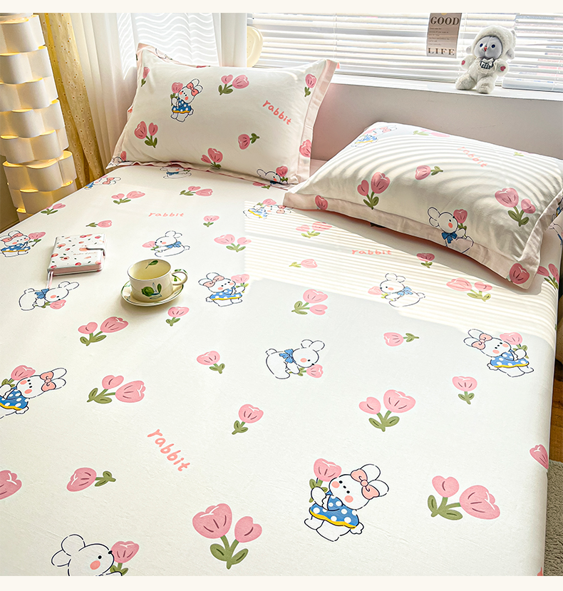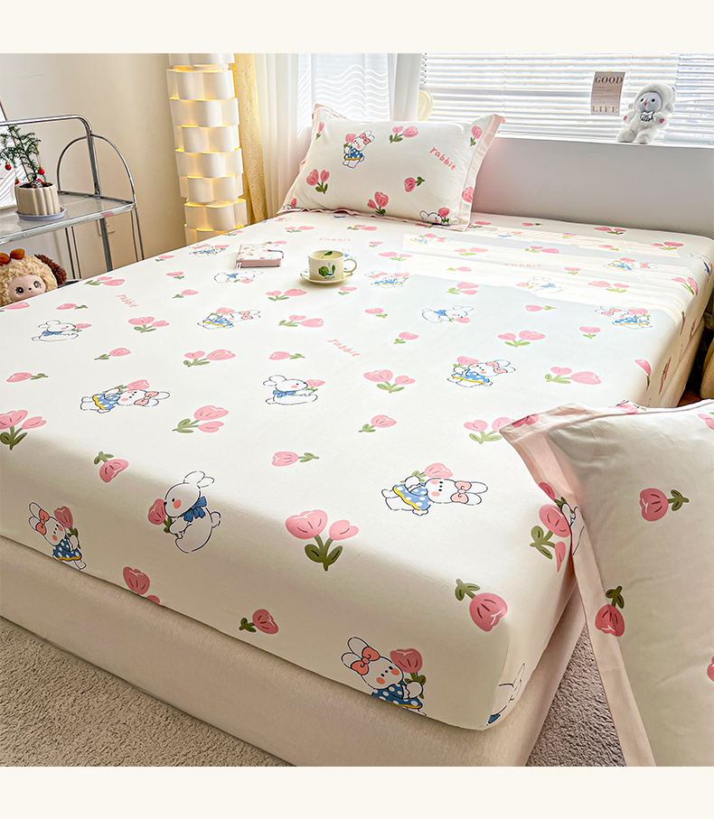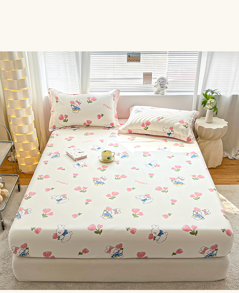 • 91家纺网 家纺一手货源 找家纺 涵宸家纺 2024新款全棉小清新印花单品套件--单床笠 床笠-花丛兔