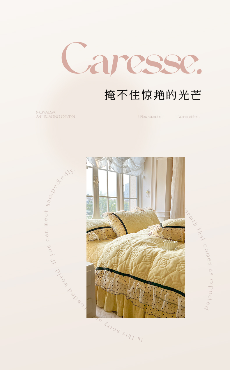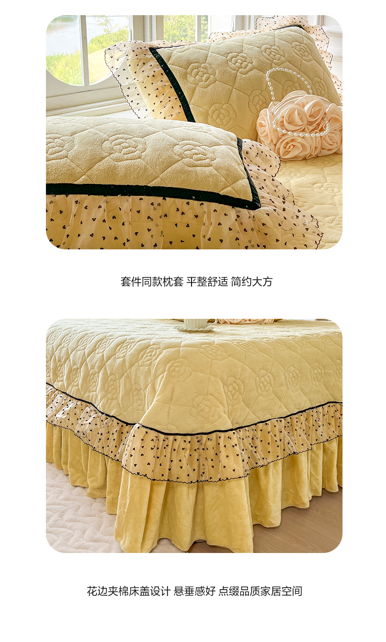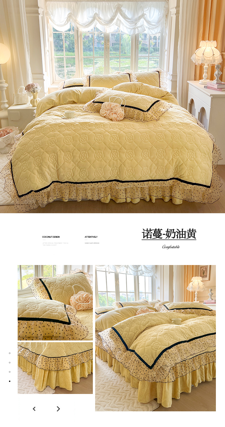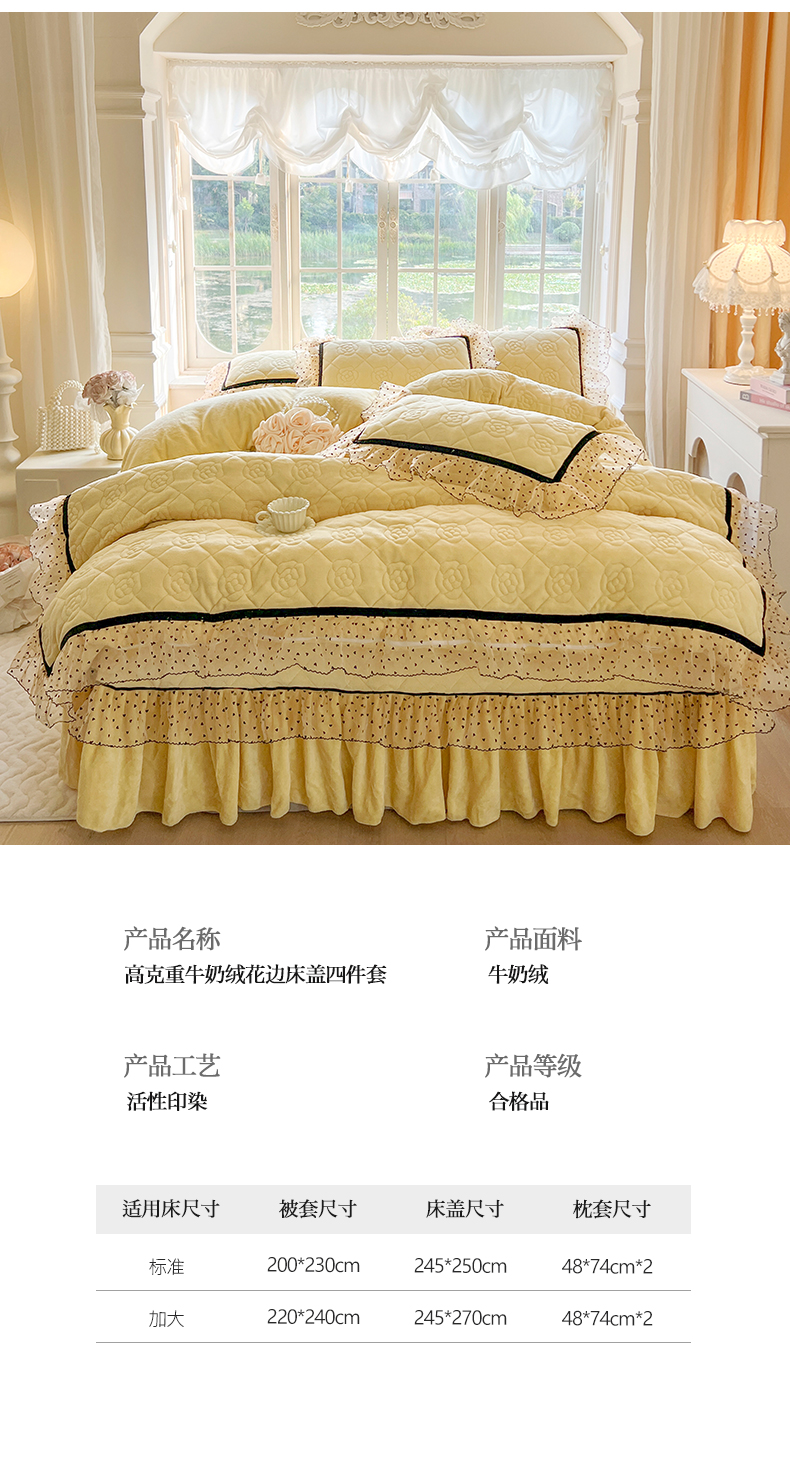 商品名称:麒豆豆 2024新款高克重时尚花边牛奶绒四件套床盖款-诺蔓 诺蔓-奶油黄