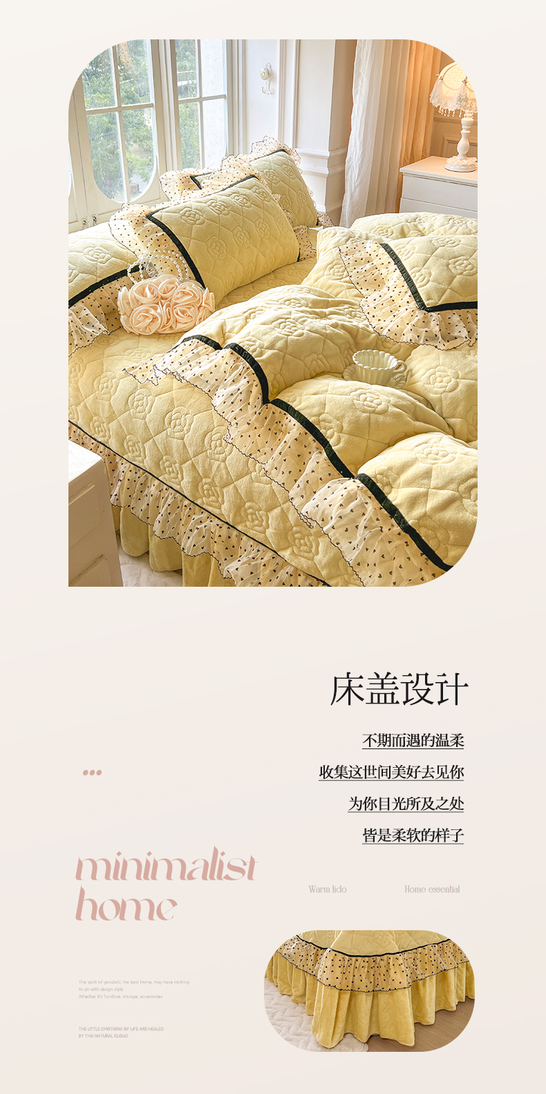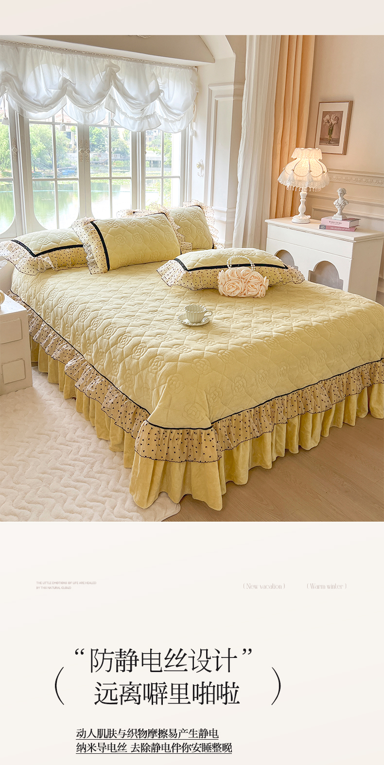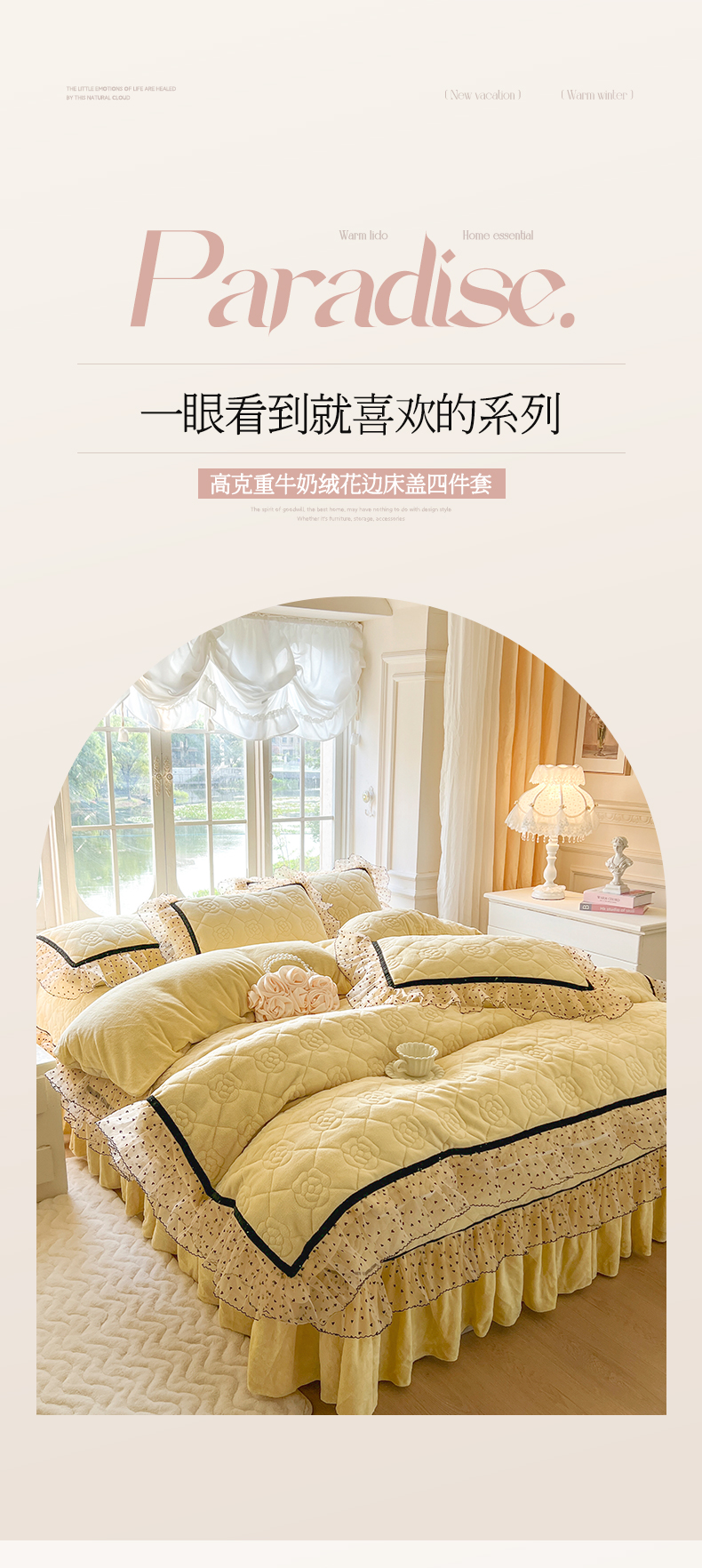 商品名称:麒豆豆 2024新款高克重时尚花边牛奶绒四件套床盖款-诺蔓 诺蔓-奶油黄