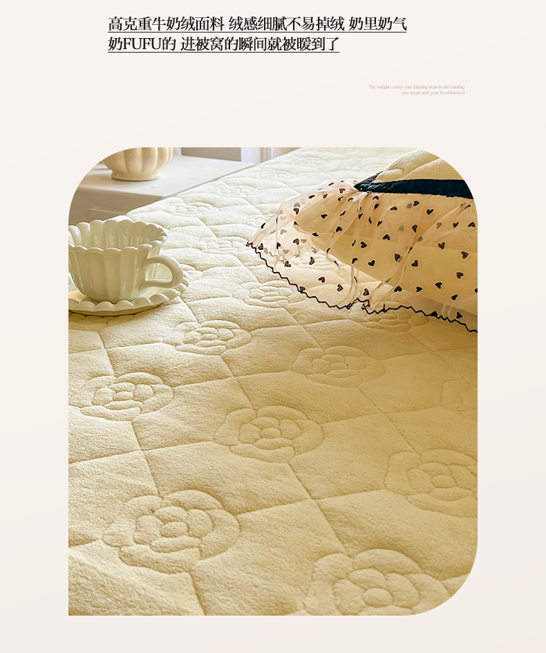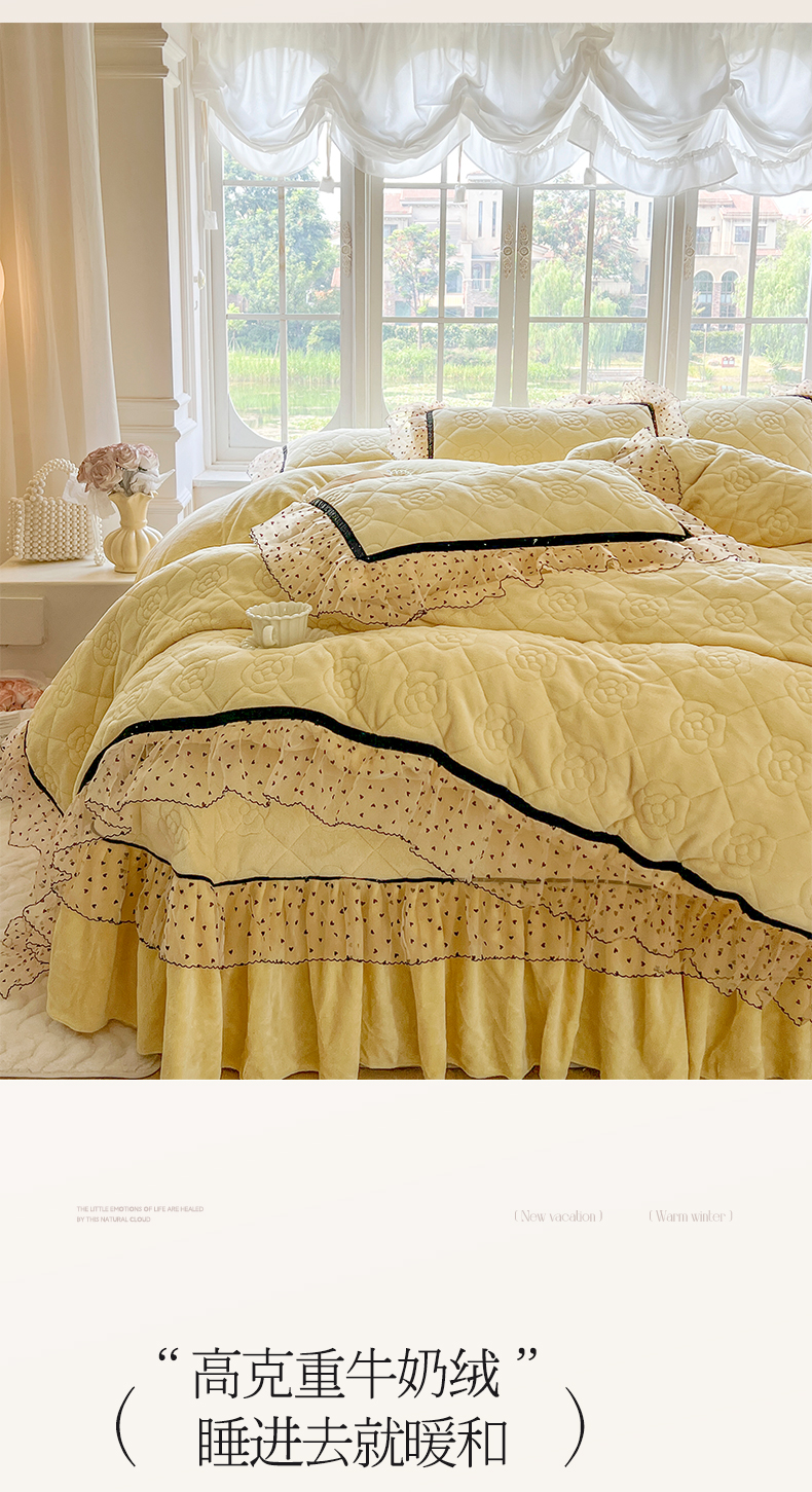 麒豆豆 2024新款高克重时尚花边牛奶绒四件套床盖款-诺蔓 诺蔓-奶油黄
