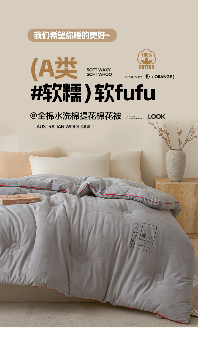 莱登卡奴 25新款全棉A类水洗棉提花100%棉花被夏被 棉花被-华尚灰