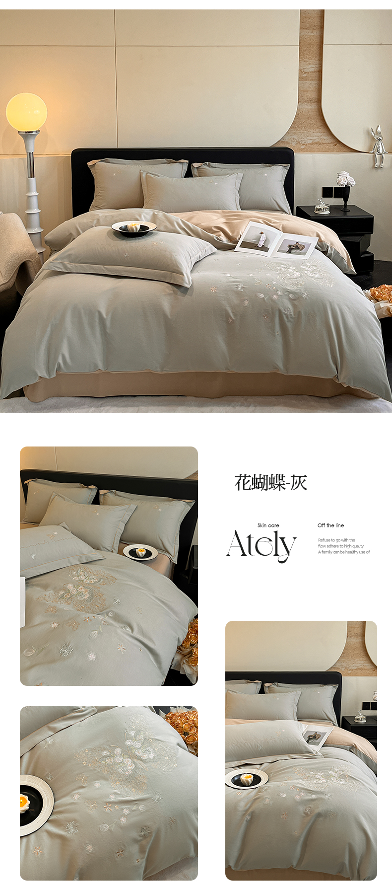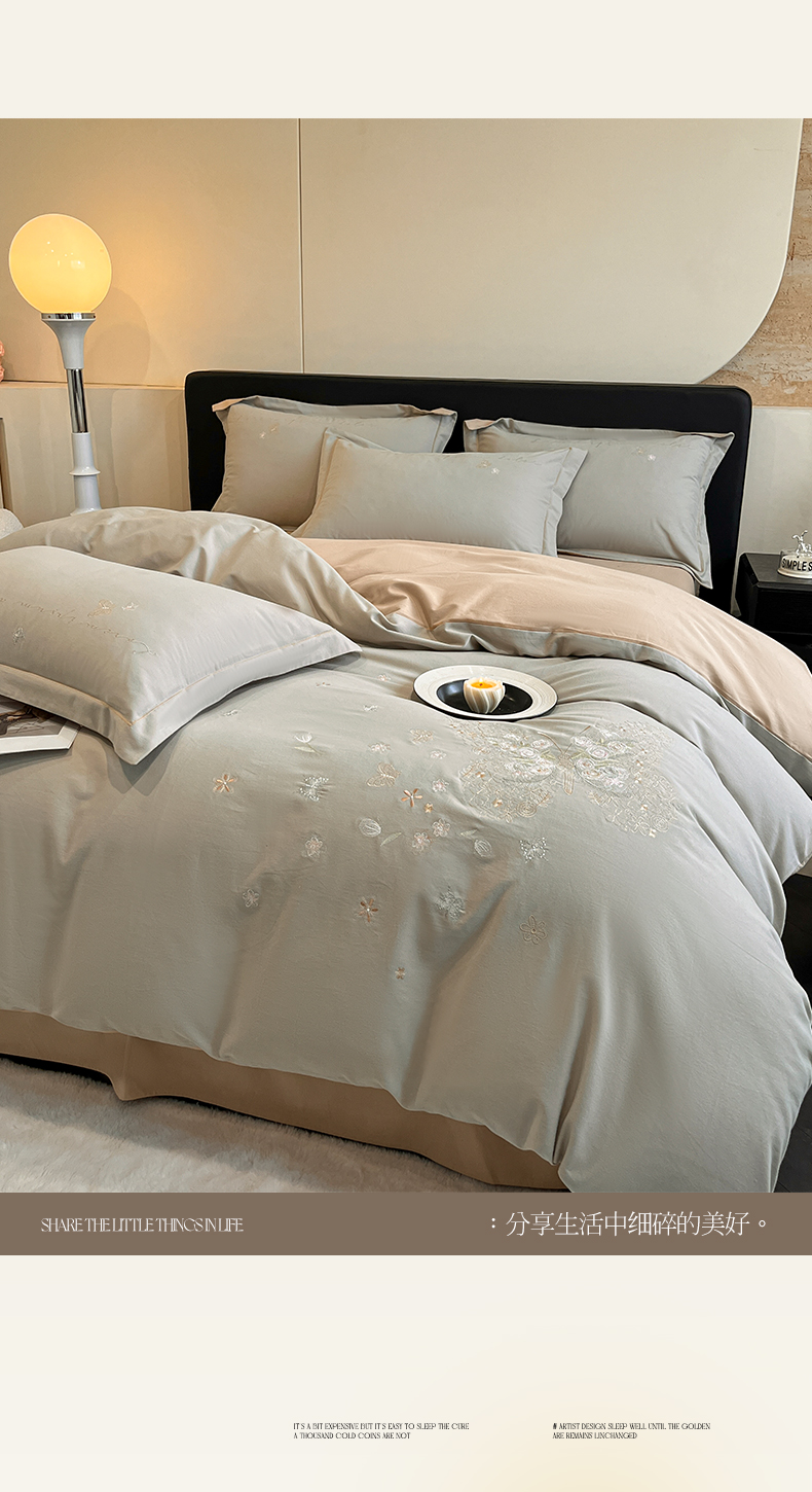 (总)涵宸家纺 2025新款全棉磨毛刺绣四件套系列-花蝴蝶,花蝴蝶-灰,花蝴蝶-奶白,花蝴蝶-浅粉