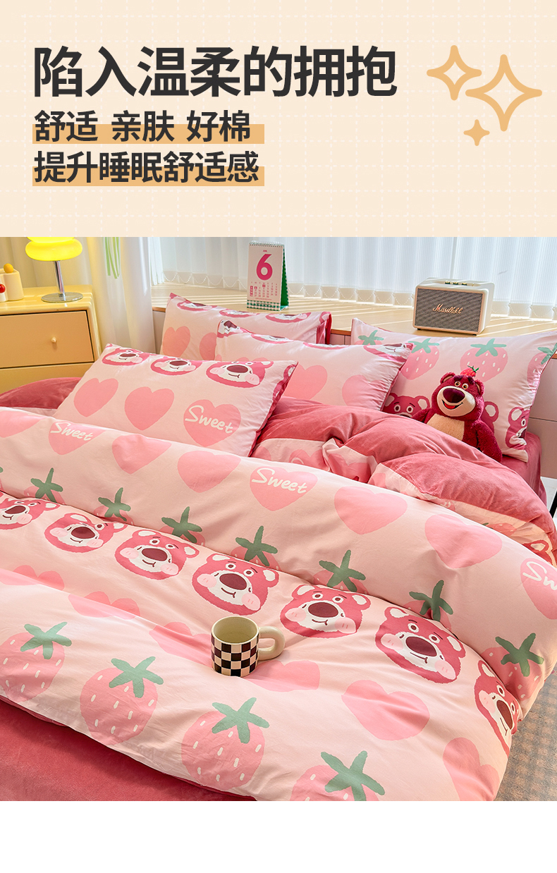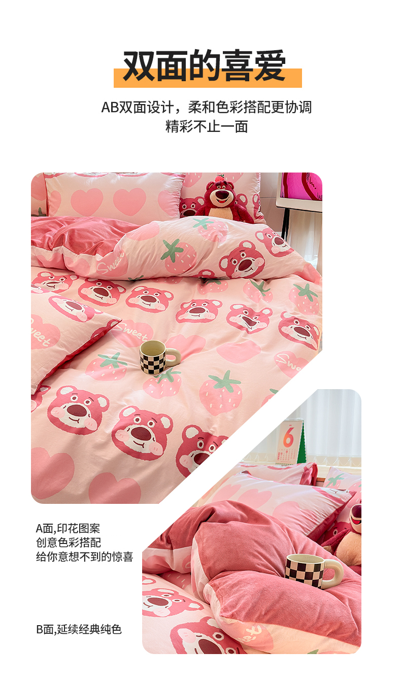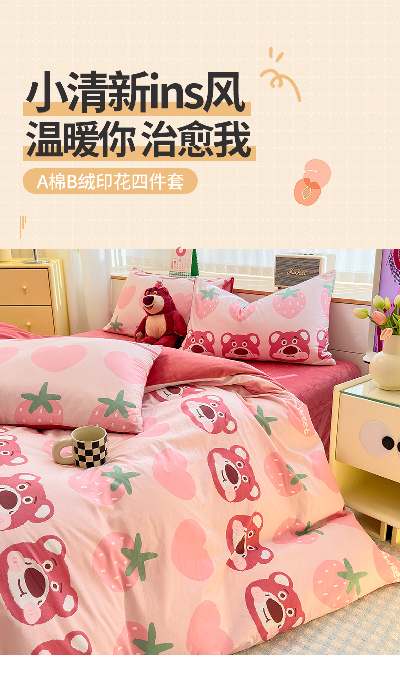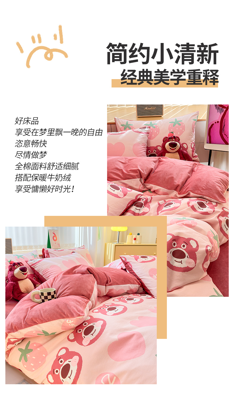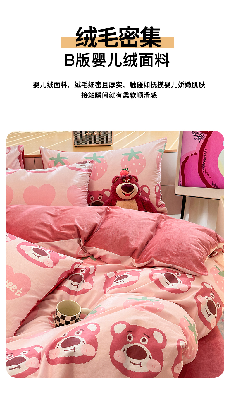 当前位置: 91家纺网 > 商品网购 > 床品套件 > 四件套 > 全棉普通四件套 > 清雅福 2025秋冬新品全棉印花棉加绒四件套系列 棉绒-甜心熊