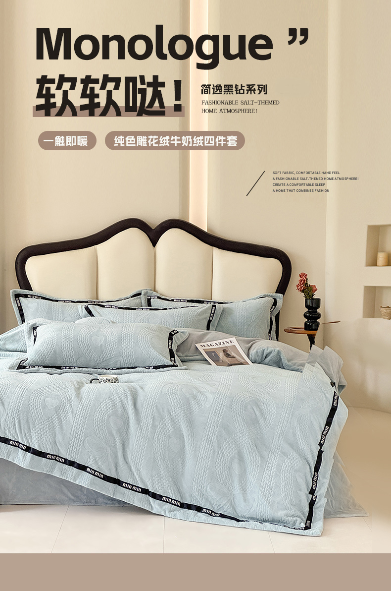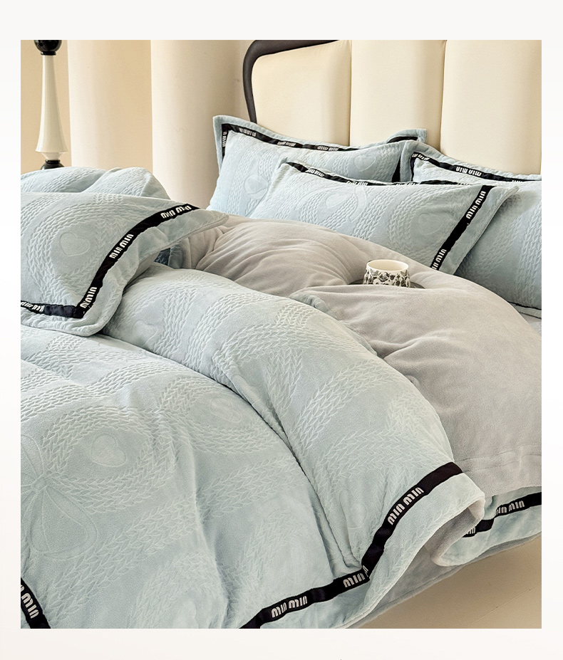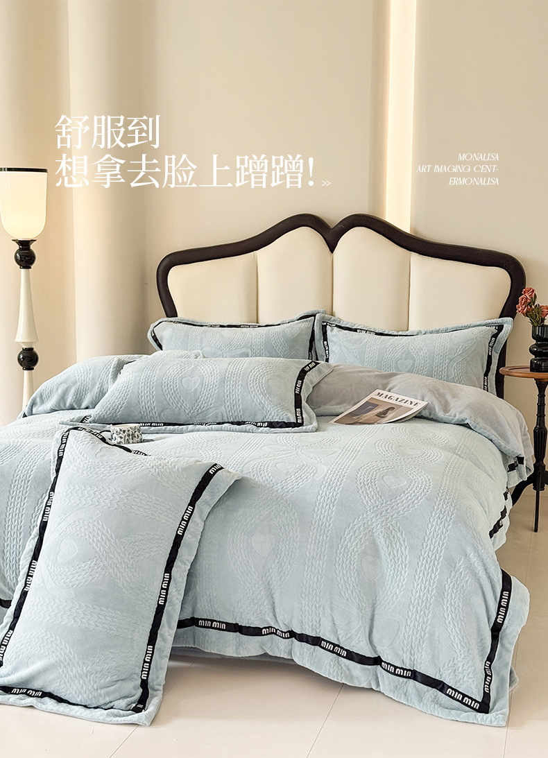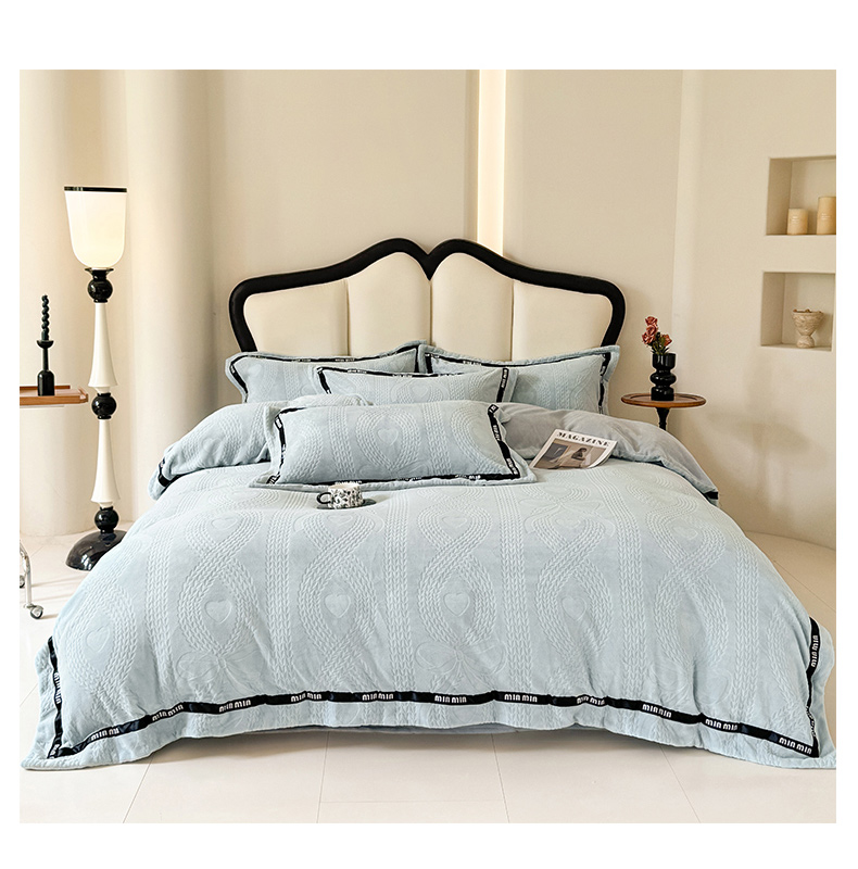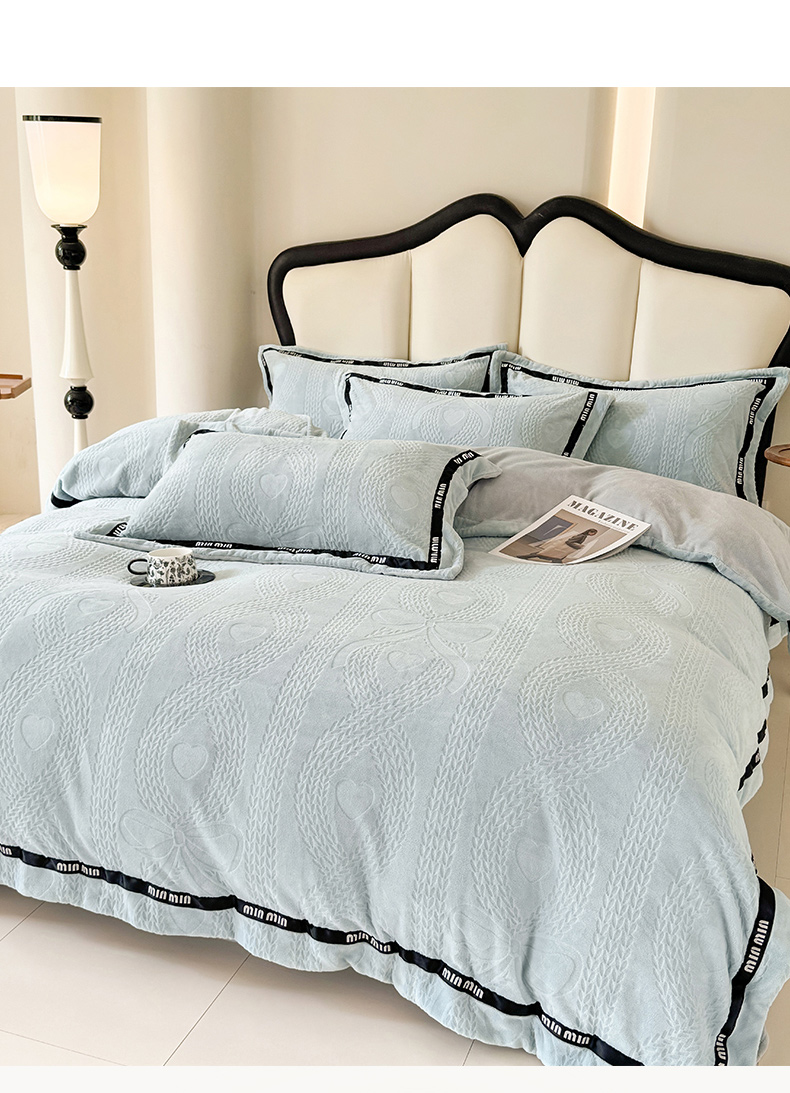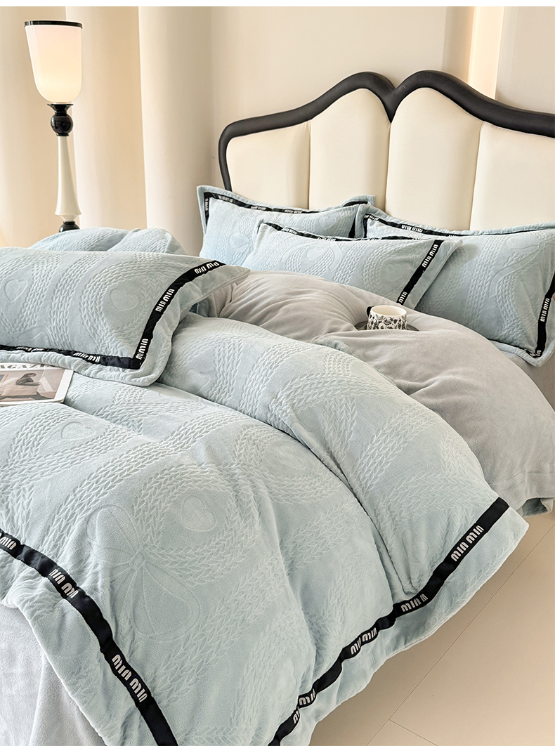 当前位置: 91家纺网 > 商品网购 > 床品套件 > 四件套 > 牛奶绒四件套 > 潮邦创意家居 2025新款冬季雕花牛奶绒四件套-简逸黑钻 简逸黑钻-浅蓝