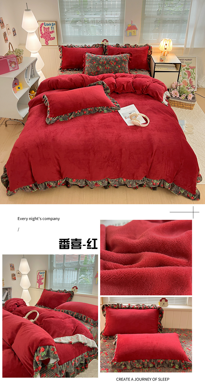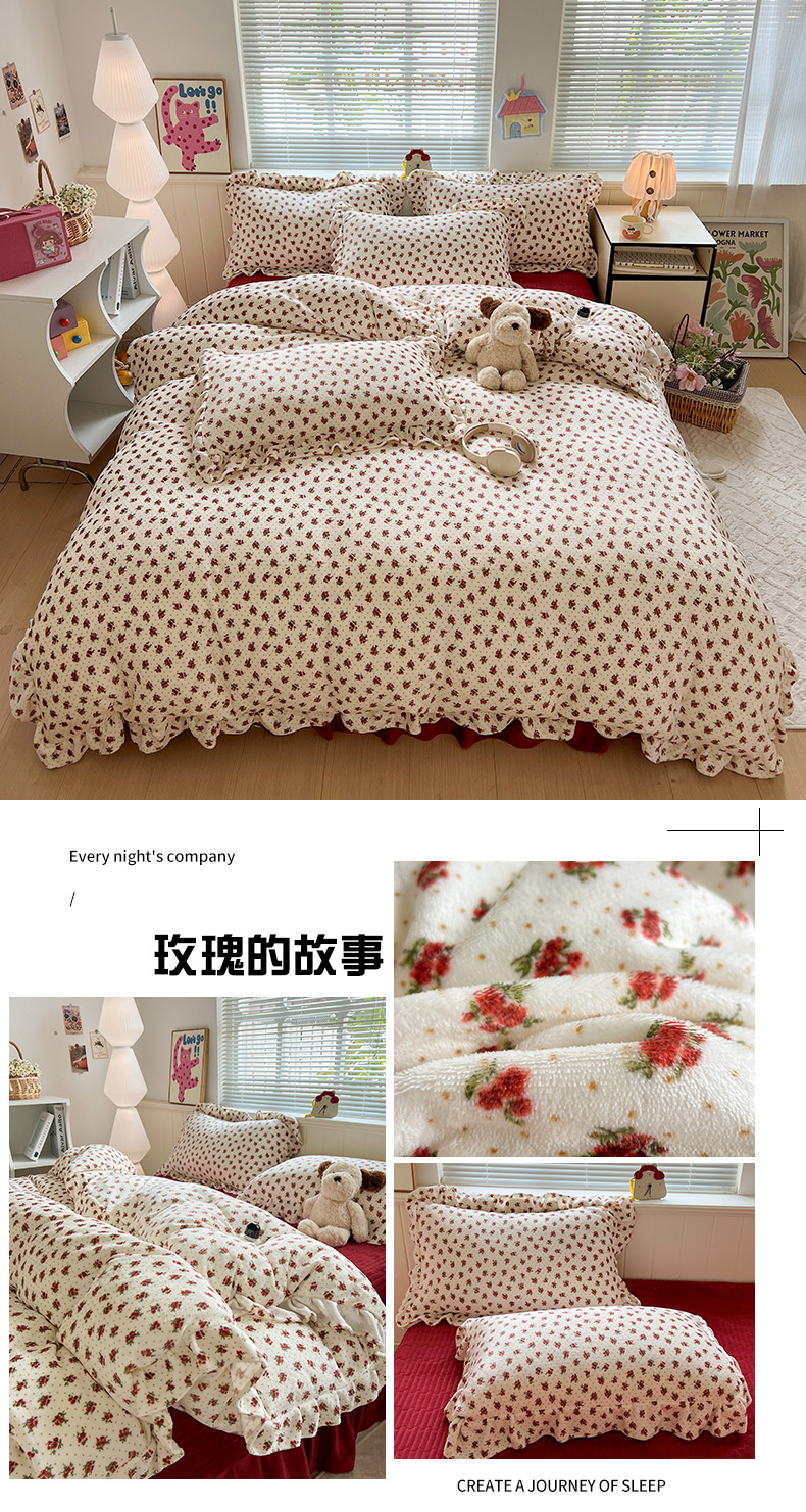 当前位置: 91家纺网 > 商品网购 > 床品套件 > 四件套 > 牛奶绒四件套 > 富米莱(原臻工厂) 2025新款热卖舒适花边牛奶绒床盖床裙床单四件套 梨花洛