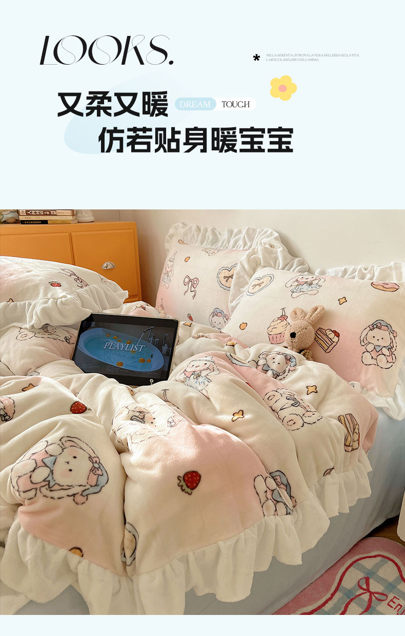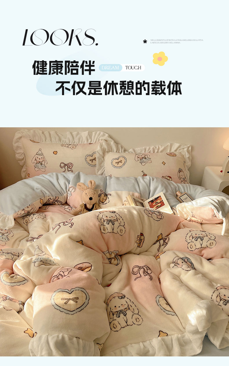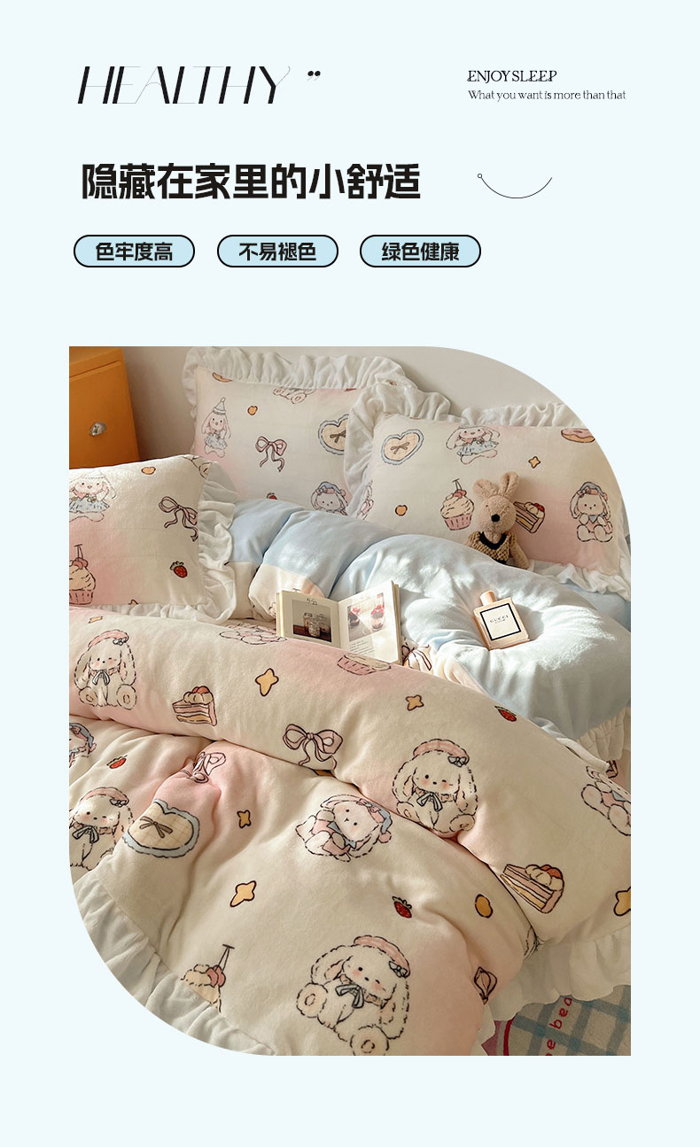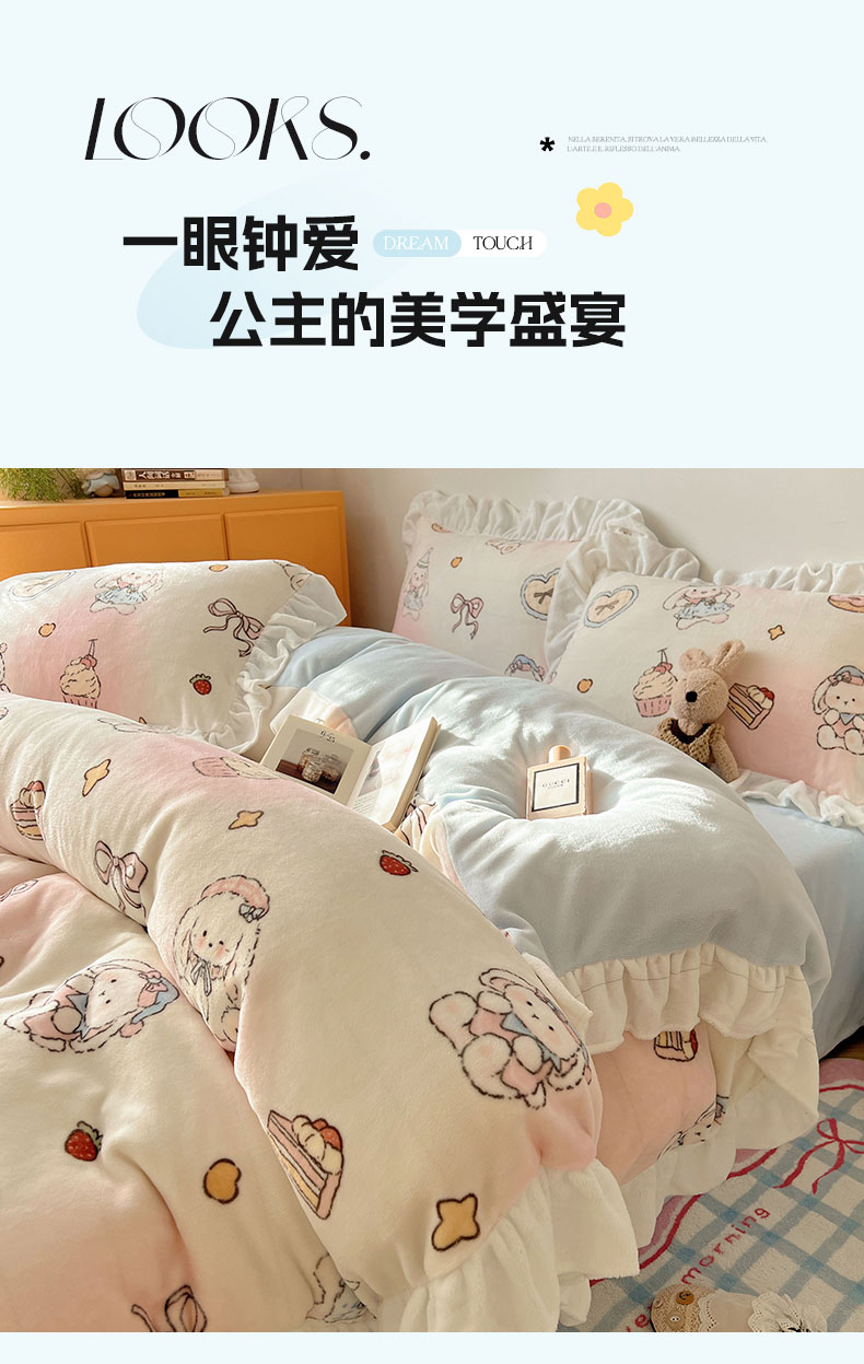 当前位置: 91家纺网 > 商品网购 > 床品套件 > 四件套 > 牛奶绒四件套 > 六巷胡同 2025新款韩式博主风花边款INS卡通牛奶绒四件套(第二系) 花边海派甜心兔