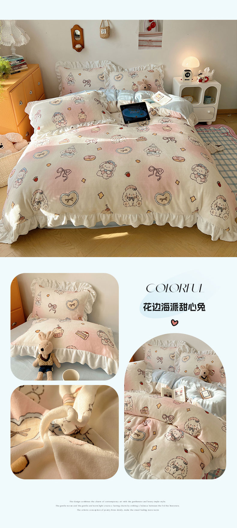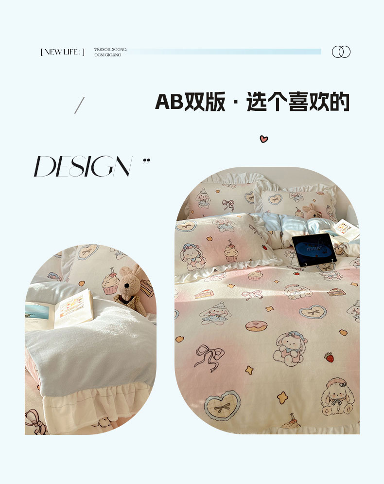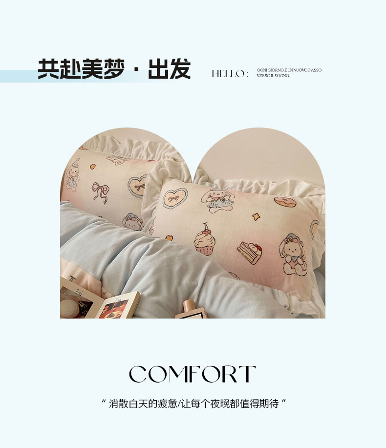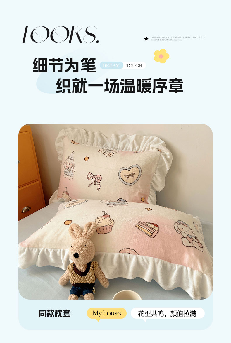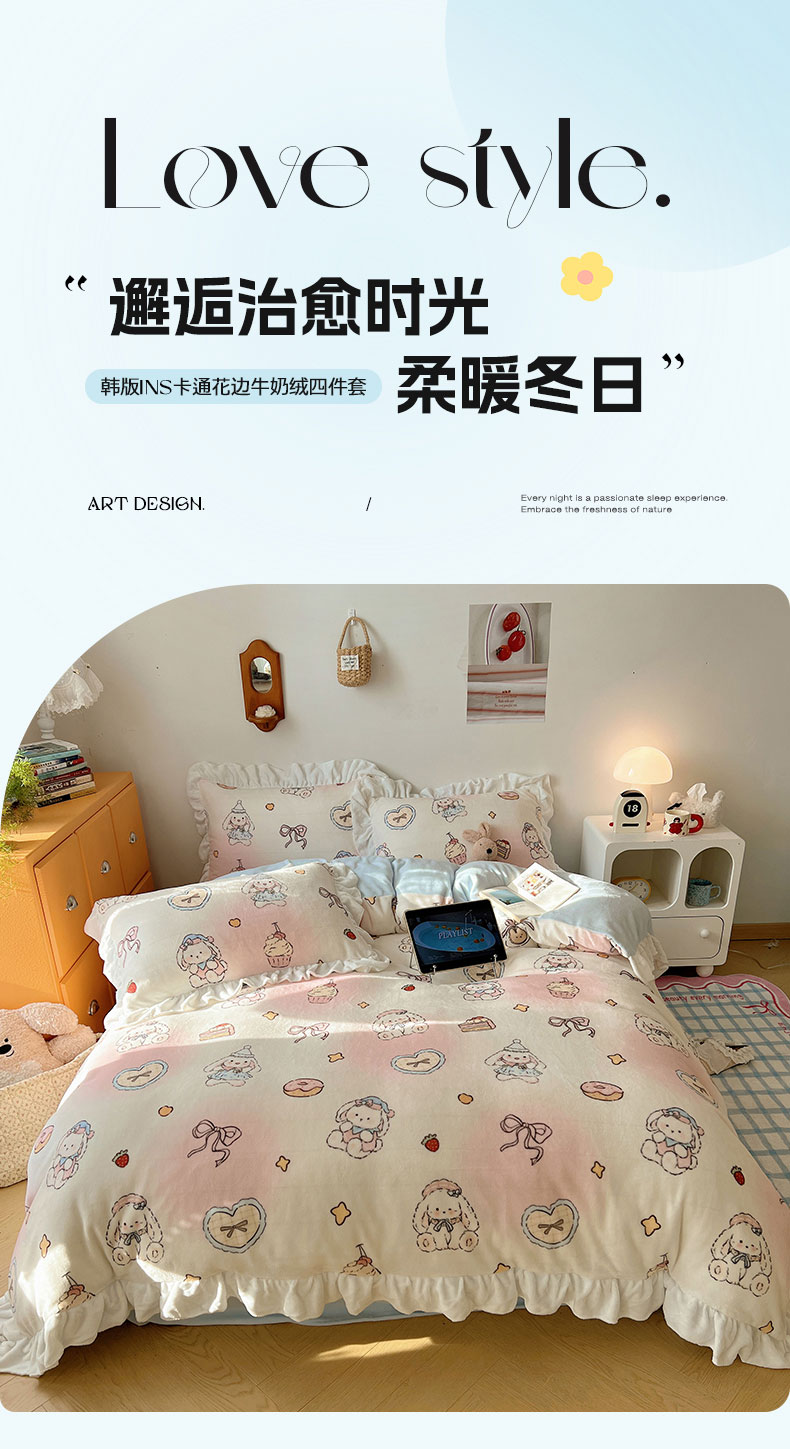 当前位置: 91家纺网 > 商品网购 > 床品套件 > 四件套 > 牛奶绒四件套 > 六巷胡同 2025新款韩式博主风花边款INS卡通牛奶绒四件套(第二系) 花边海派甜心兔
