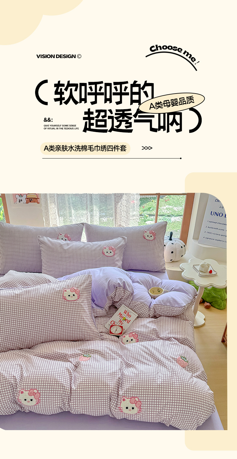 当前位置: 91家纺网 > 商品网购 > 床品套件 > 四件套 > 水洗棉四件套 > 优卡迪家纺馆 2026新款A类亲肤水洗棉毛巾绣系列四件套下载文件包含买家秀 草莓KT-布丁紫
