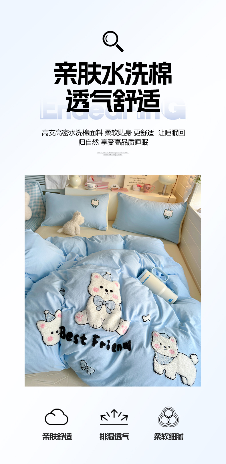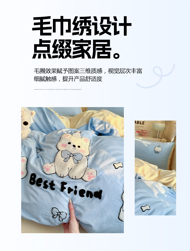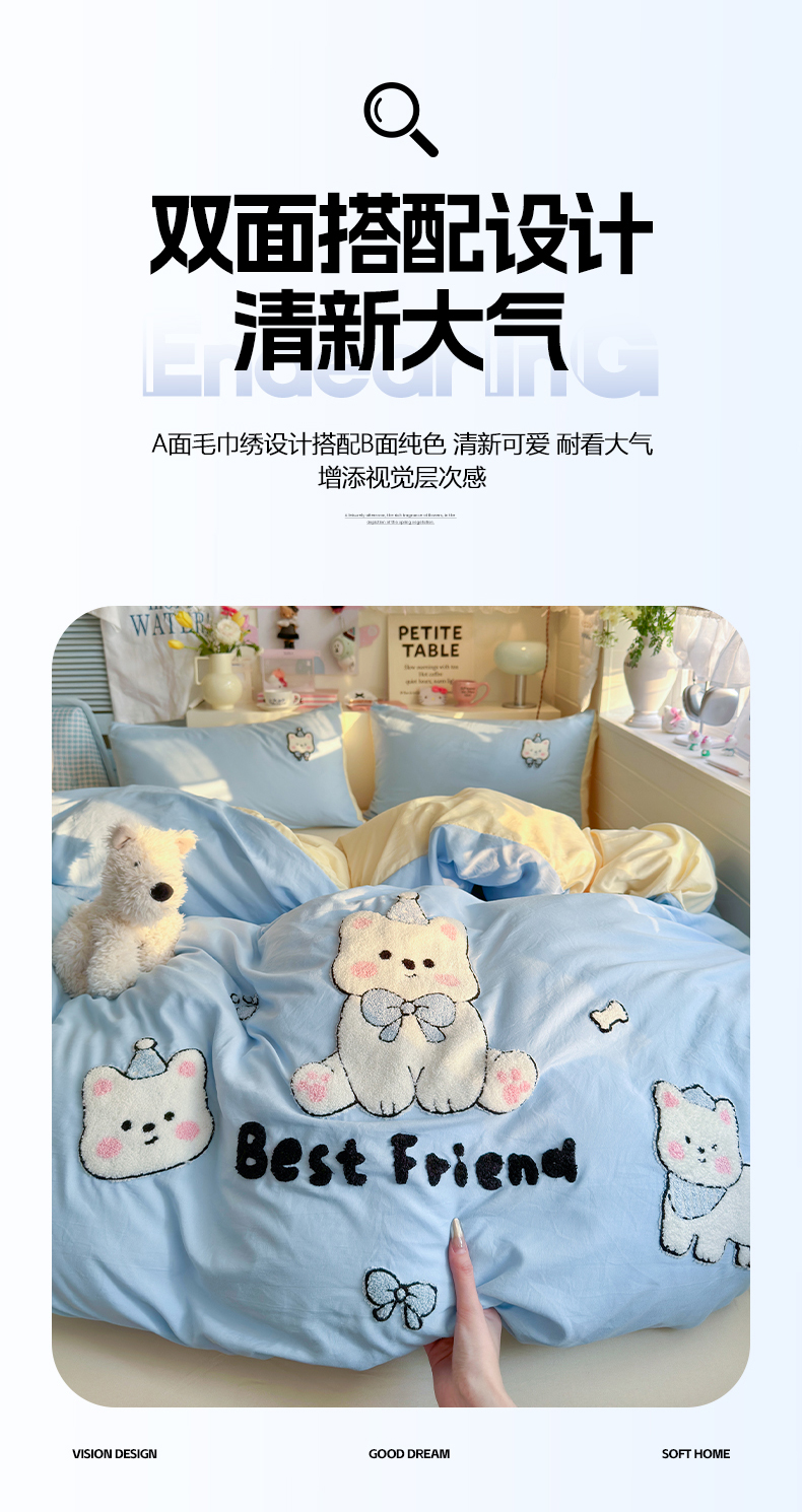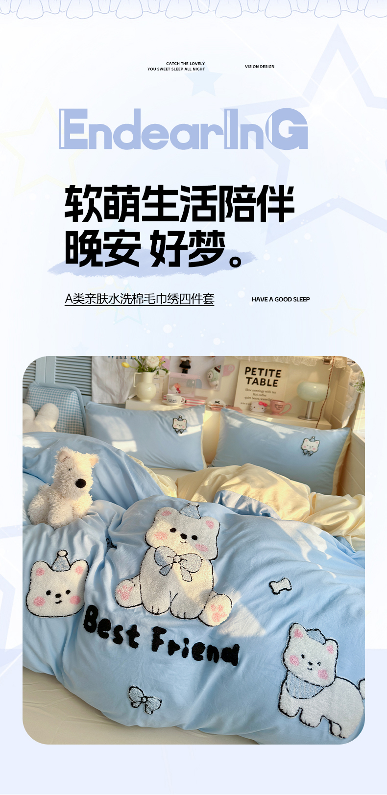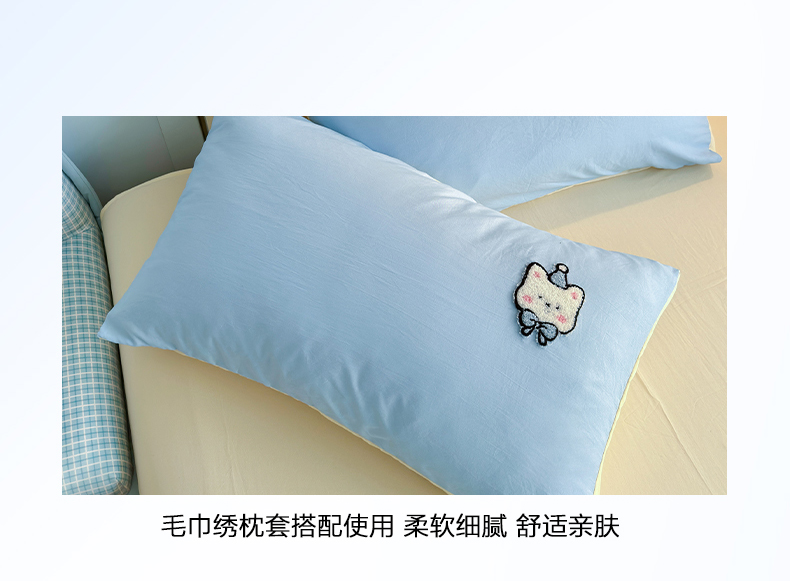 当前位置: 91家纺网 > 商品网购 > 床品套件 > 四件套 > 水洗棉四件套 > 优卡迪家纺馆 2026新款A类亲肤水洗棉毛巾绣系列四件套下载文件包含买家秀 软萌西高-天蓝