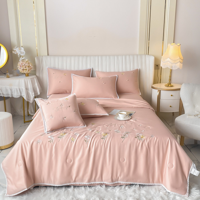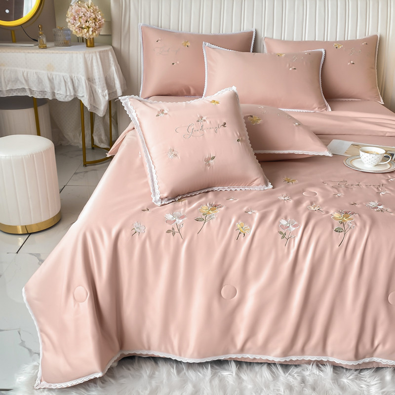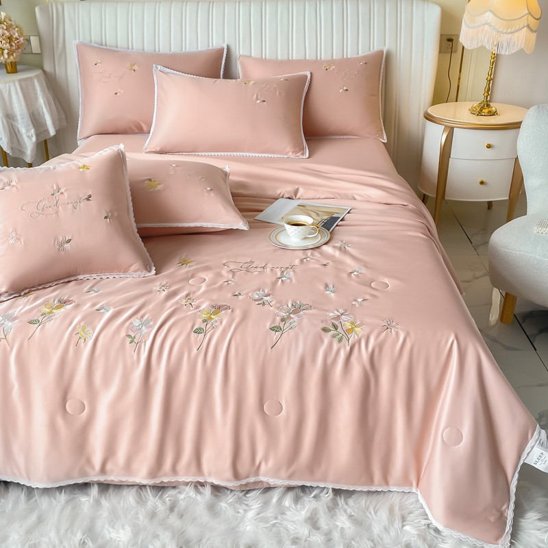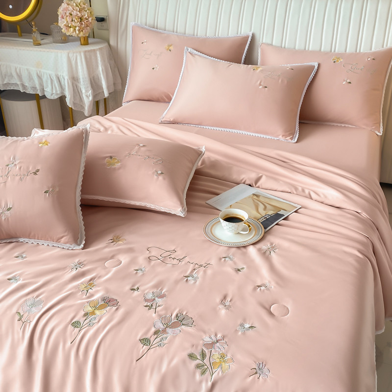安妮家居 2022新款水洗真丝夏被四件套 蕾丝裸粉