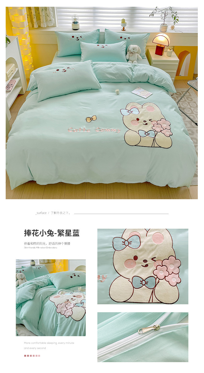 2024秋冬亲肤水洗棉贴布绣四件套-捧花小兔系列 捧花小兔-繁星蓝
