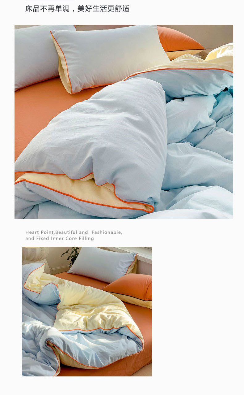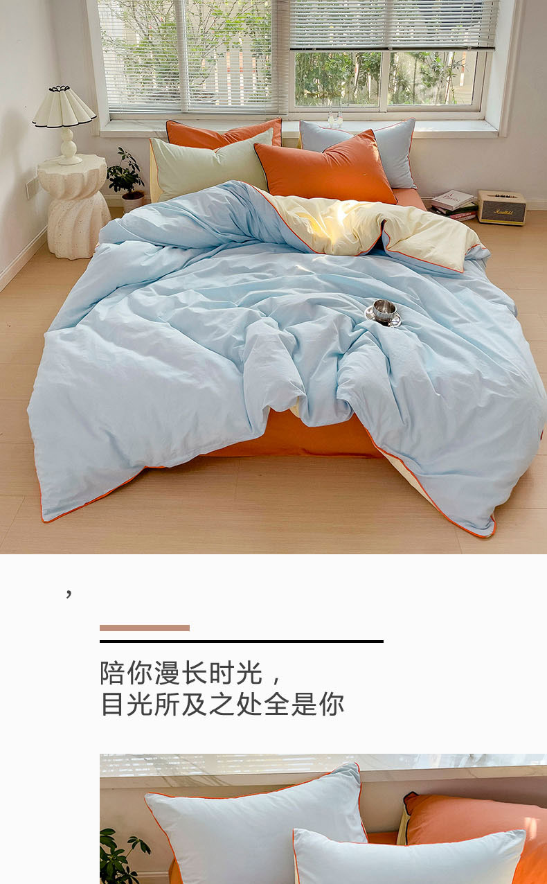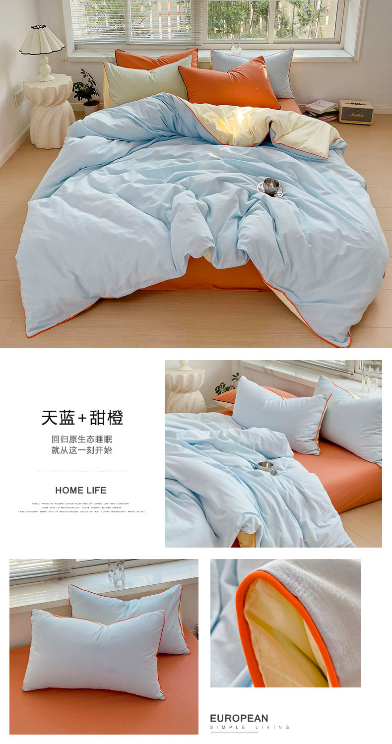 当前位置: 91家纺网 > 商品网购 > 床品套件 > 四件套 > 全棉普通四件套 > 梦家居 2024新款全棉水洗棉纯色滚边四件套 天蓝+甜橙