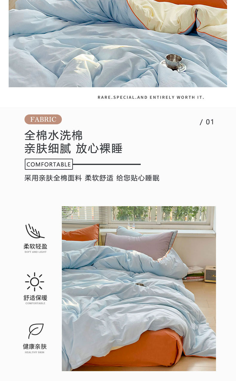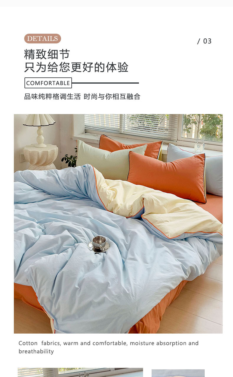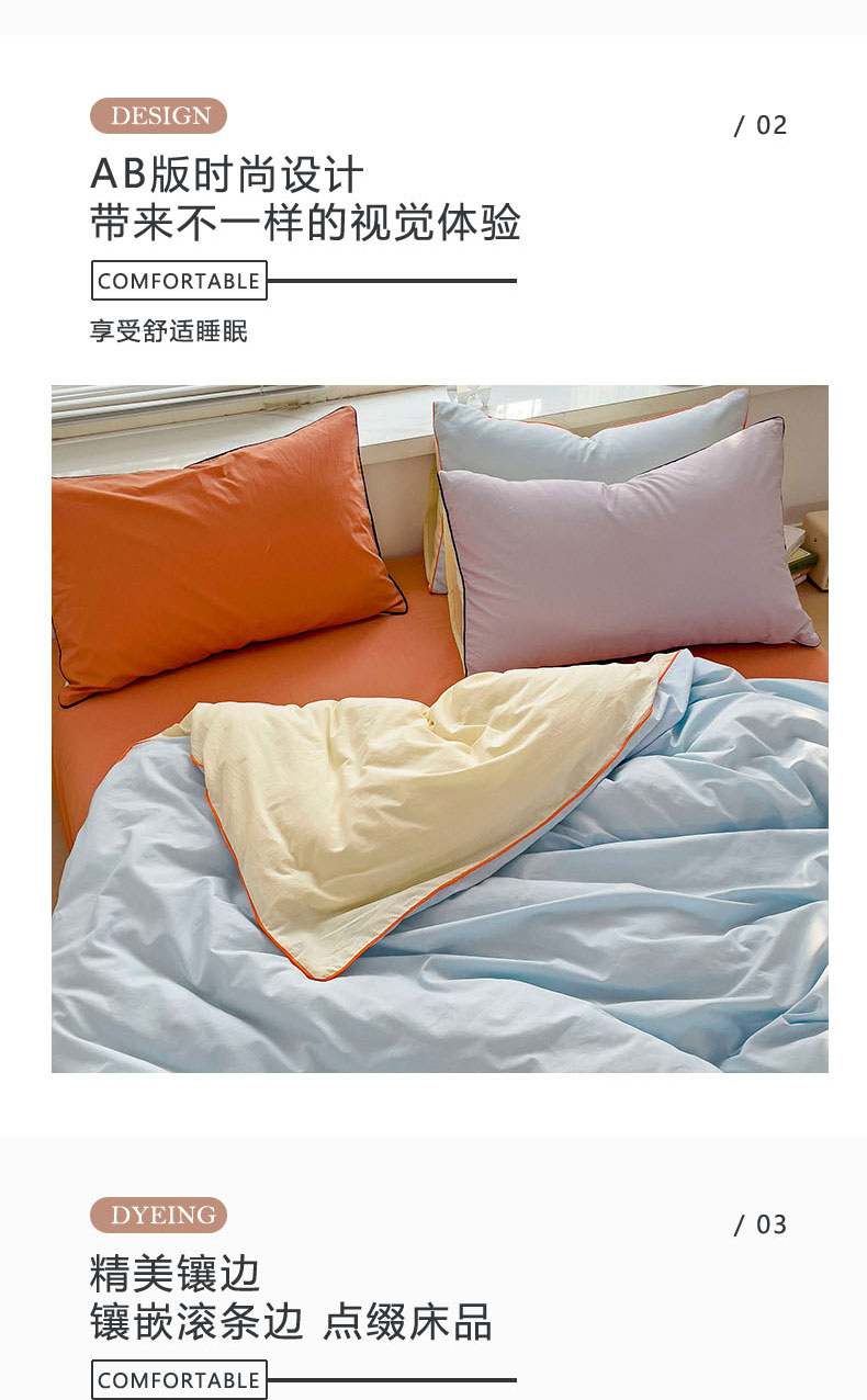 当前位置: 91家纺网 > 商品网购 > 床品套件 > 四件套 > 全棉普通四件套 > 梦家居 2024新款全棉水洗棉纯色滚边四件套 天蓝+甜橙