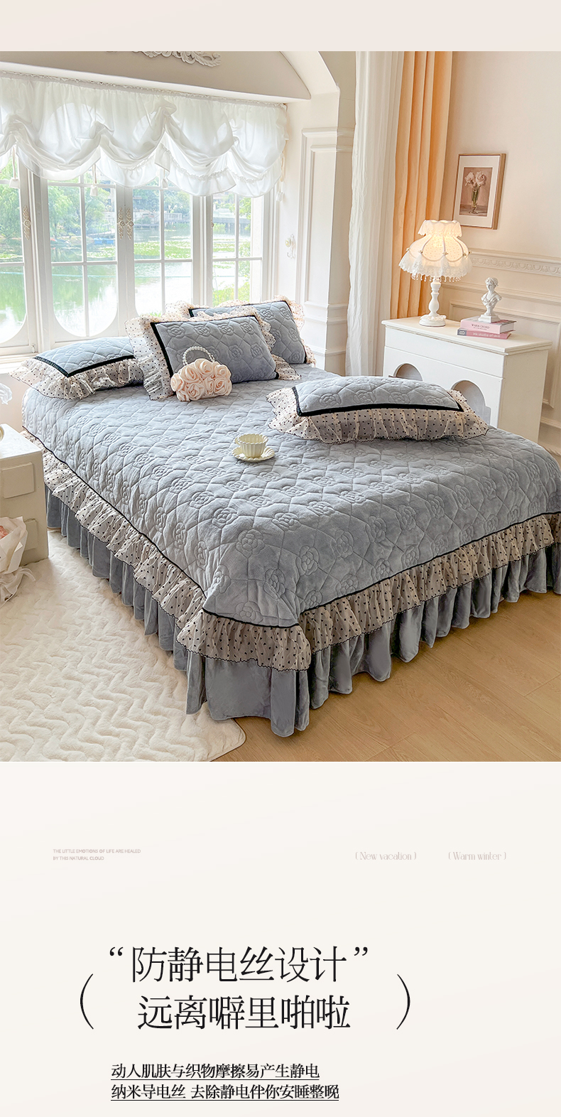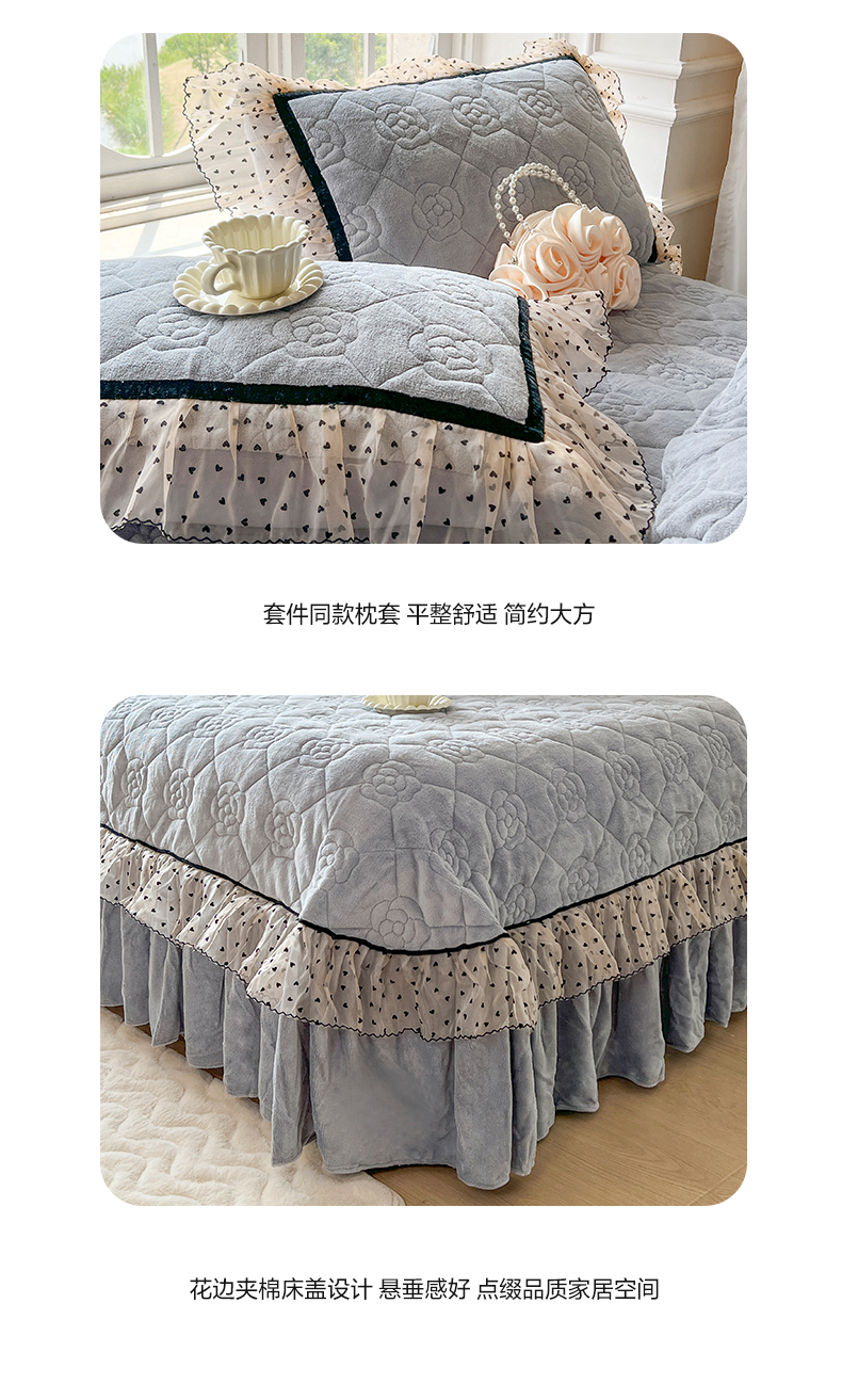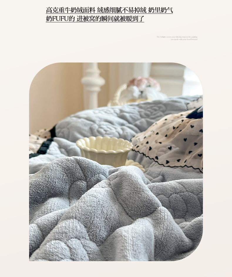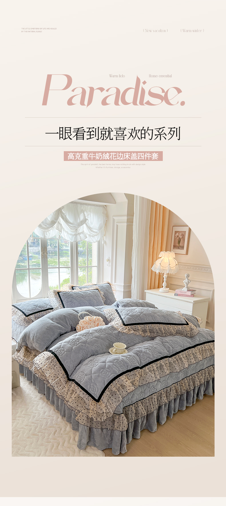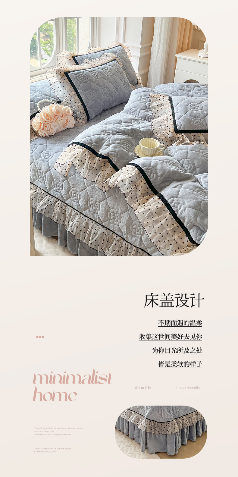麒豆豆 2024新款高克重时尚花边牛奶绒四件套床盖款-诺蔓 诺蔓-浅灰