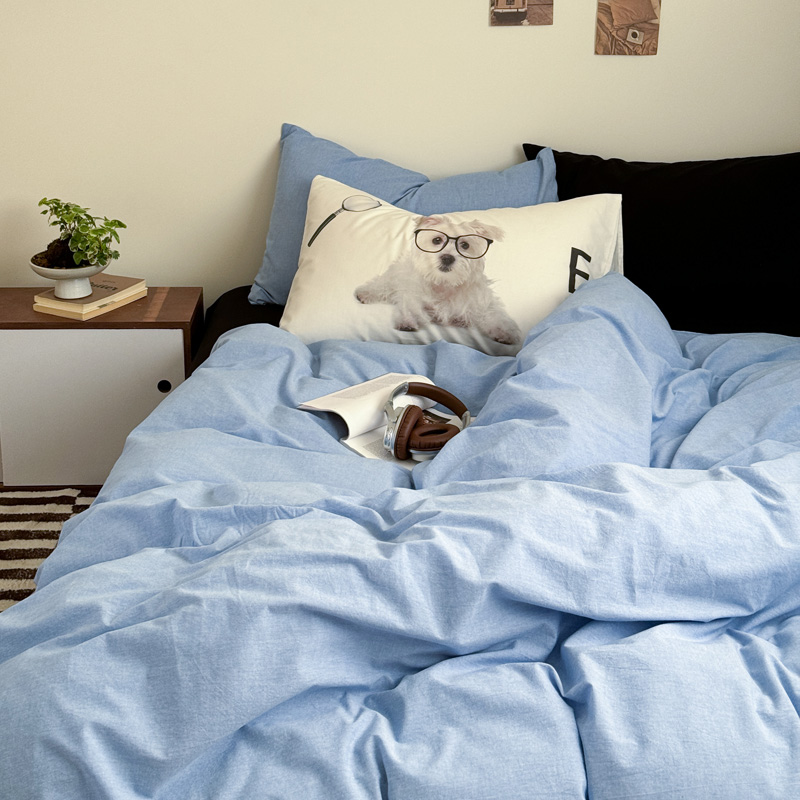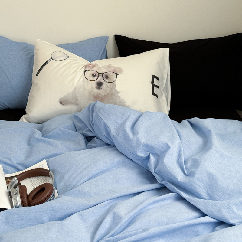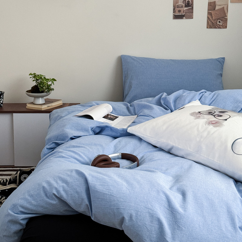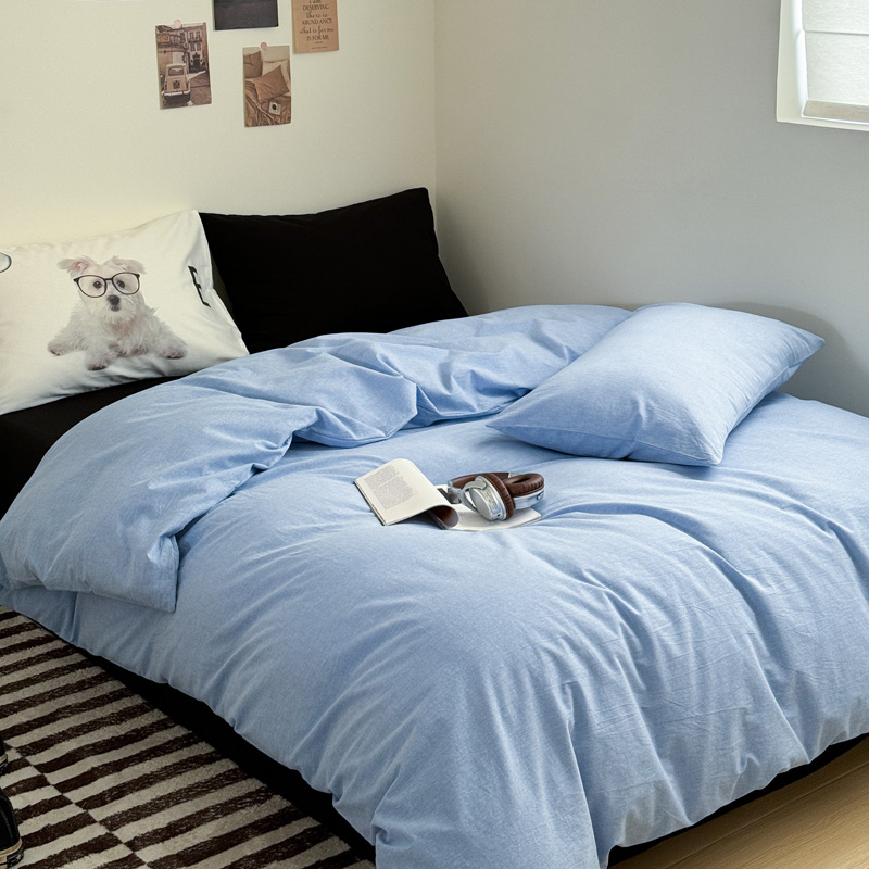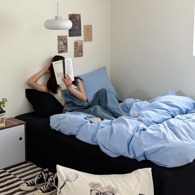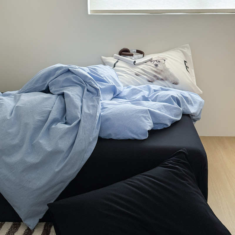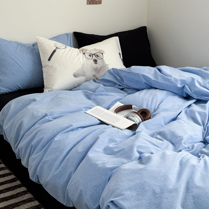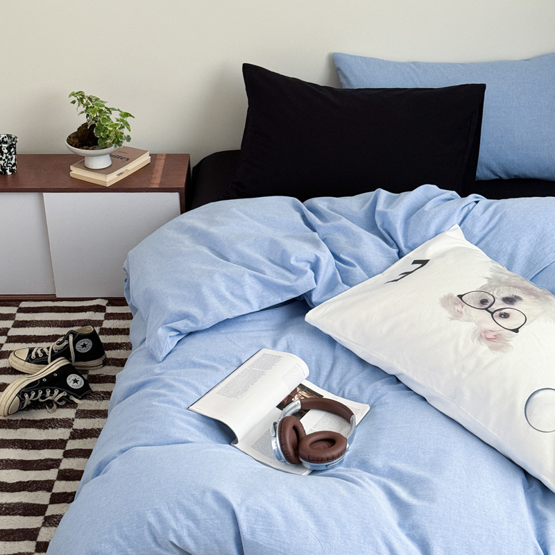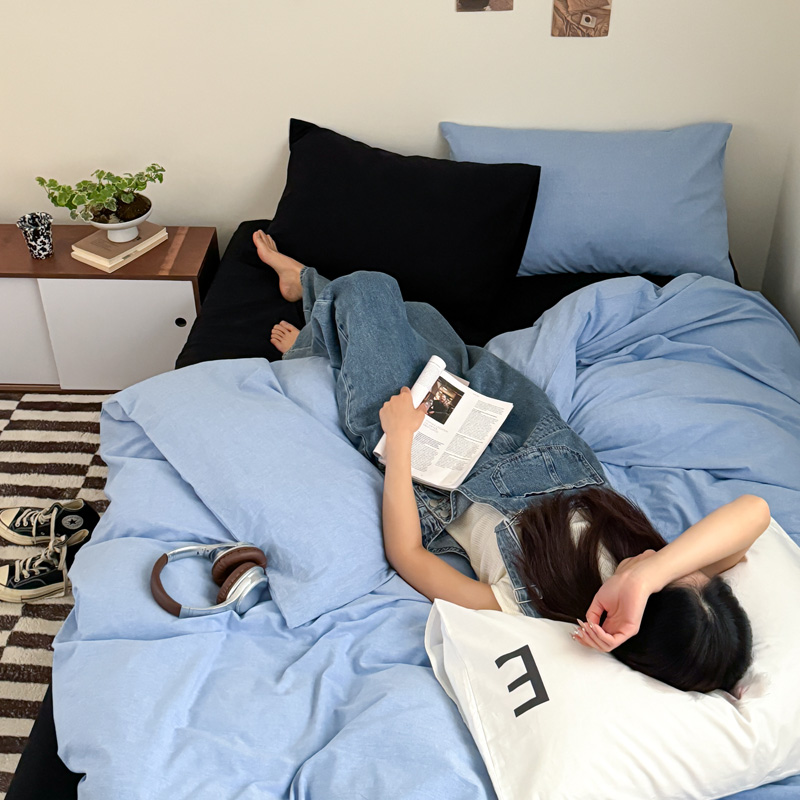 当前位置: 91家纺网 > 商品网购 > 床品套件 > 四件套 > 全棉普通四件套 > 艾沁家纺 2024新款简约风全棉色织水洗棉混搭四件套 天蓝+黑(黑色枕+印花枕)