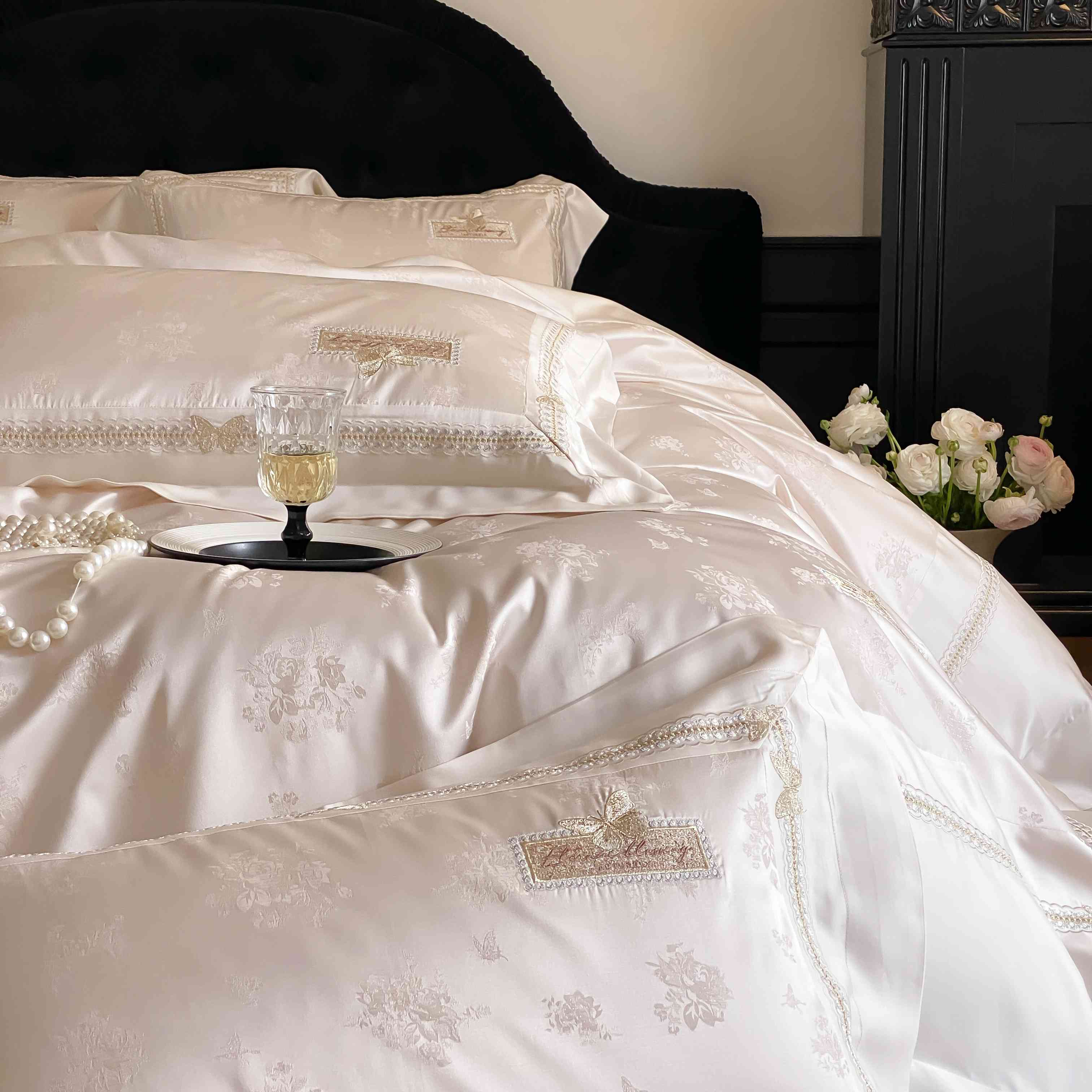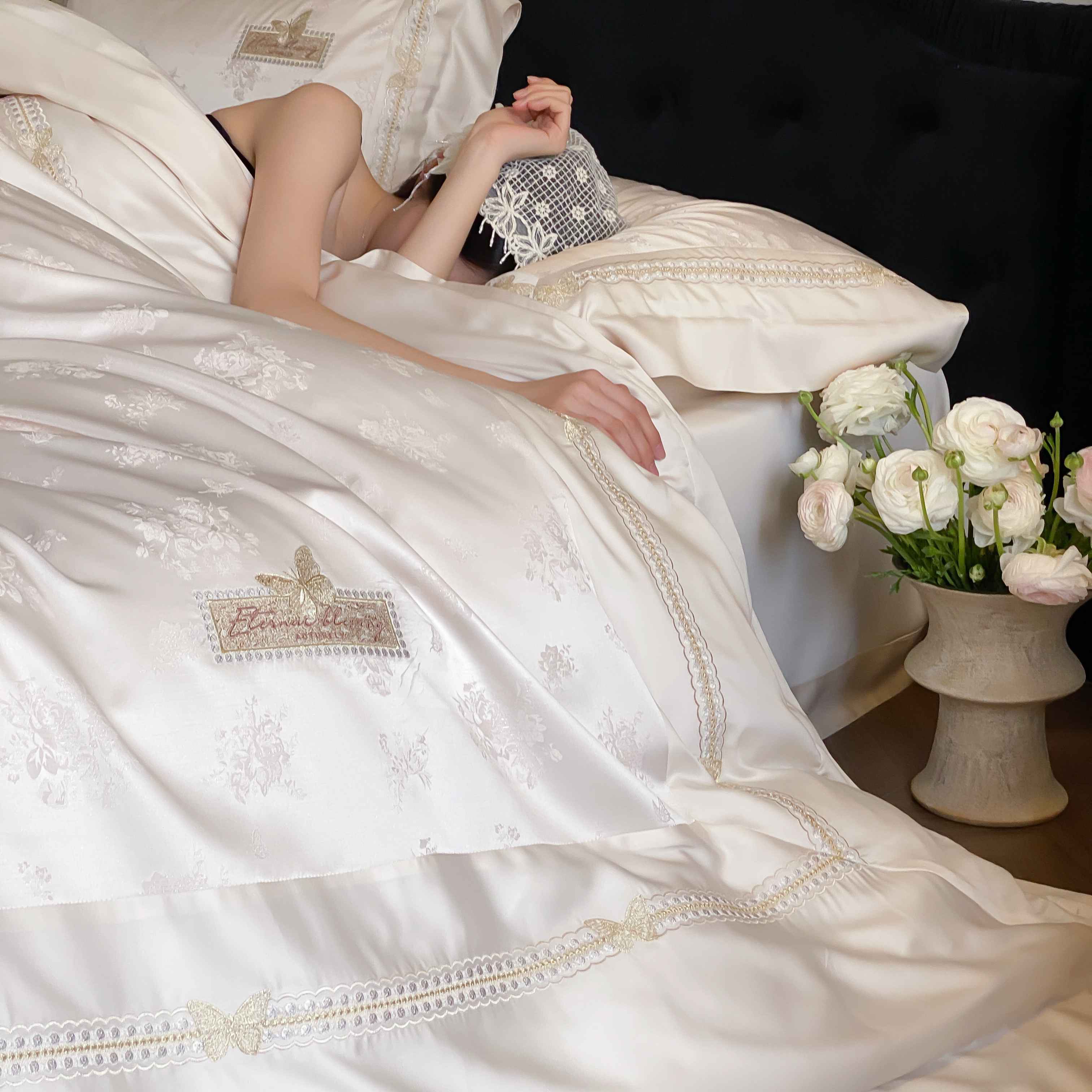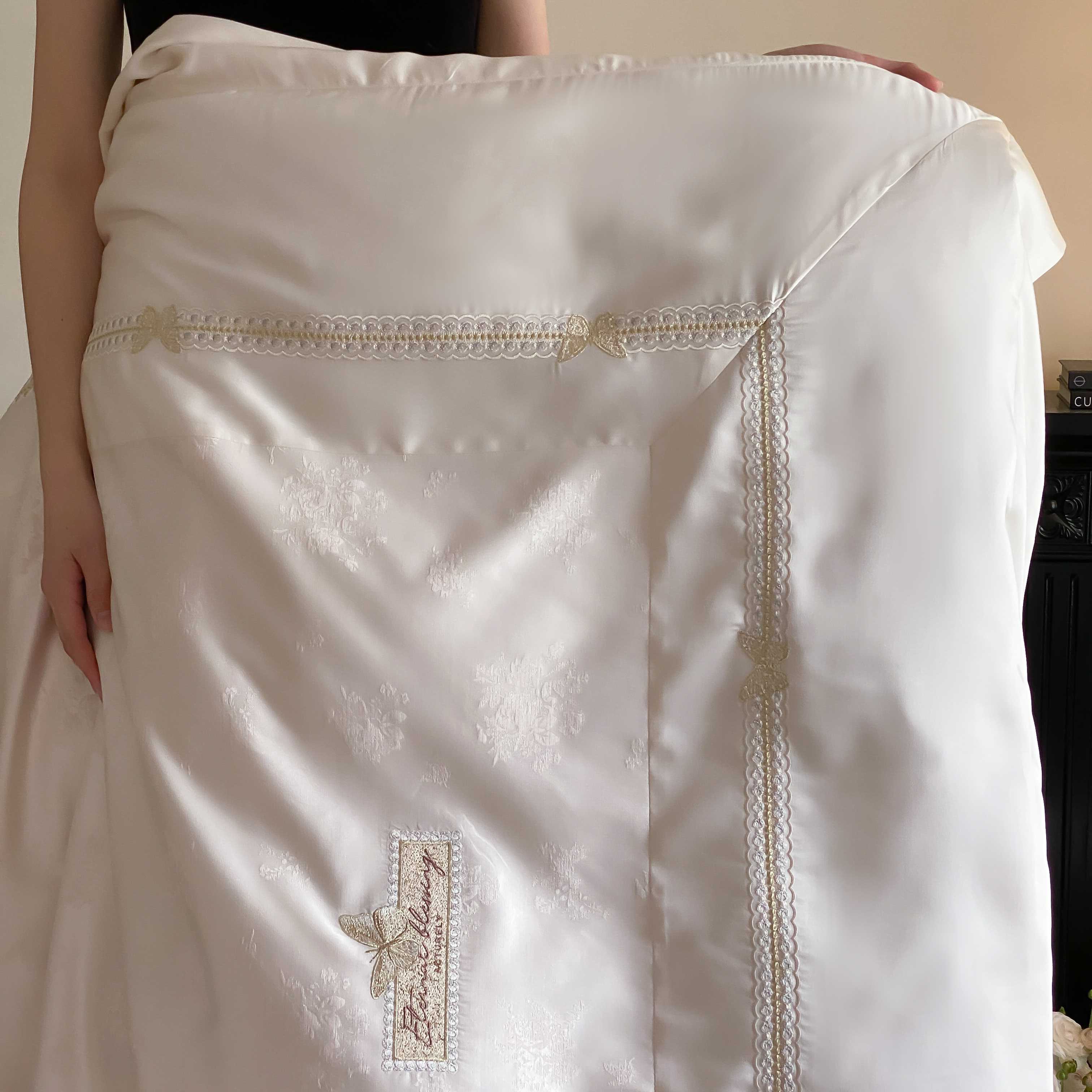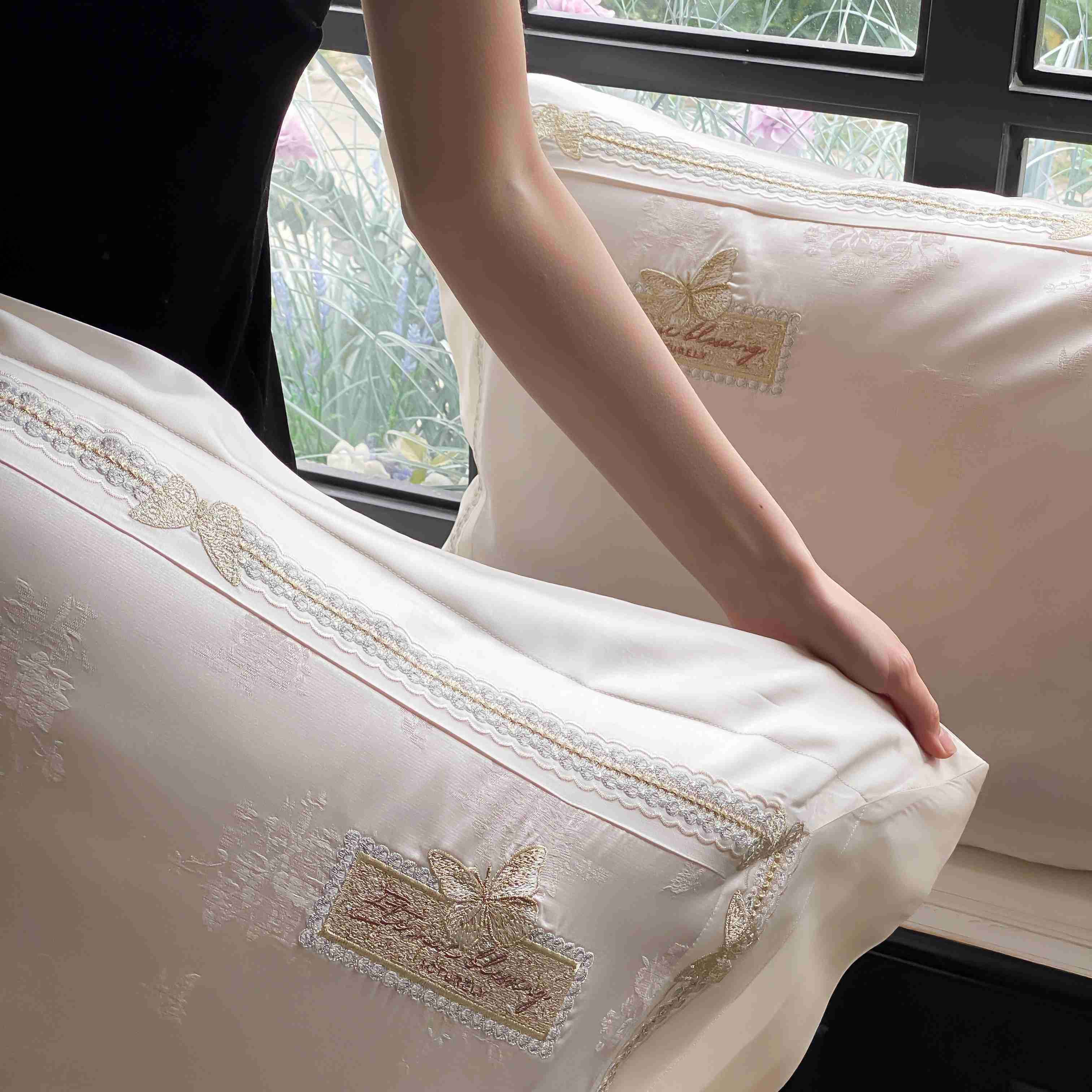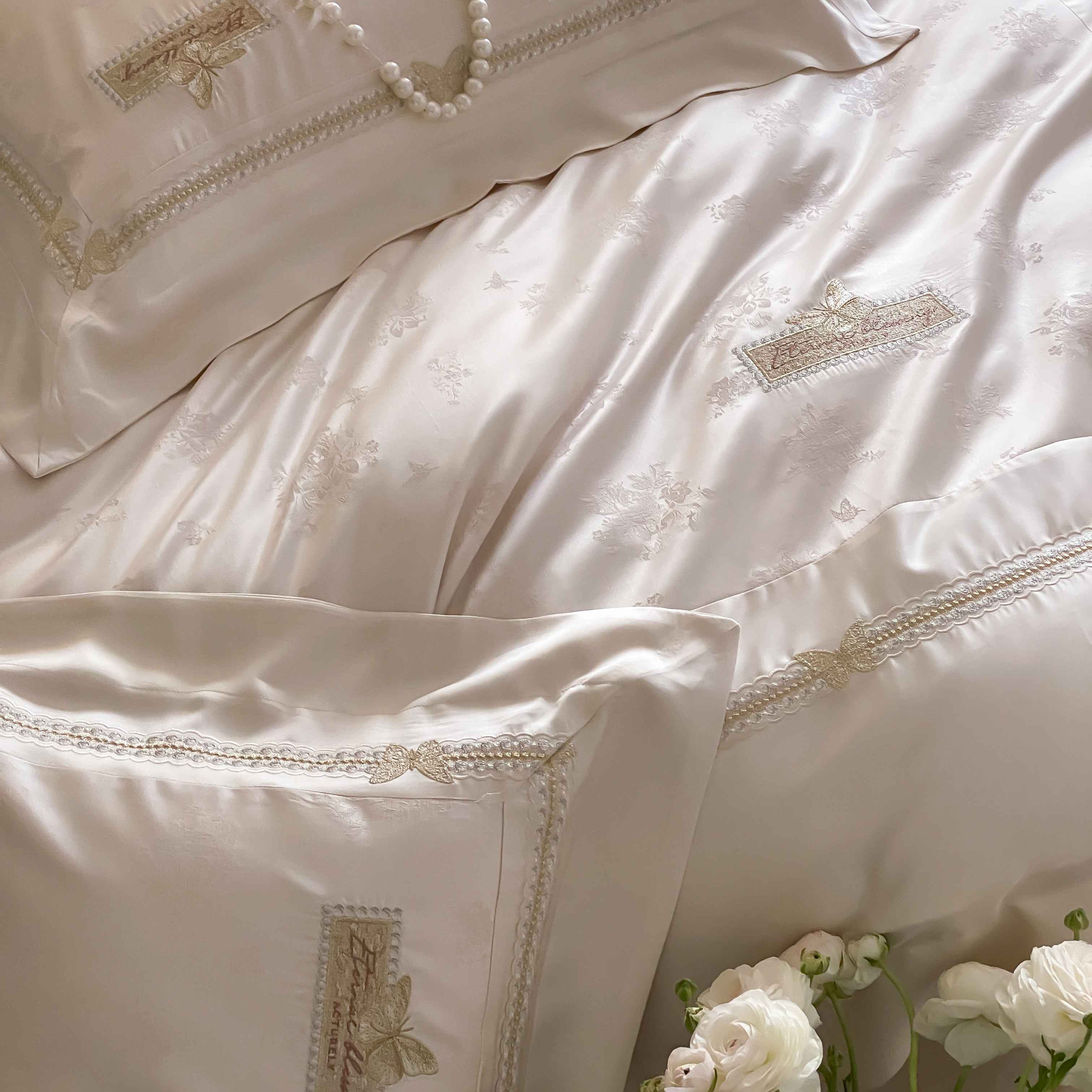 商品名称:太古汇家居 2025新款兰精天丝高精密提花-绣花“花间蝶影”系列 花间蝶影-香槟