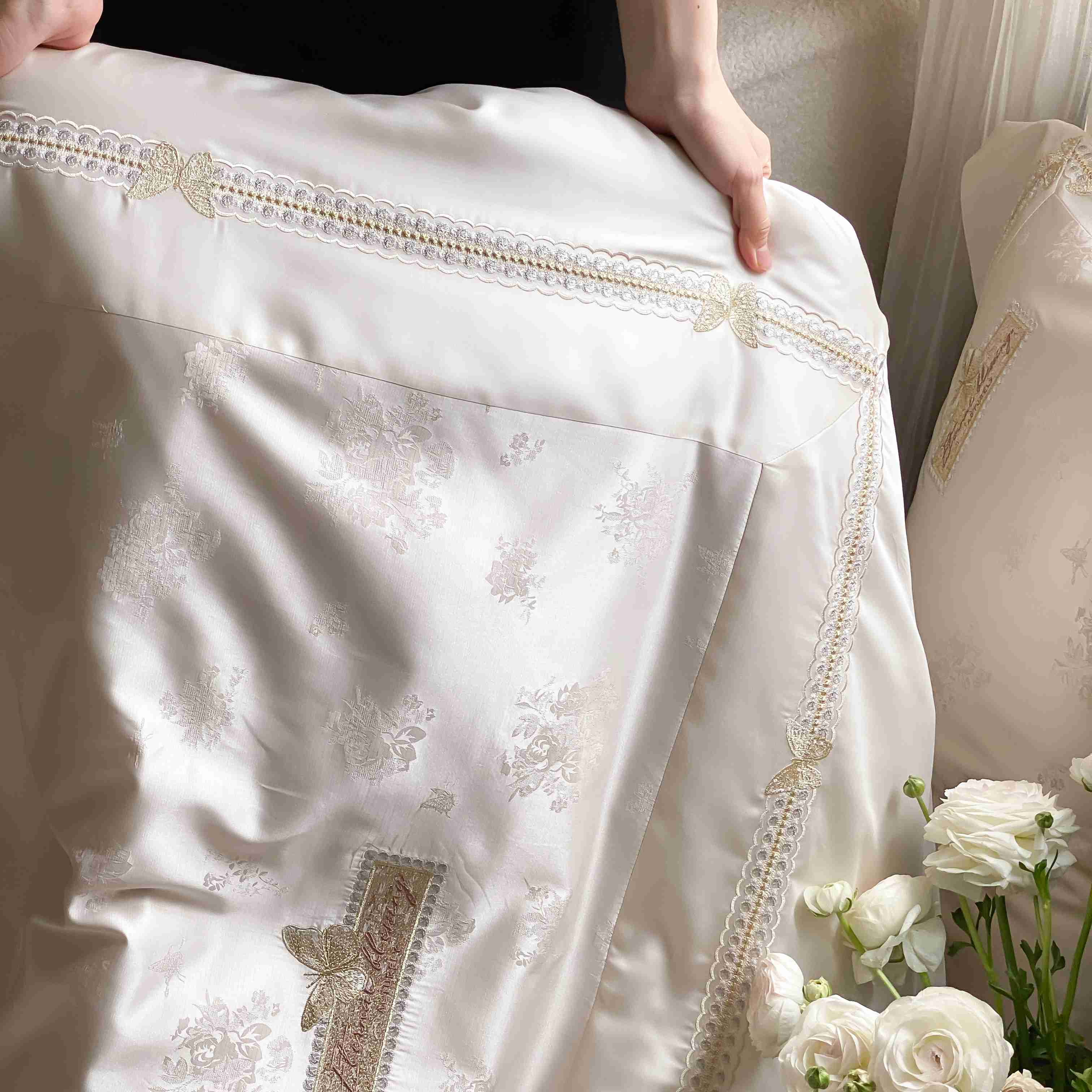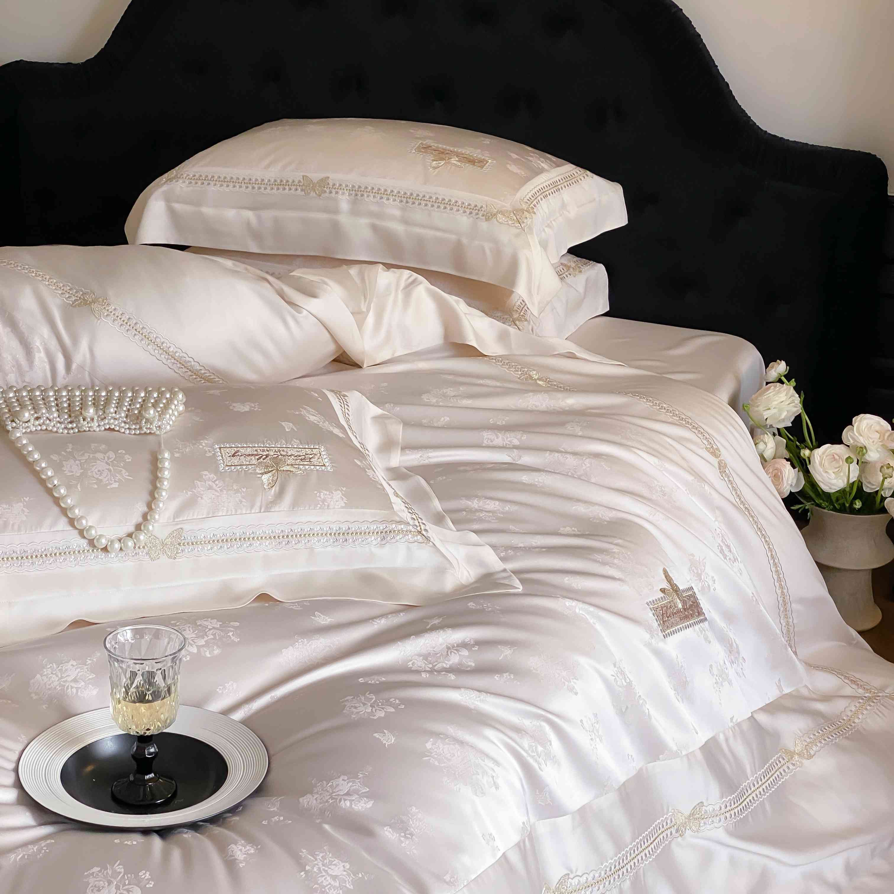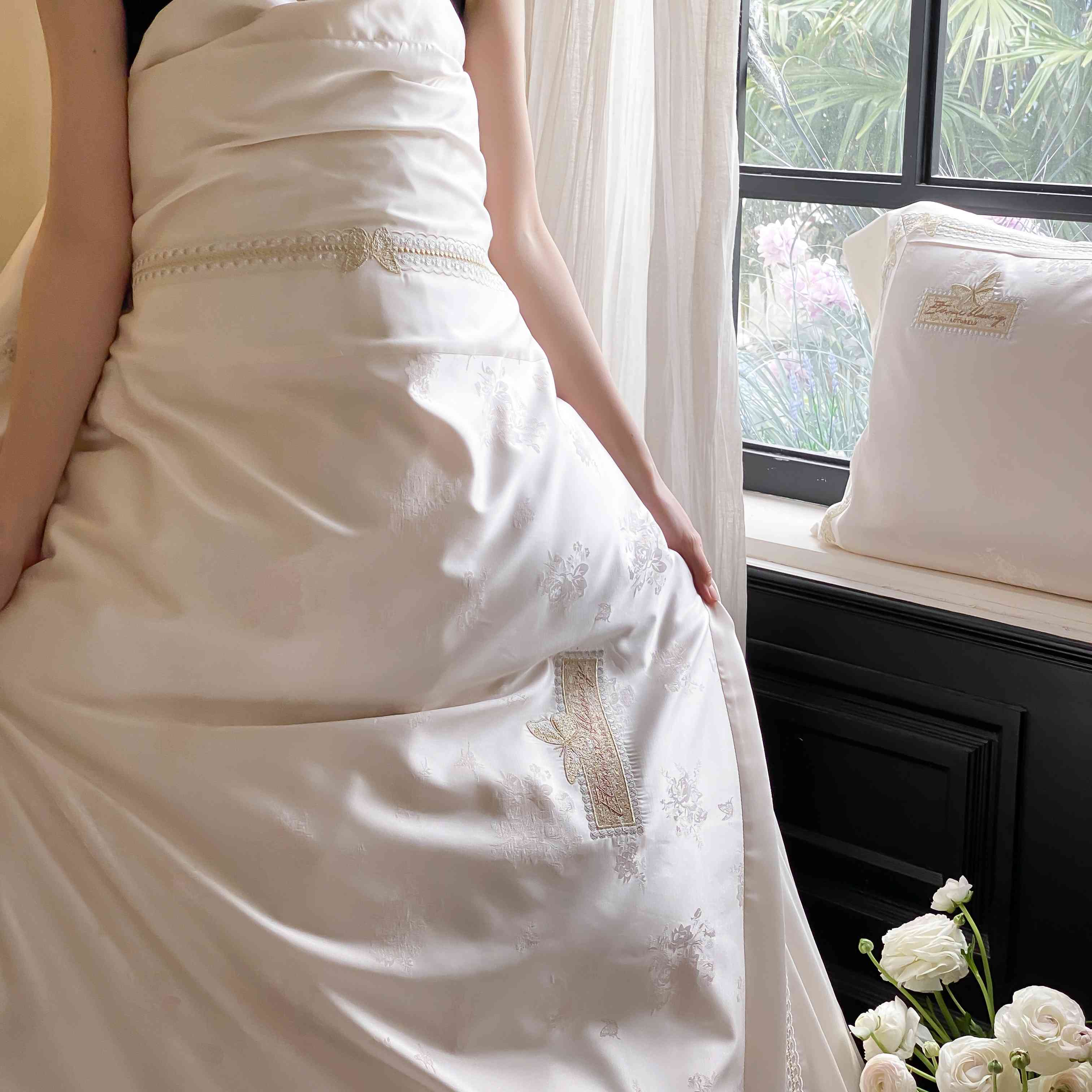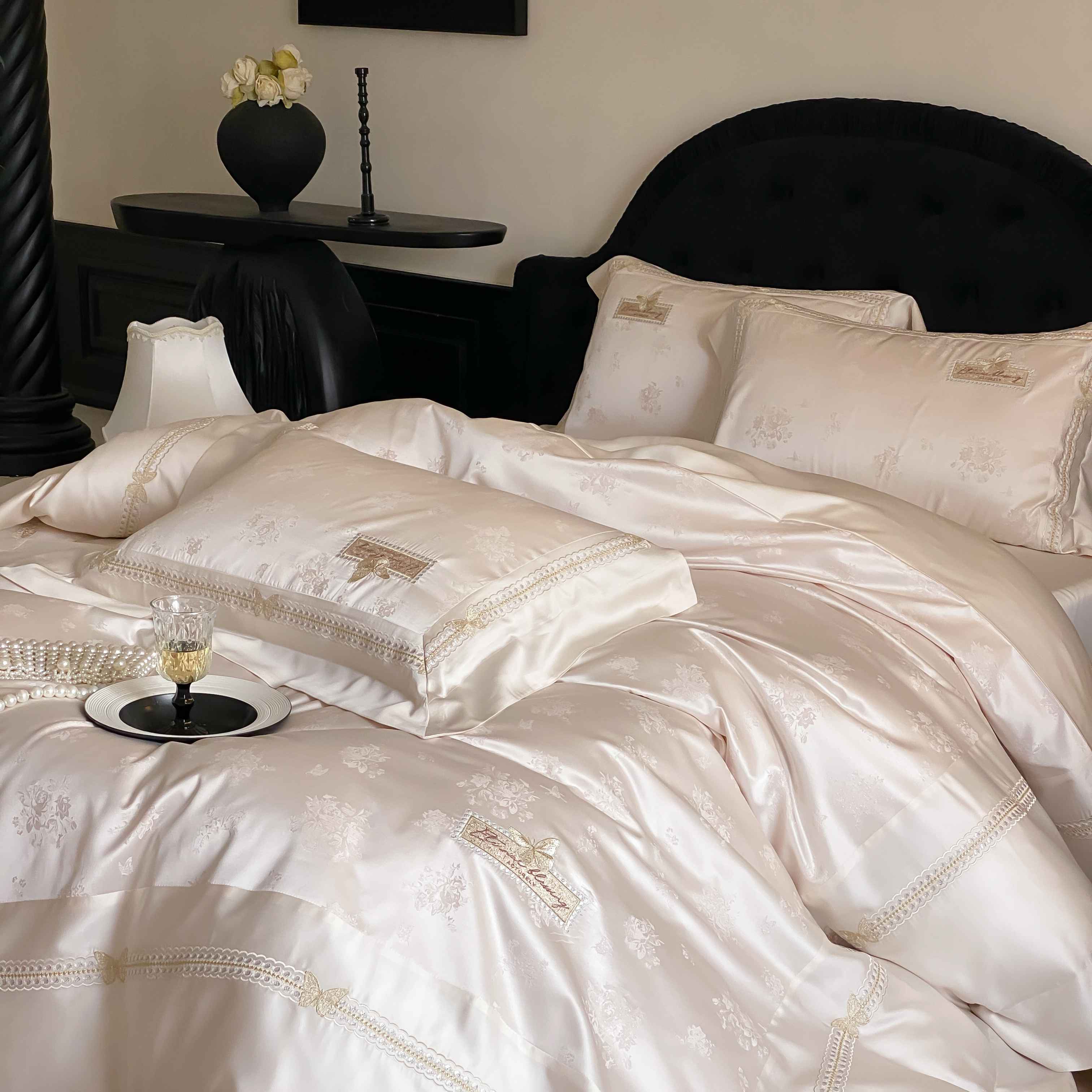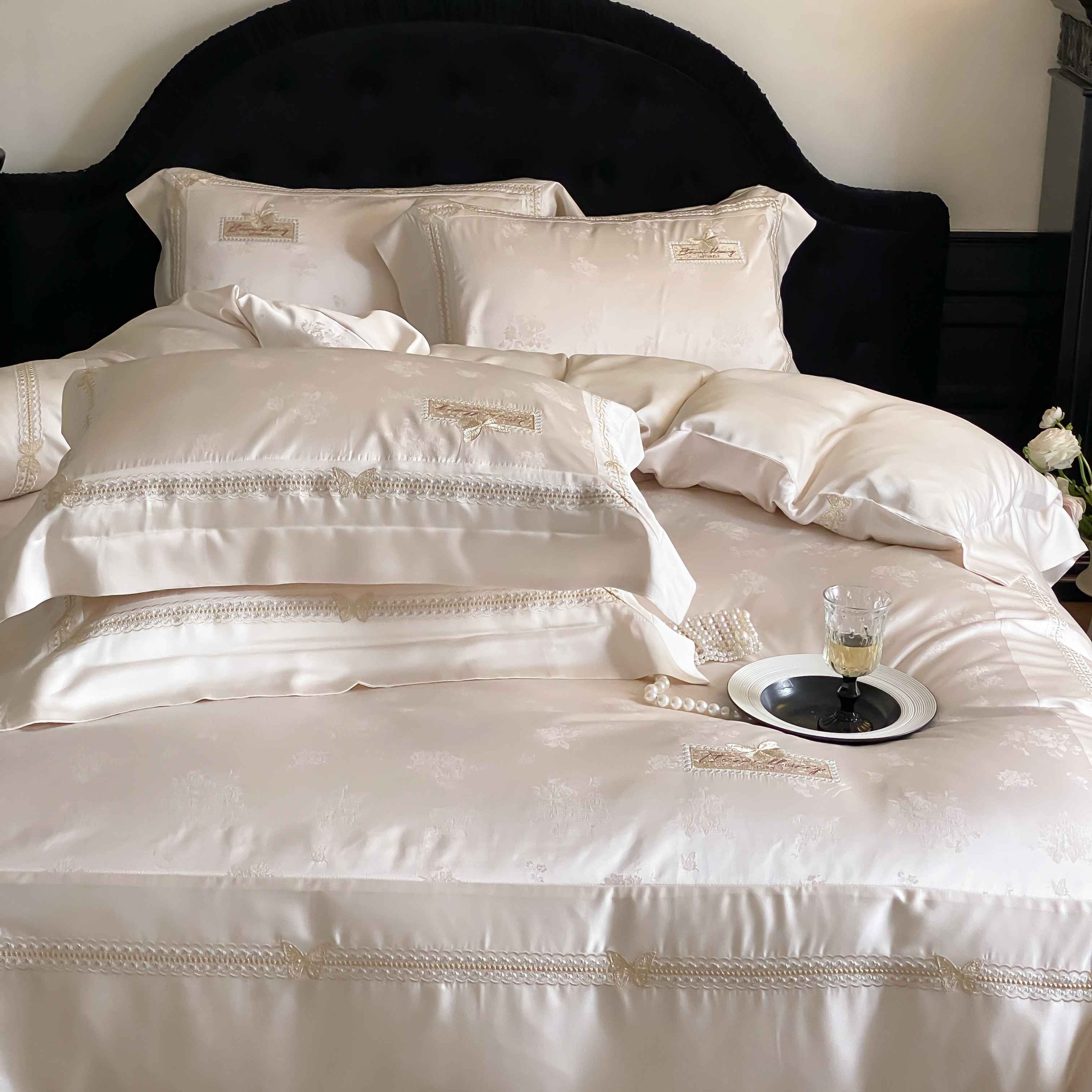 商品名称:太古汇家居 2025新款兰精天丝高精密提花-绣花“花间蝶影”系列 花间蝶影-香槟