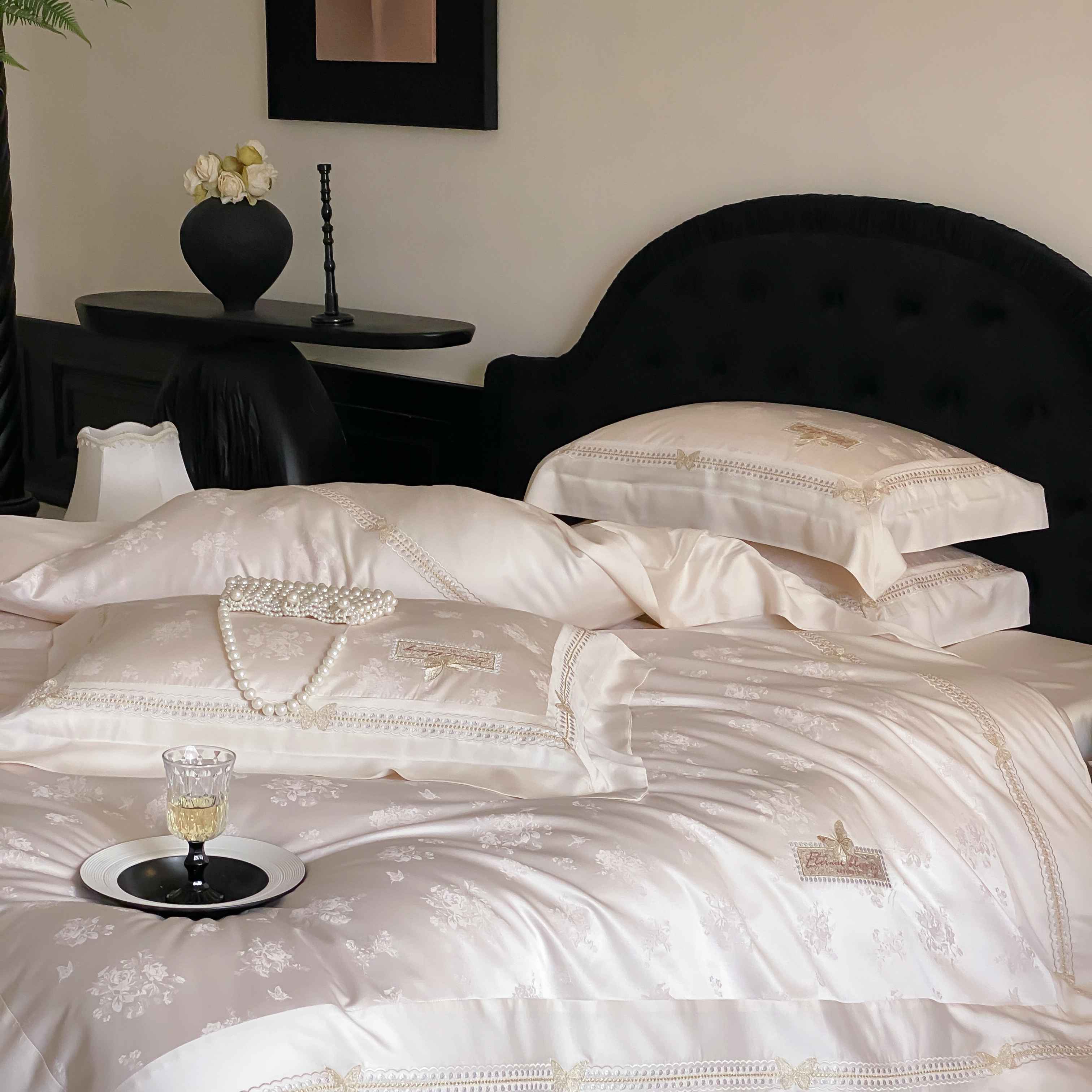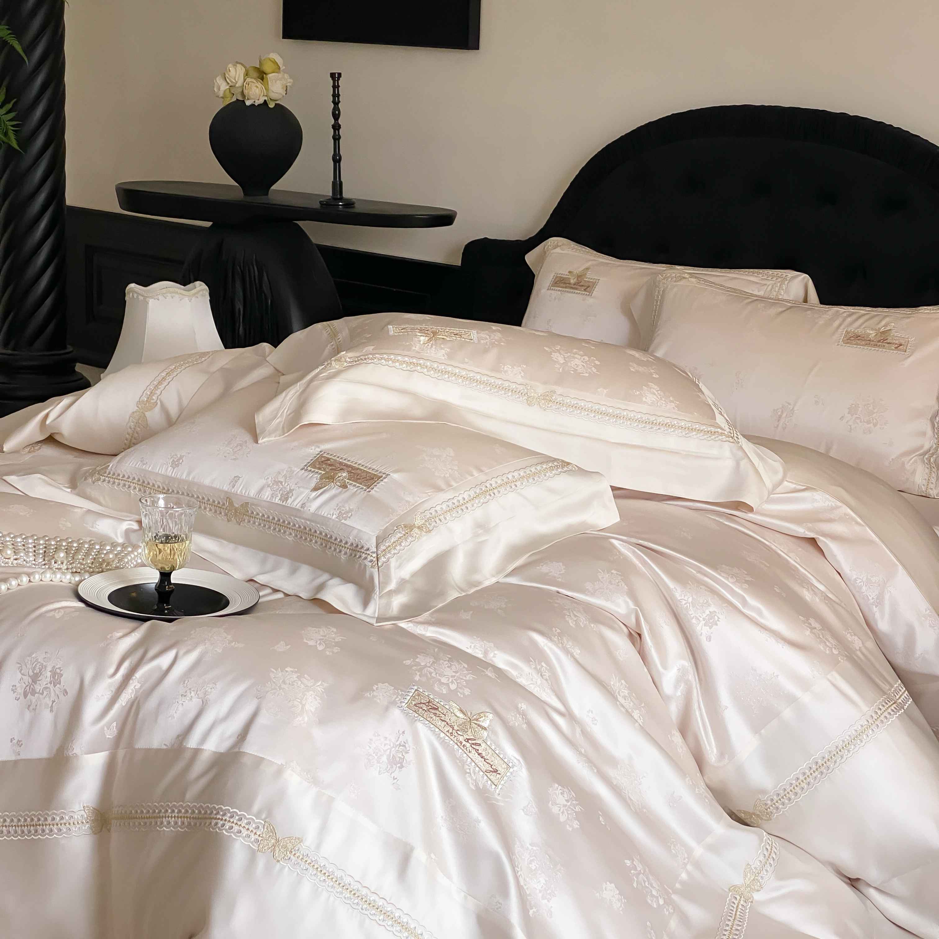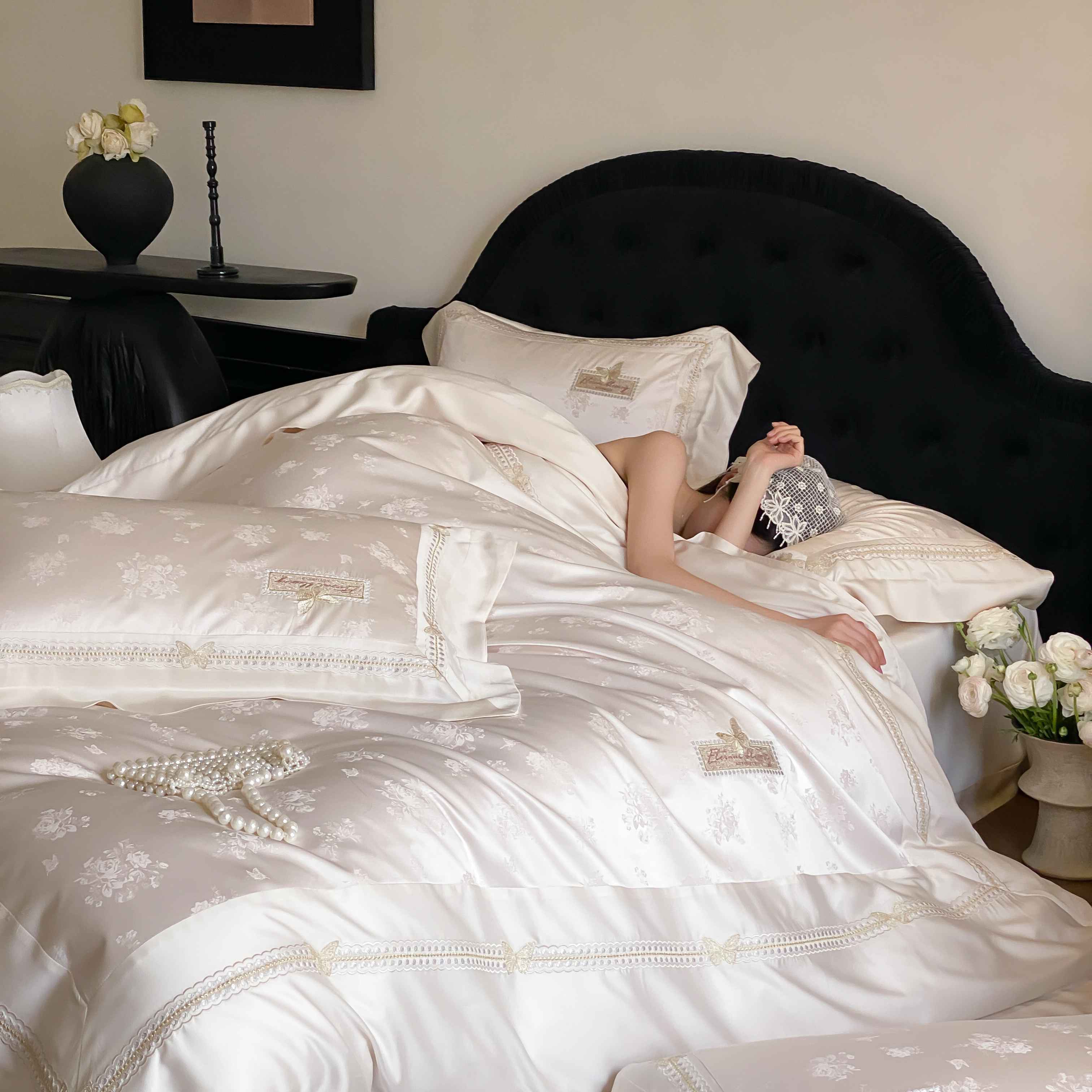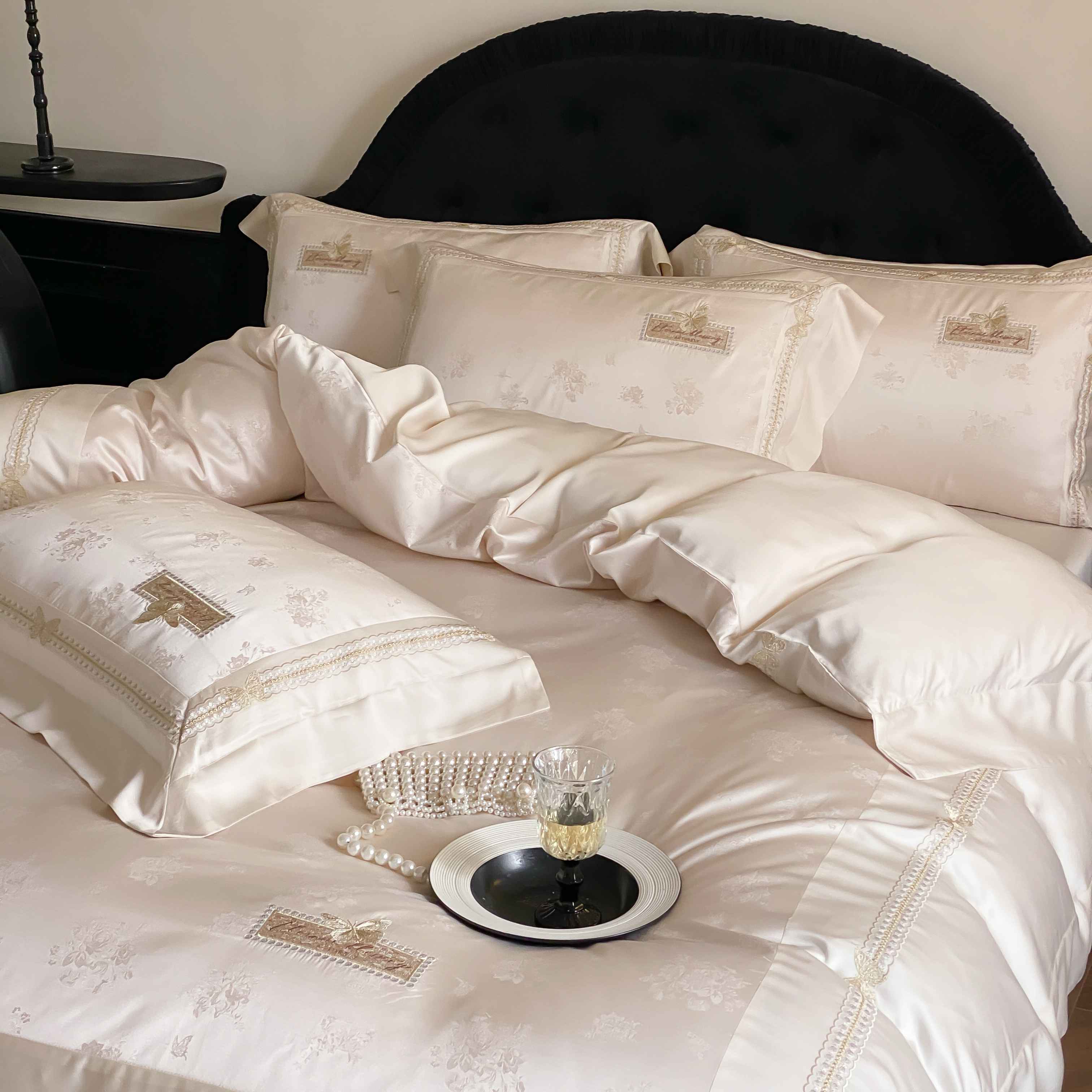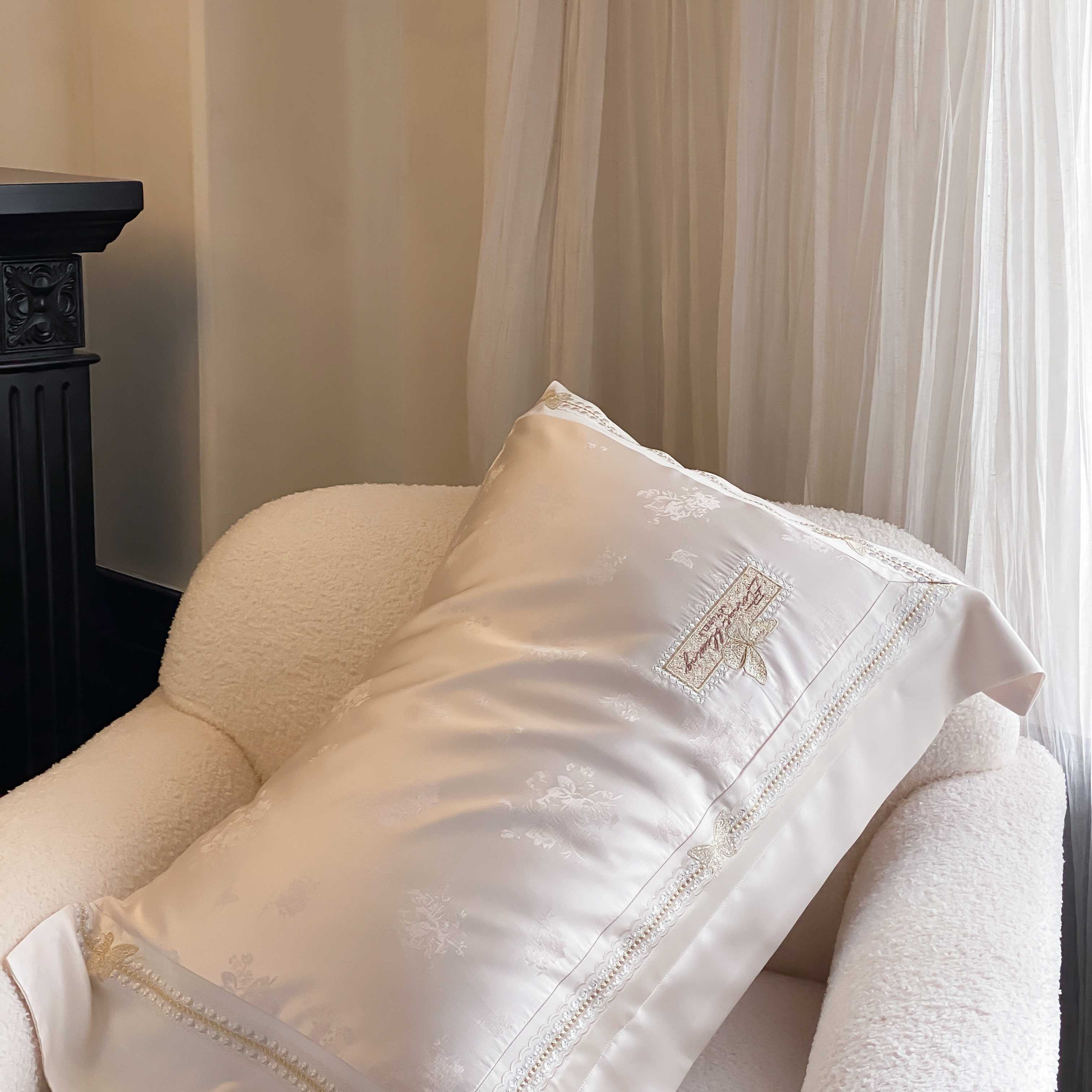 商品名称:太古汇家居 2025新款兰精天丝高精密提花-绣花“花间蝶影”系列 花间蝶影-香槟