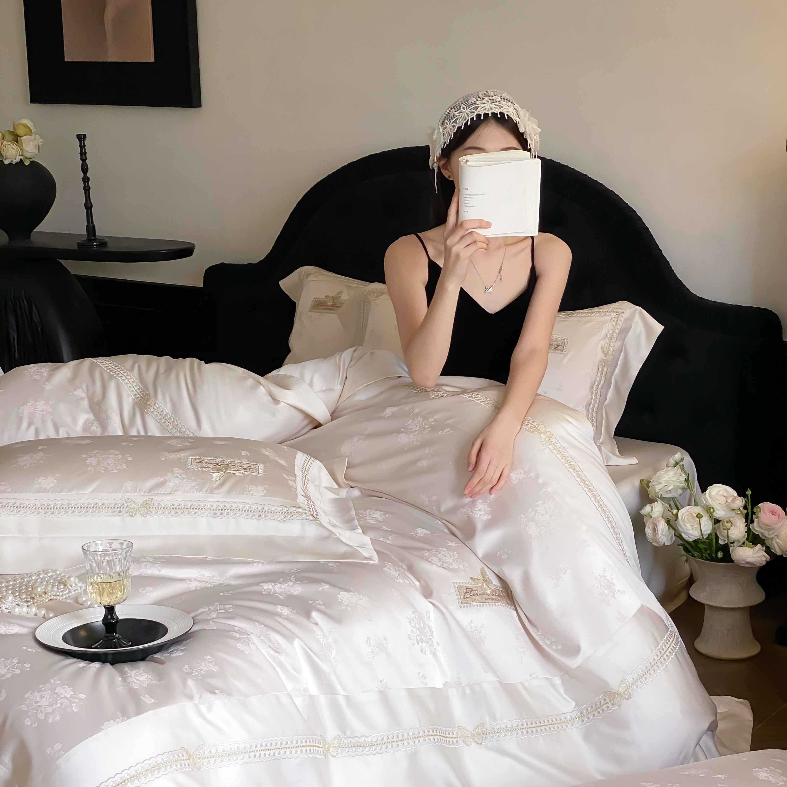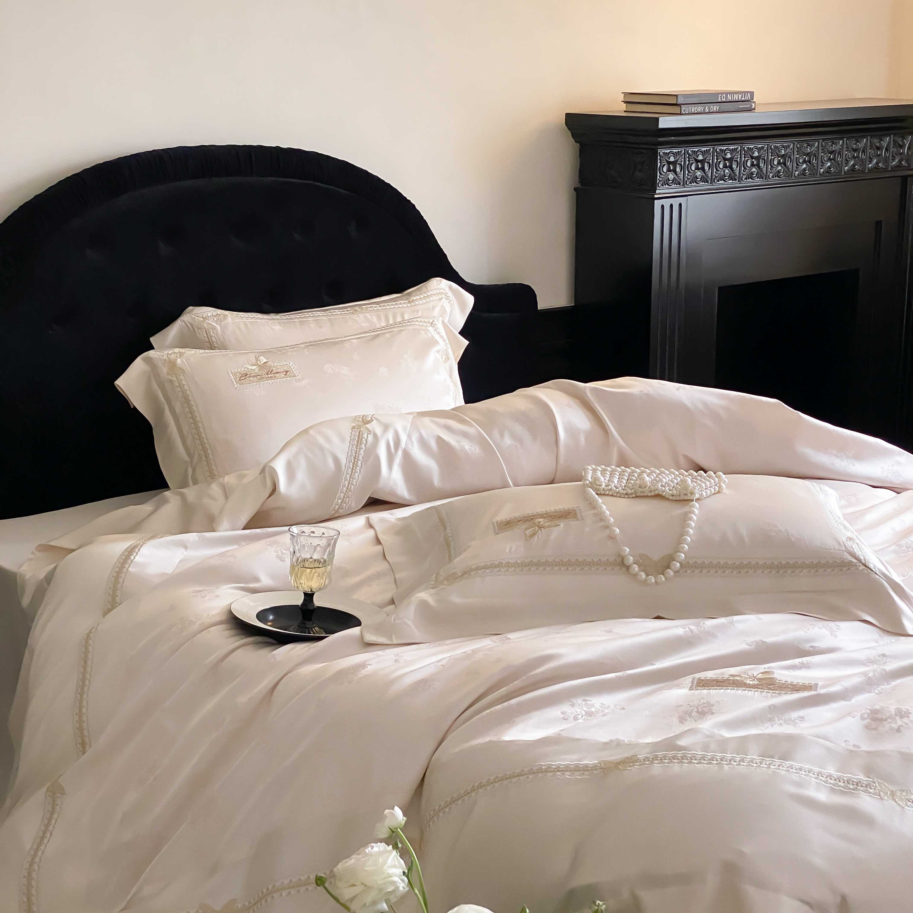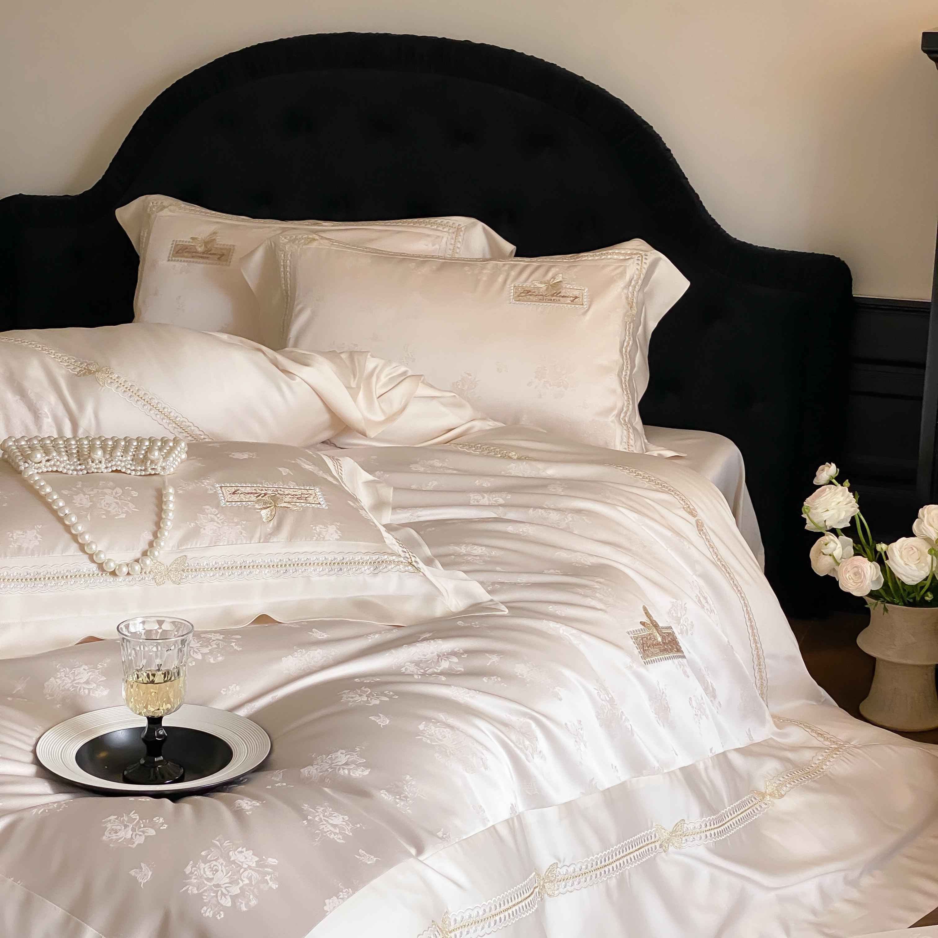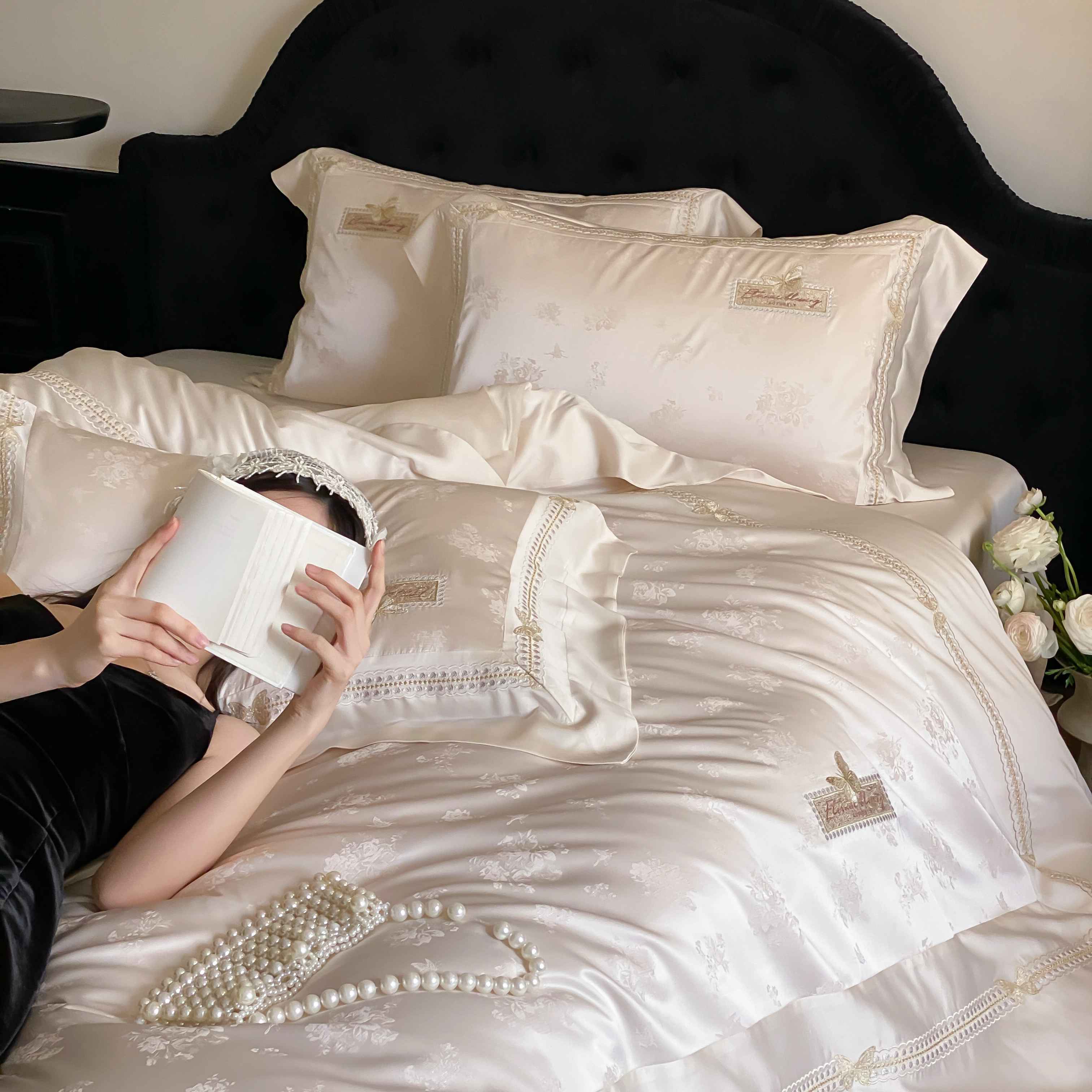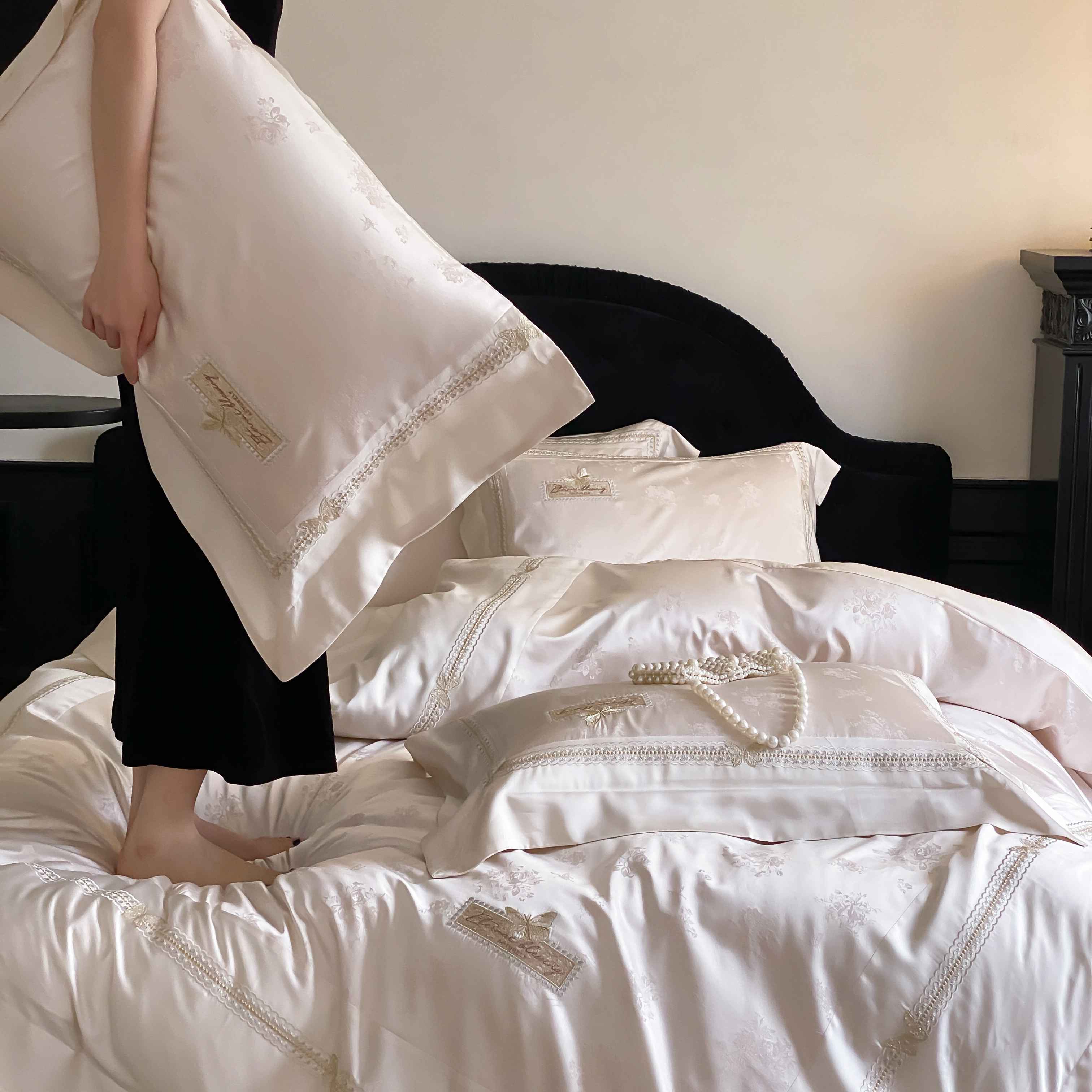 商品名称:太古汇家居 2025新款兰精天丝高精密提花-绣花“花间蝶影”系列 花间蝶影-香槟