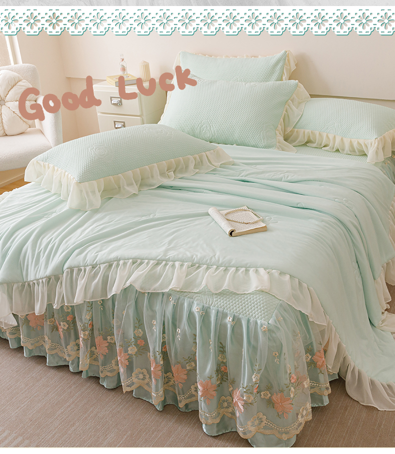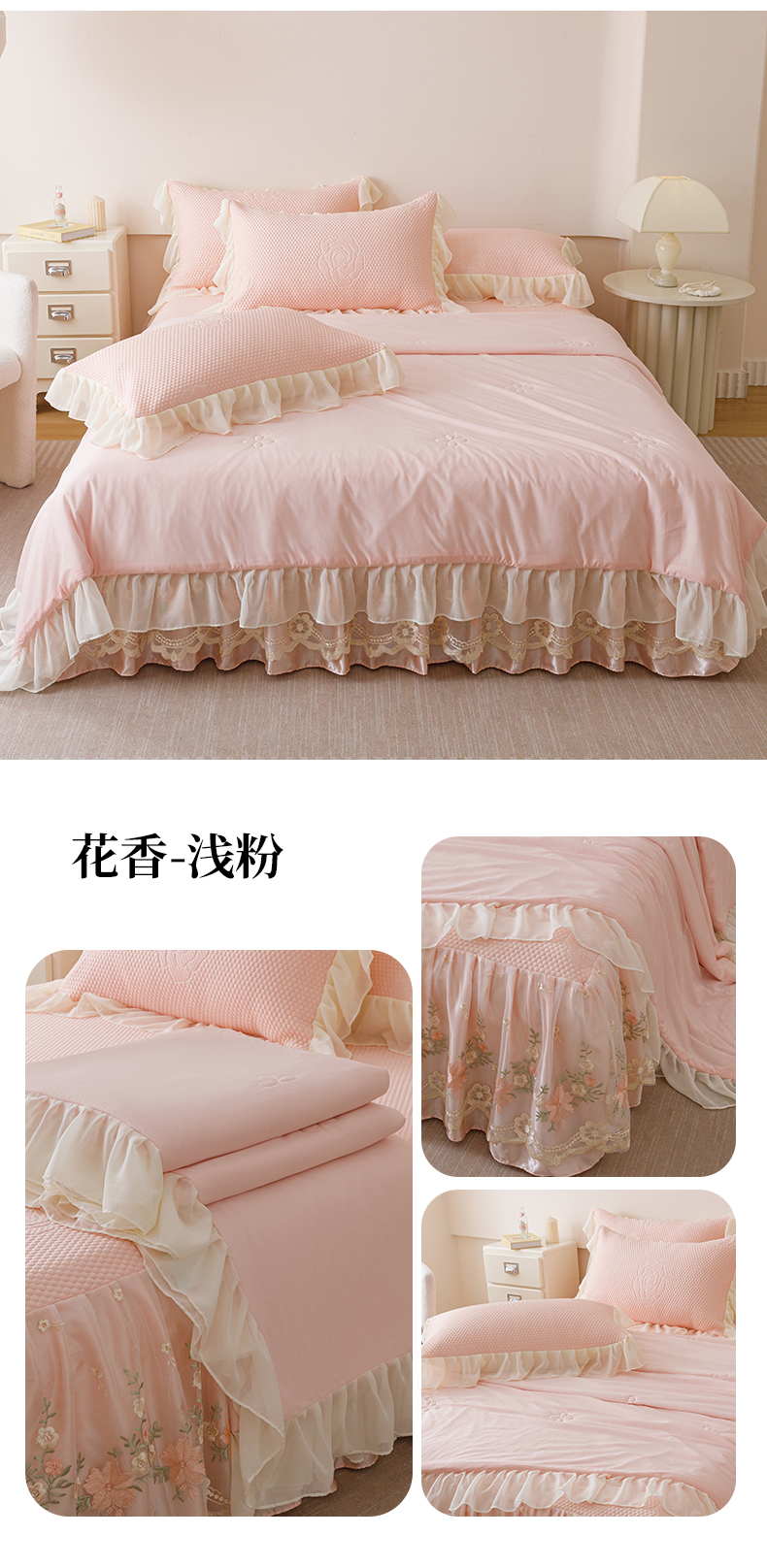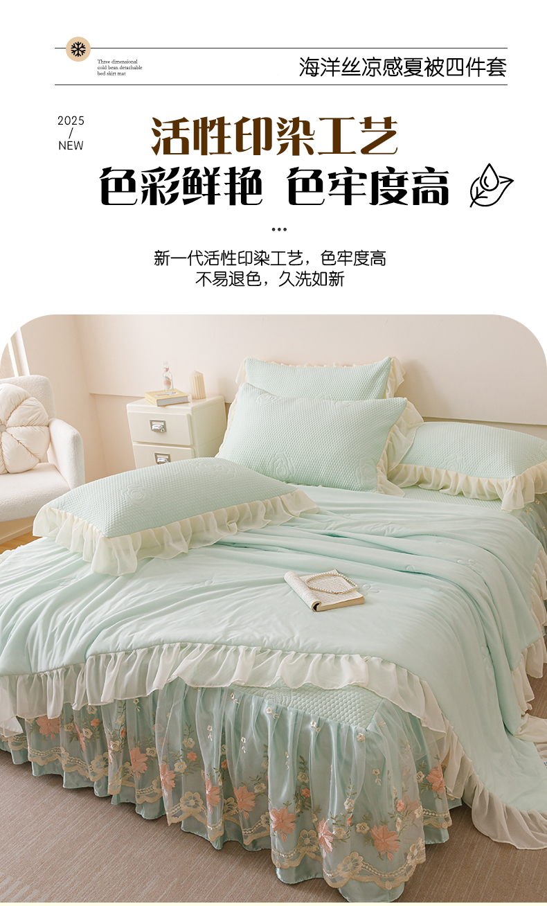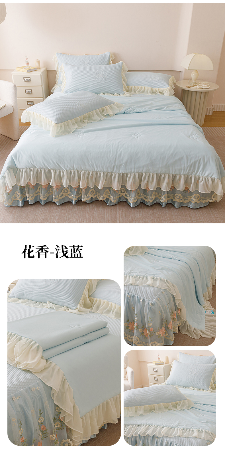 (总)好儿喜家纺 2024新款伊芙琳夏被凉席床裙四件套,浅绿,橄榄绿,奶白,浅粉,浅蓝