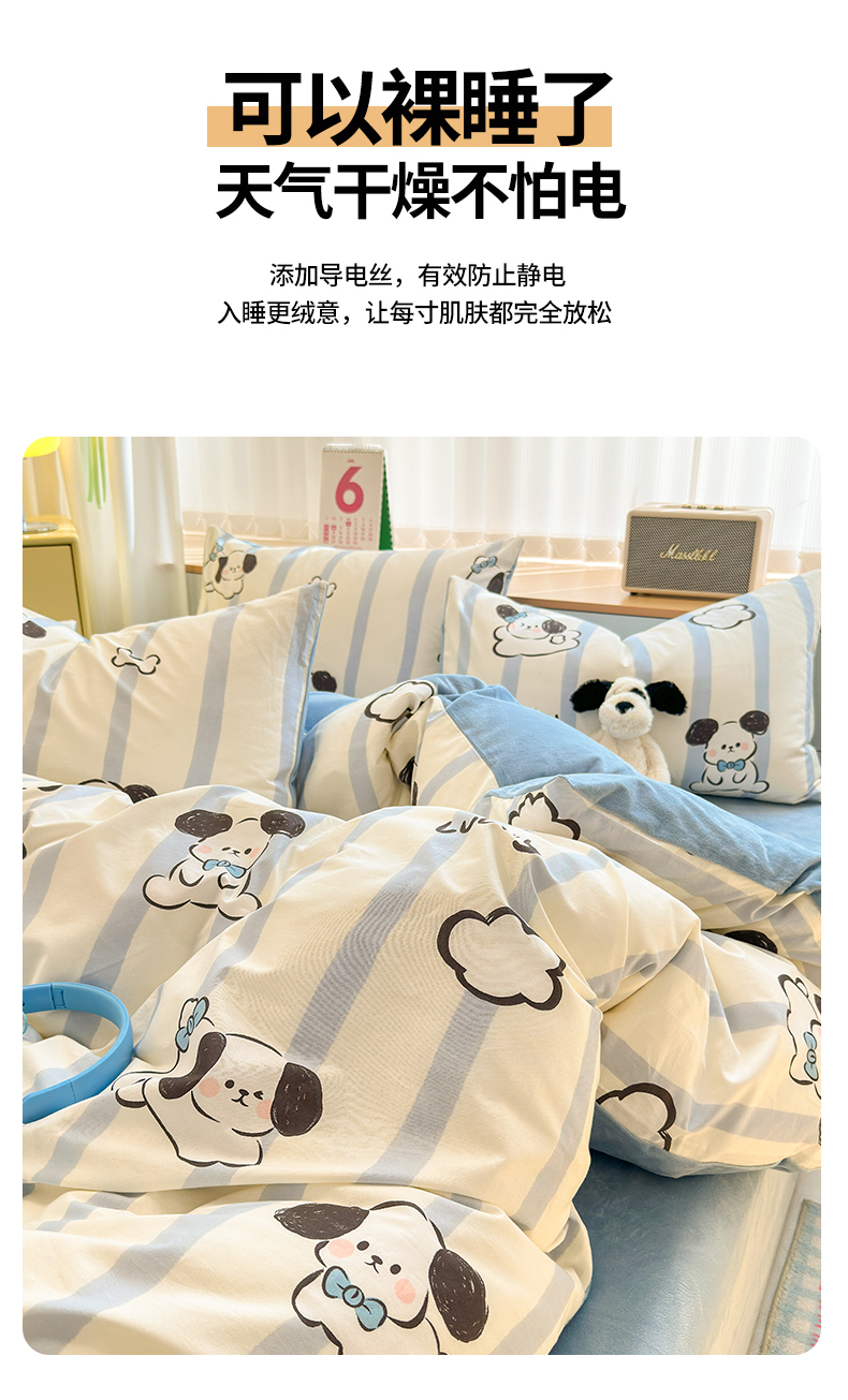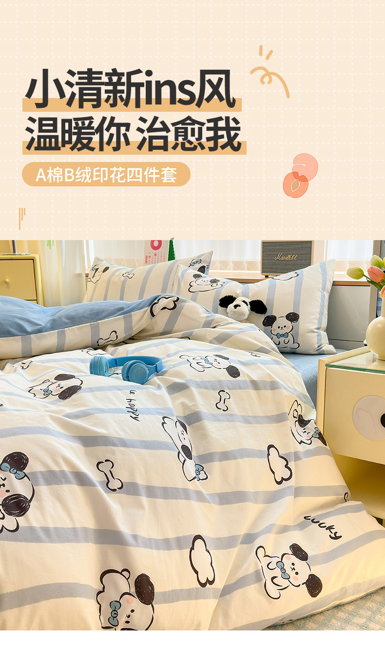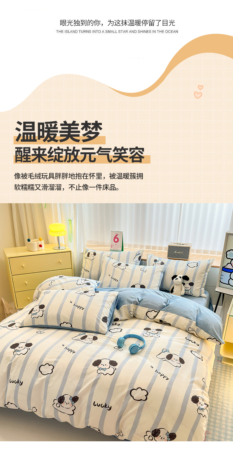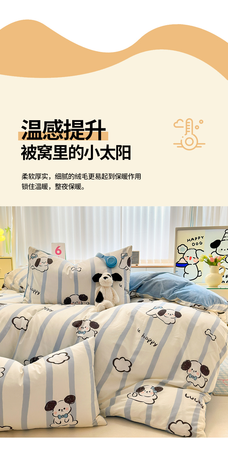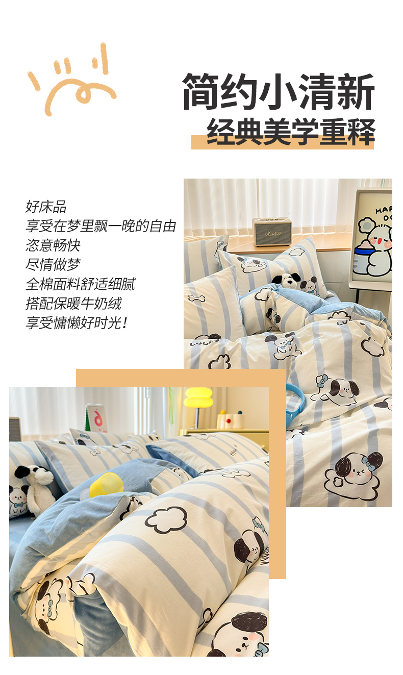 当前位置: 91家纺网 > 商品网购 > 床品套件 > 四件套 > 全棉普通四件套 > 清雅福 2025秋冬新品全棉印花棉加绒四件套系列 棉绒-条纹狗狗