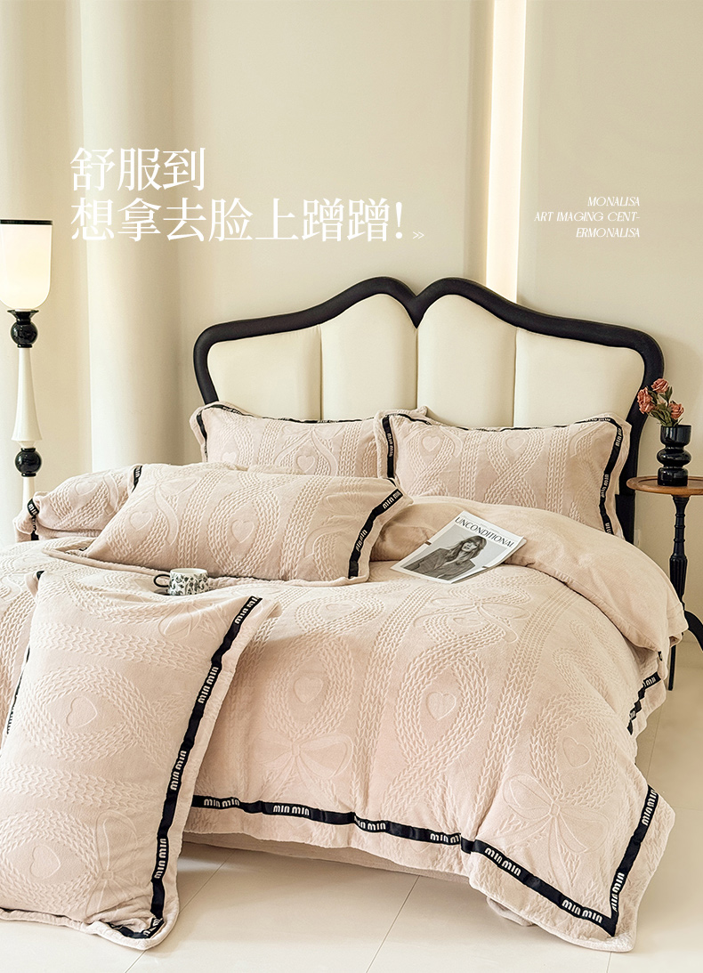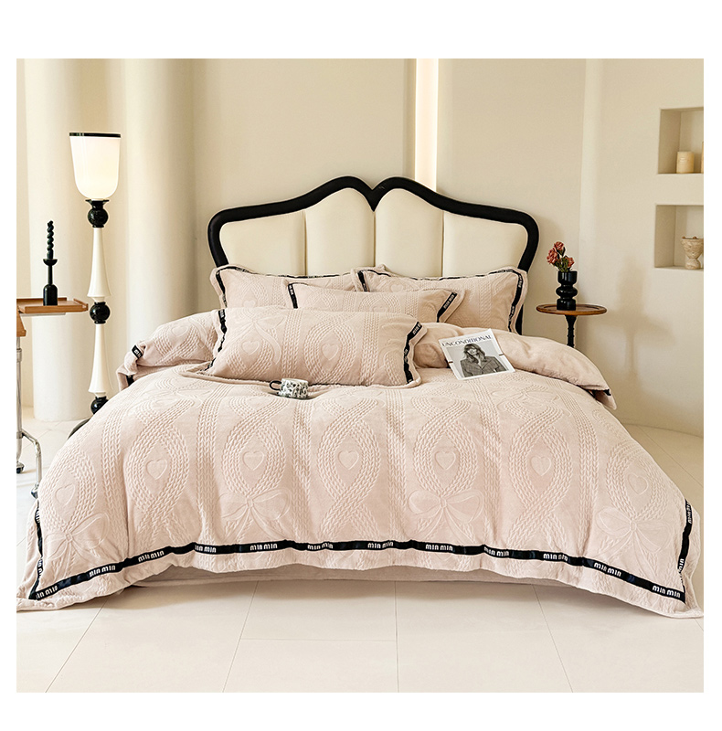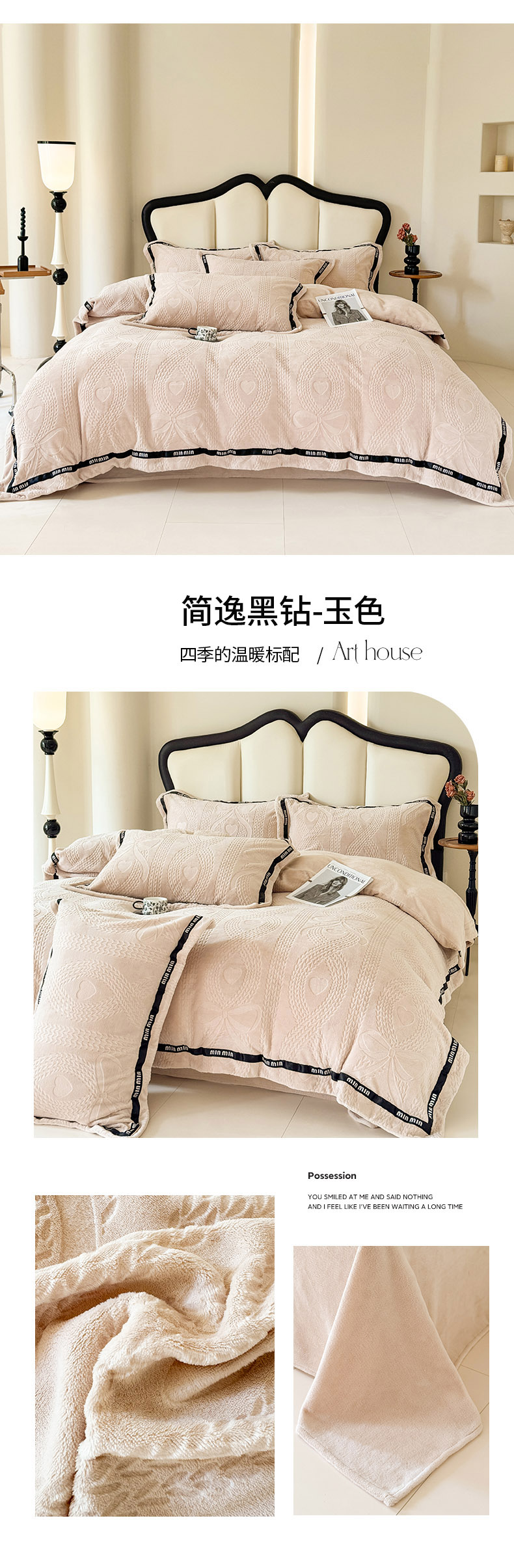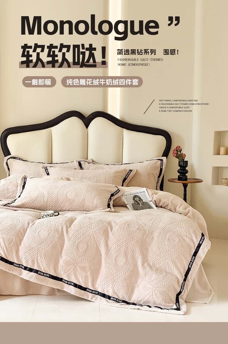 当前位置: 91家纺网 > 商品网购 > 床品套件 > 四件套 > 牛奶绒四件套 > 潮邦创意家居 2025新款冬季雕花牛奶绒四件套-简逸黑钻 简逸黑钻-玉色