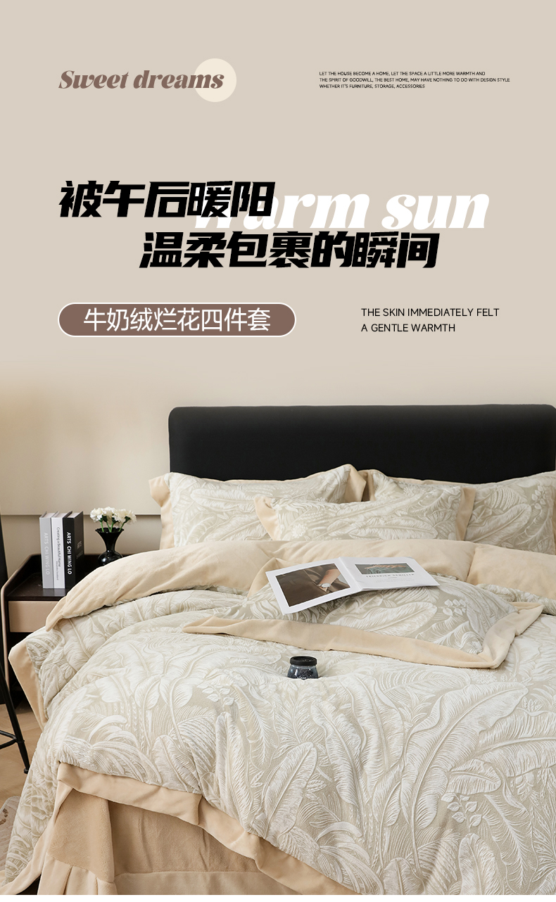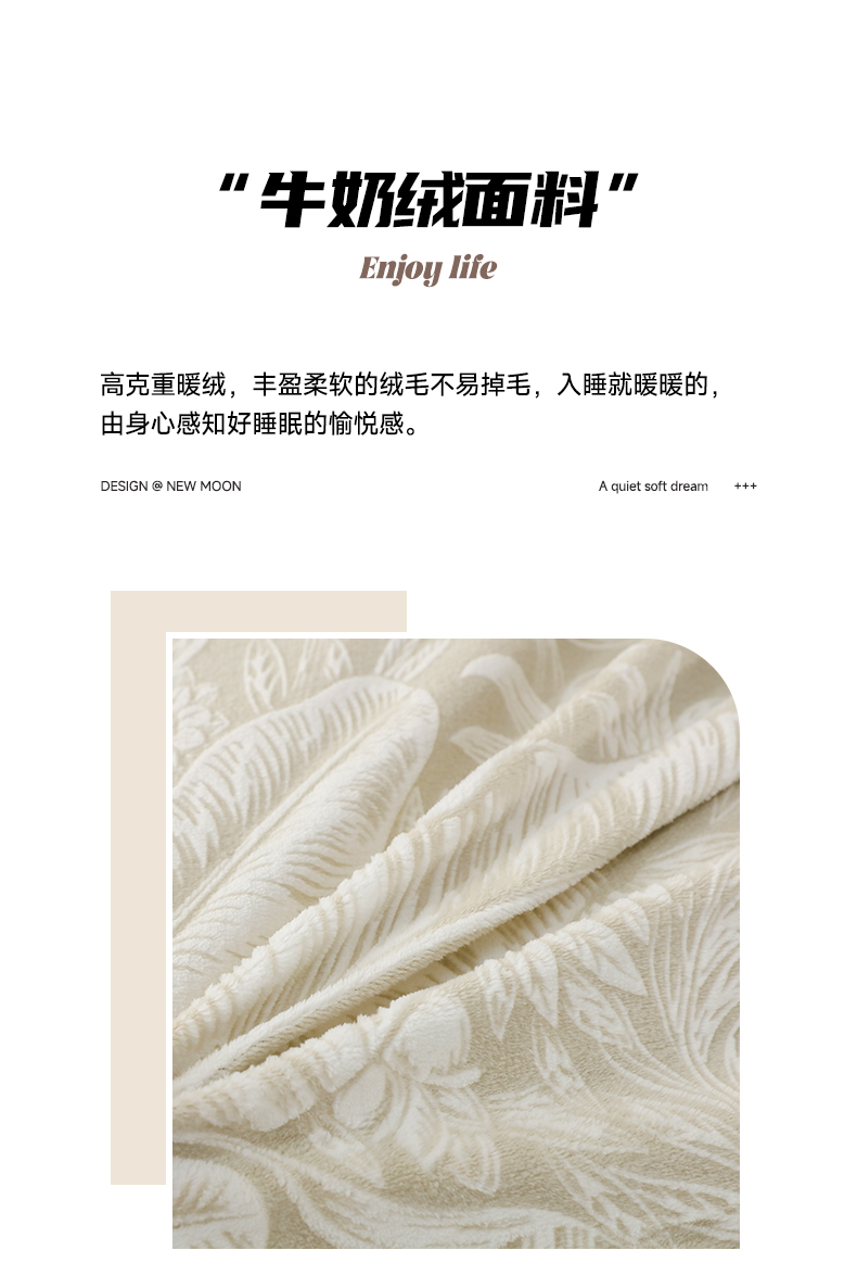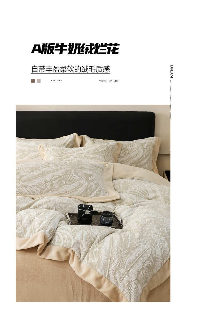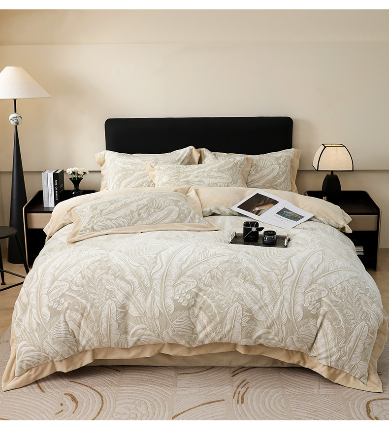商品名称:千姿坊 2025新款冬季雕花牛奶绒加厚保暖四件套复古风轻奢烂花床单被套床上用品 一叶倾城-浅咖
