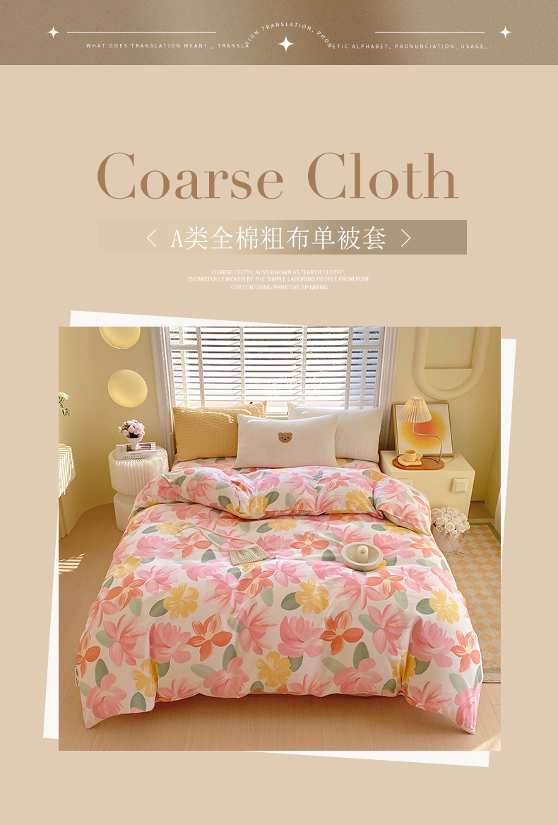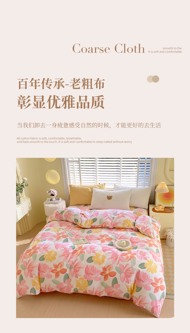 商品名称:春皖家纺 2026高端直播热卖非遗A类全棉老粗布加厚床单款三件套-工艺款单被套 觅恋