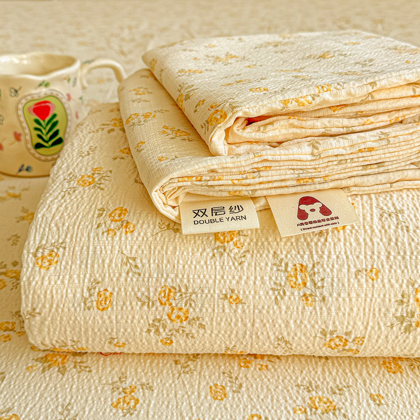 • 91家纺网 家纺一手货源 找家纺 仟人梦 2026新款云感双层纱印花单床单-叠拍图 清新条纹