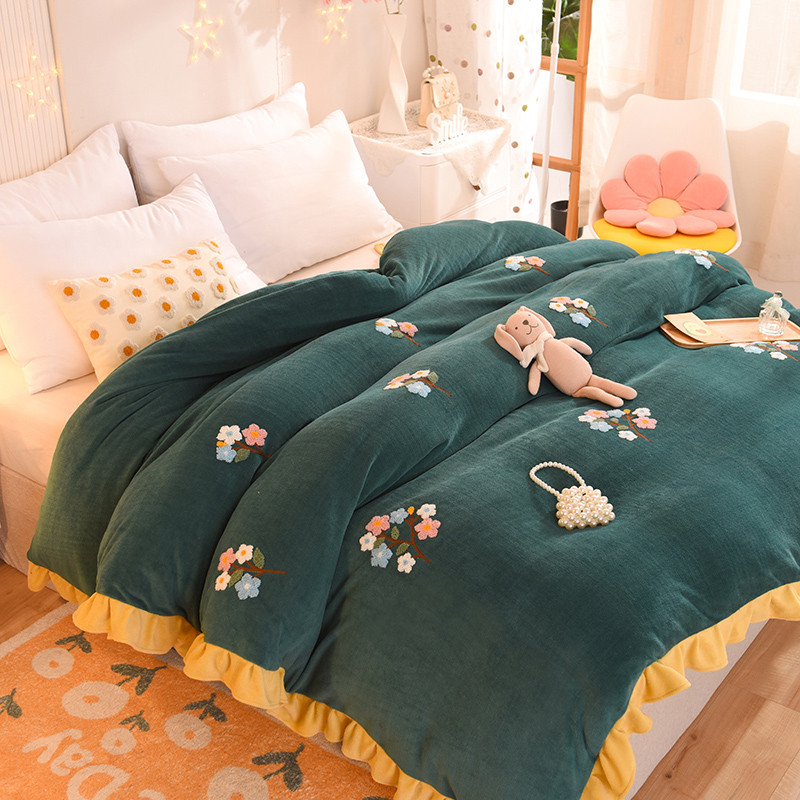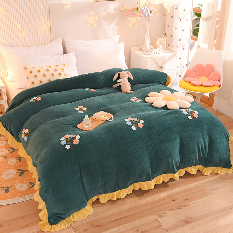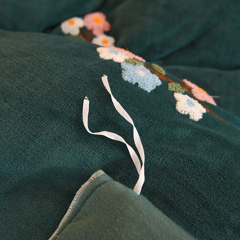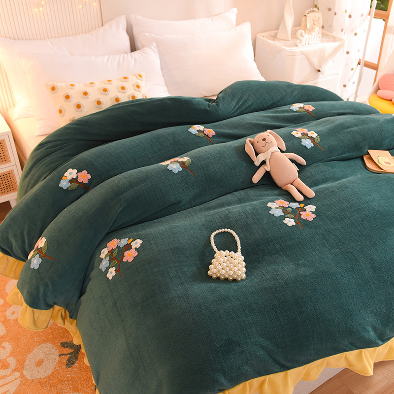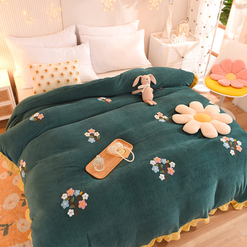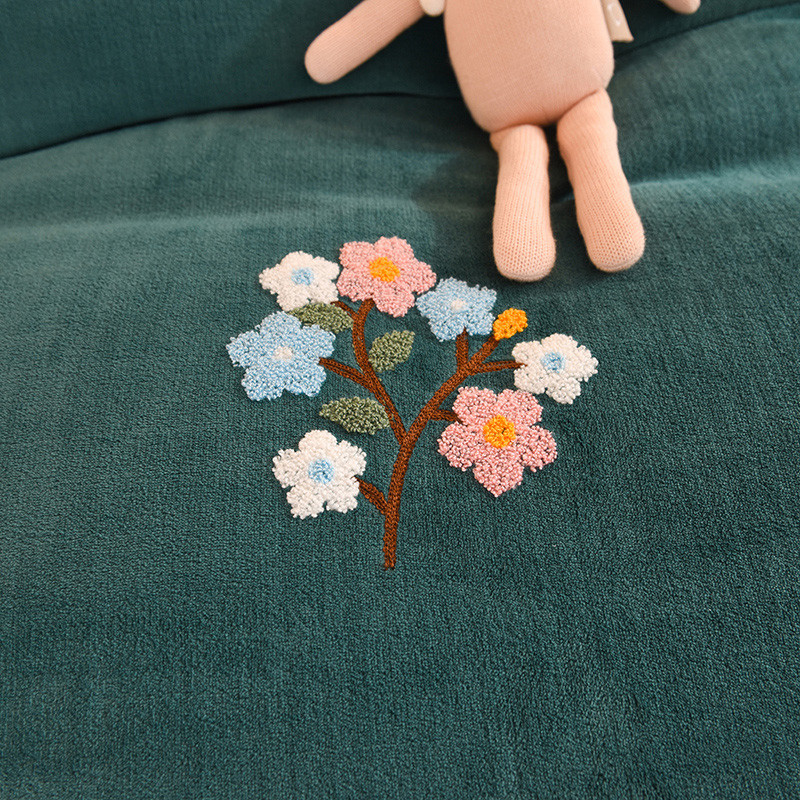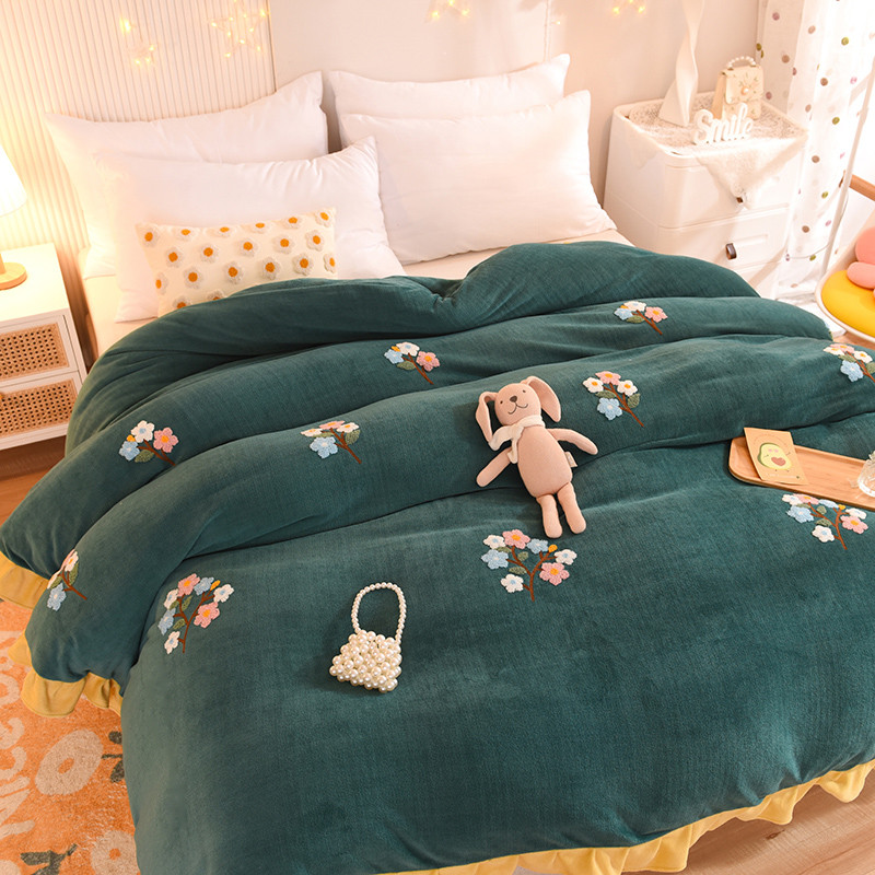 • 91家纺网 家纺一手货源 找家纺 甜之梦 2025新款毛巾绣牛奶绒单被套 满天星墨绿