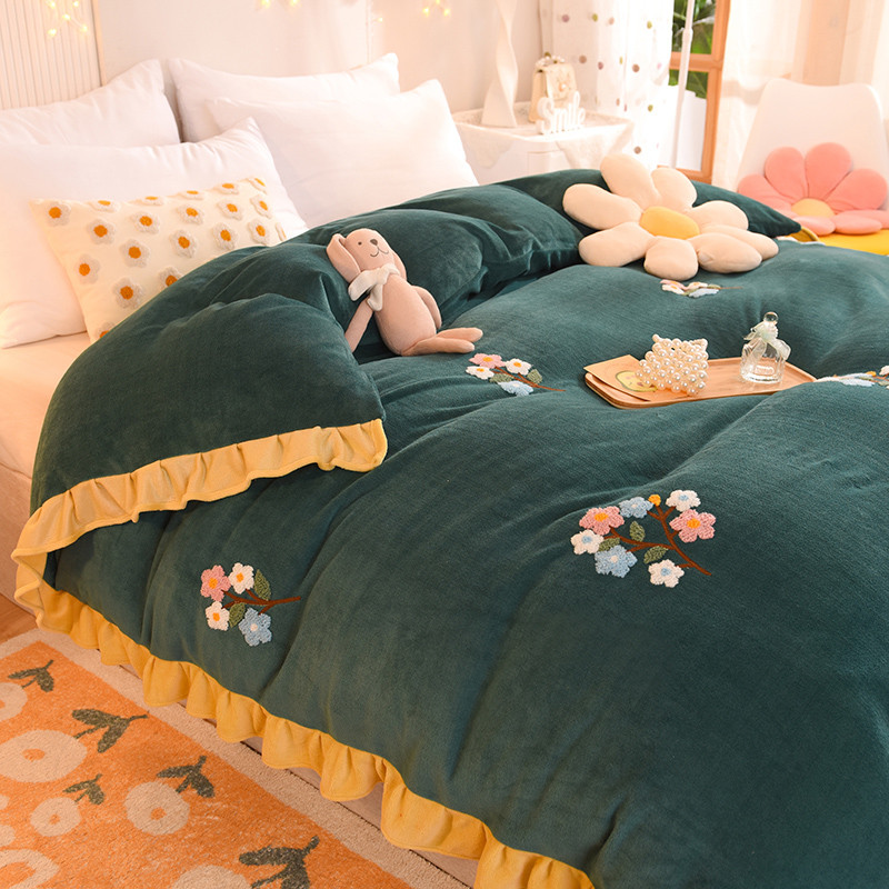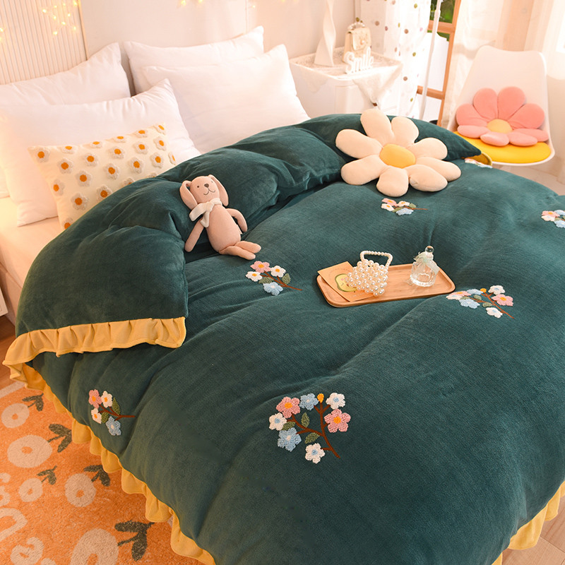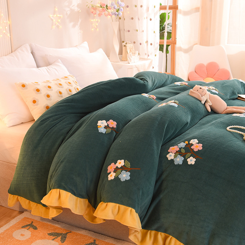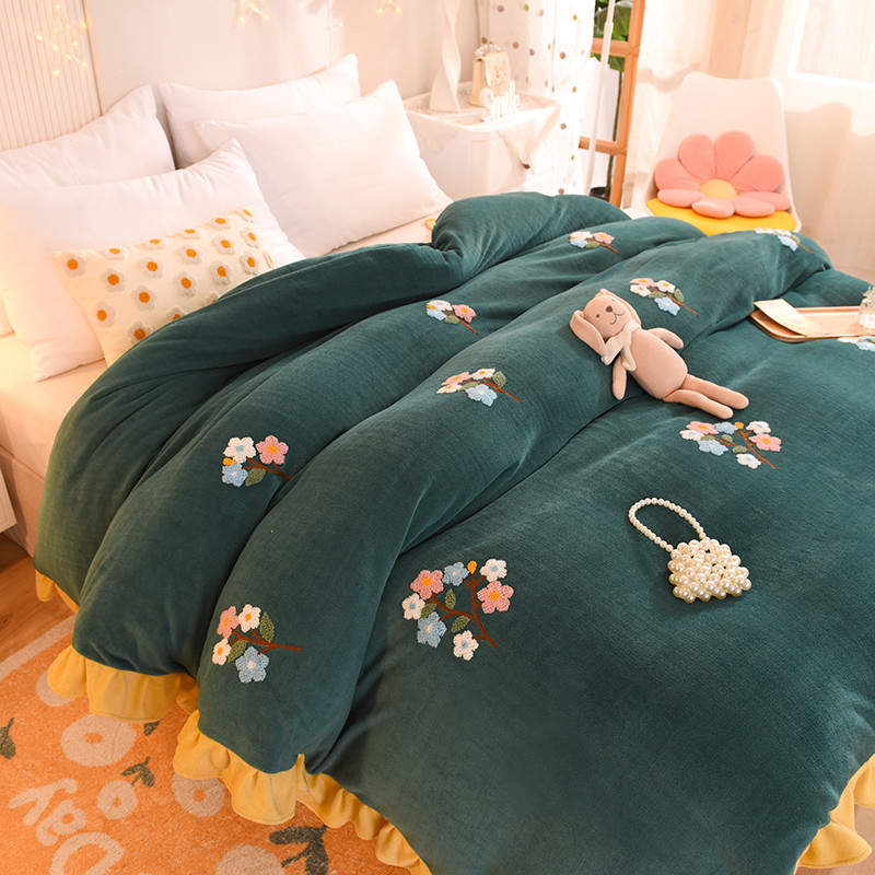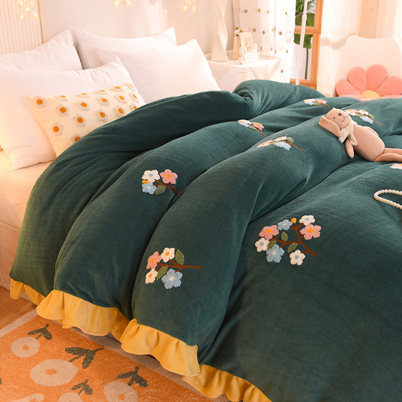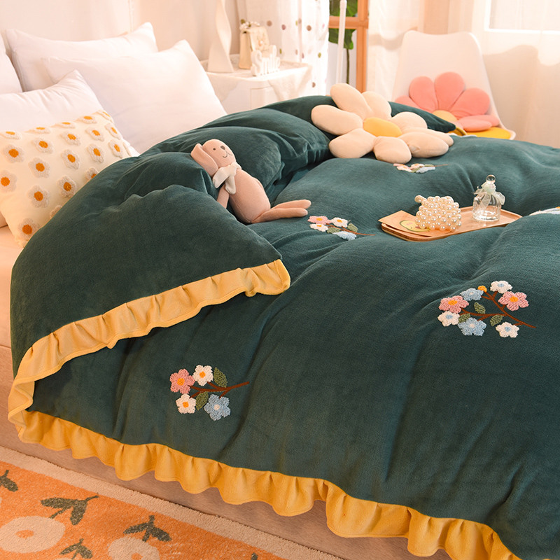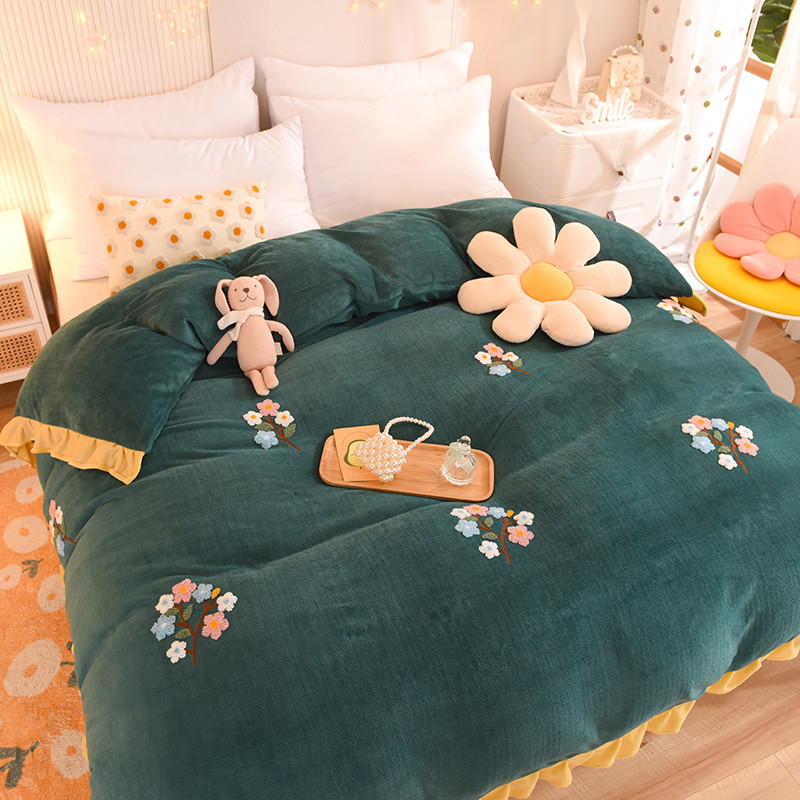 • 91家纺网 家纺一手货源 找家纺 甜之梦 2025新款毛巾绣牛奶绒单被套 满天星墨绿