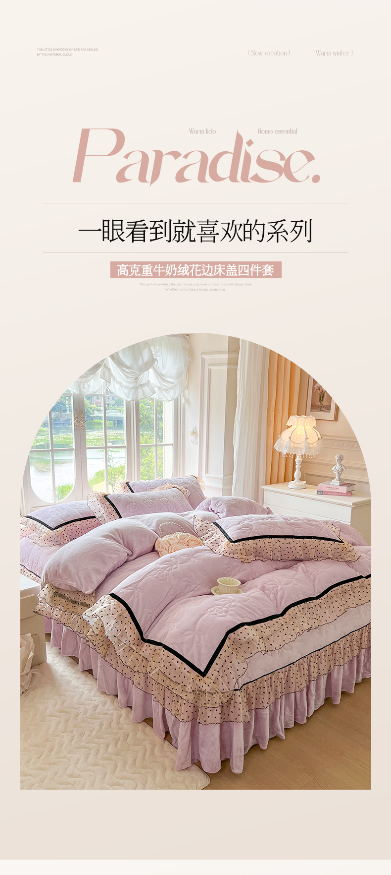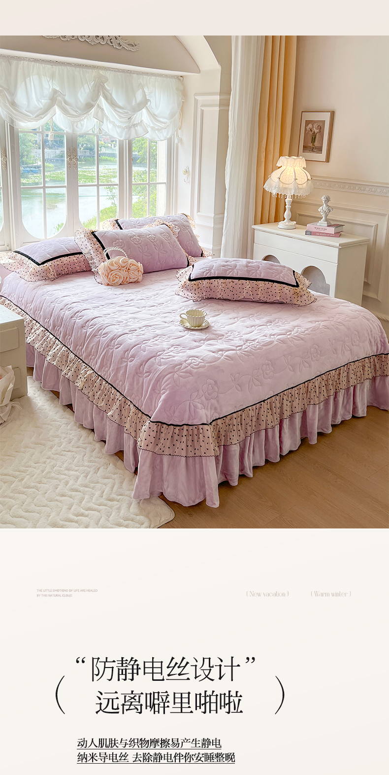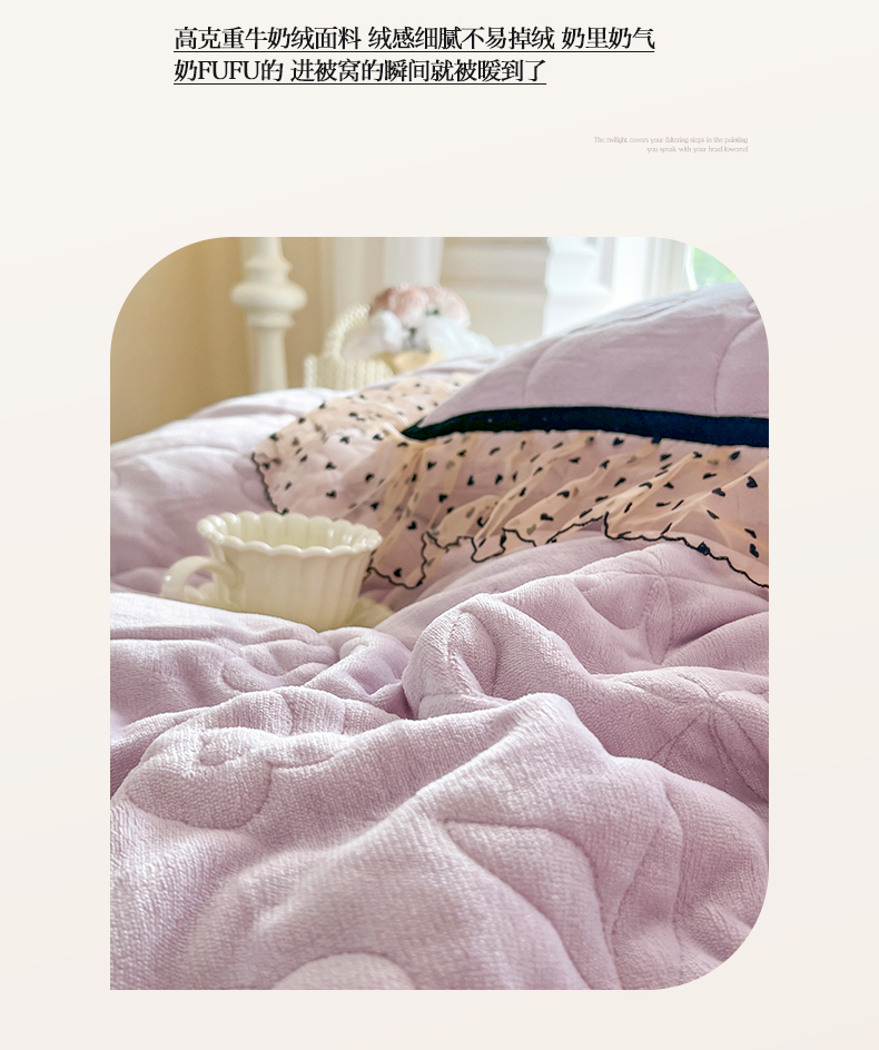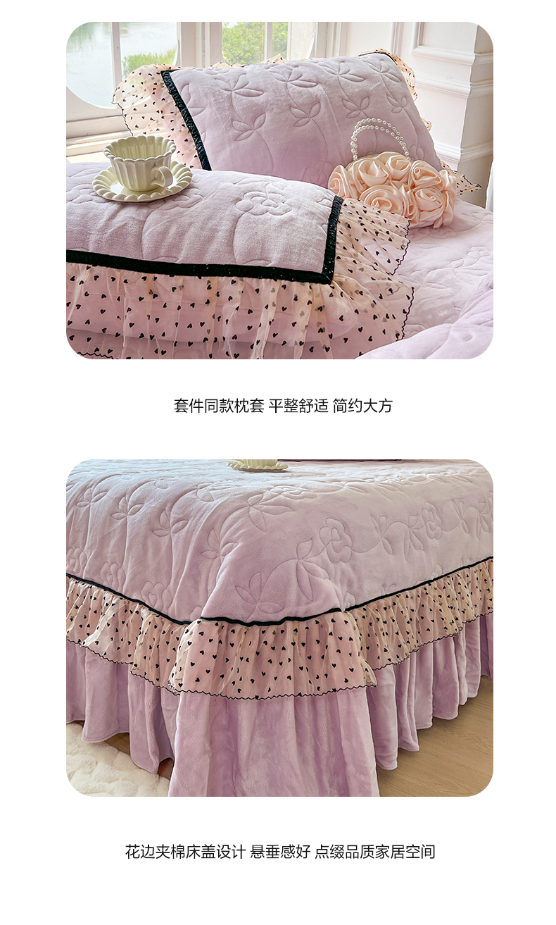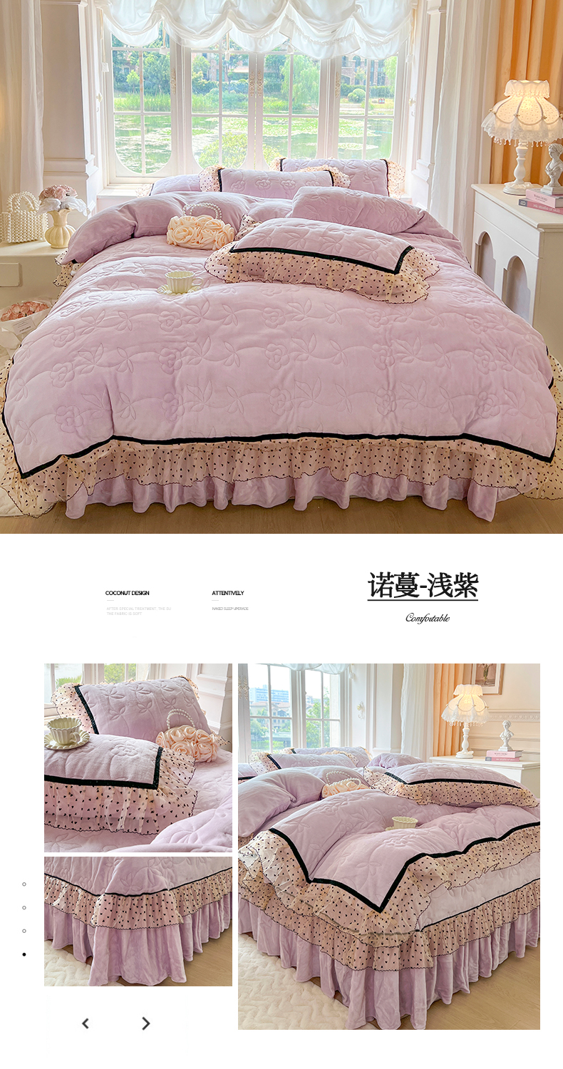 麒豆豆 2024新款高克重时尚花边牛奶绒四件套床盖款-诺蔓 诺蔓-浅紫