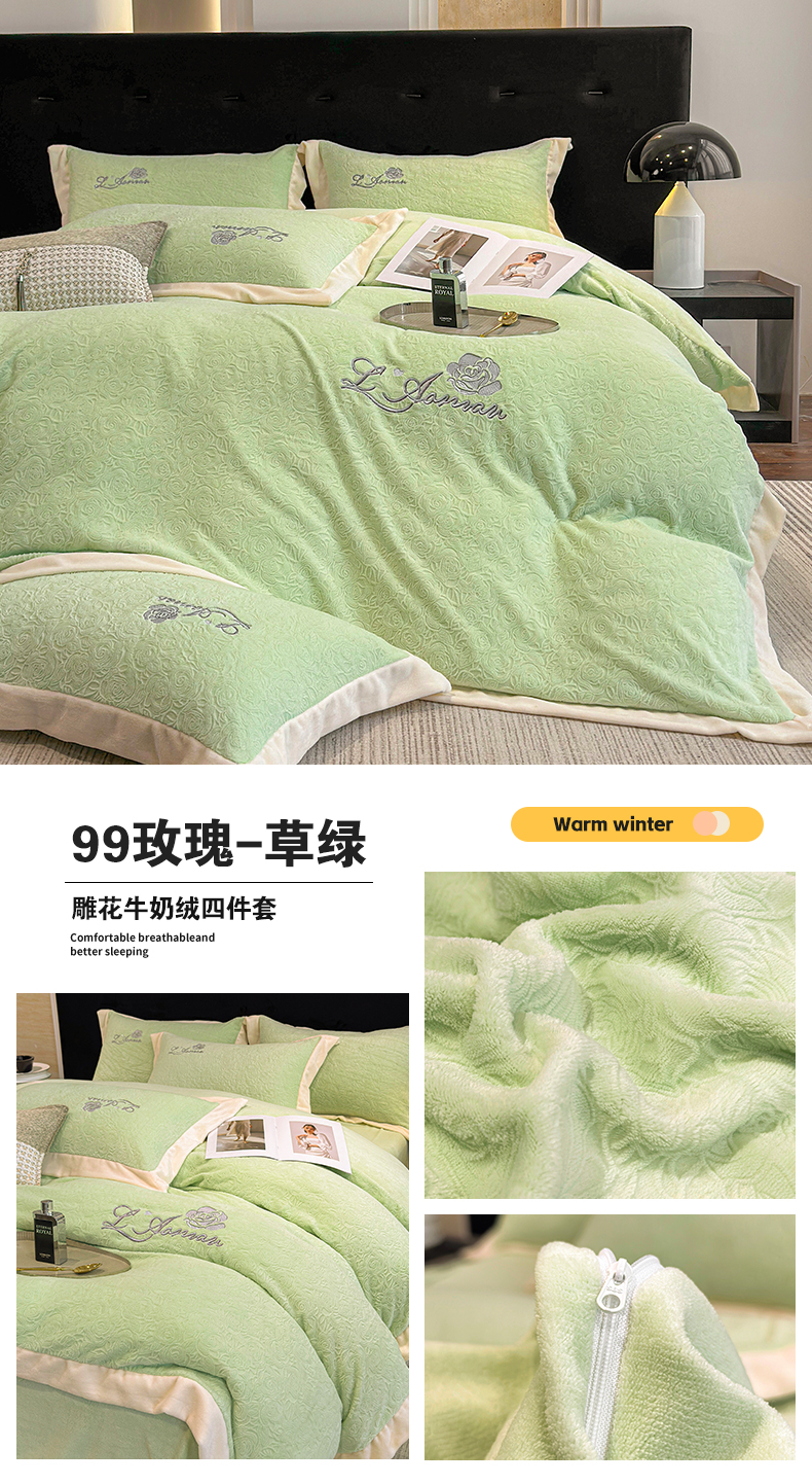 (总)娇逸家居 2025新款秋冬冰岛浮雕雕花牛奶暖绒刺绣四件套-茶白,茶白-海盐绿,茶白-芥黄,茶白-奶芙白,茶白-芝兰粉