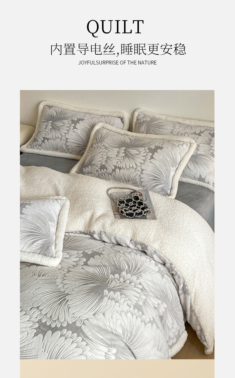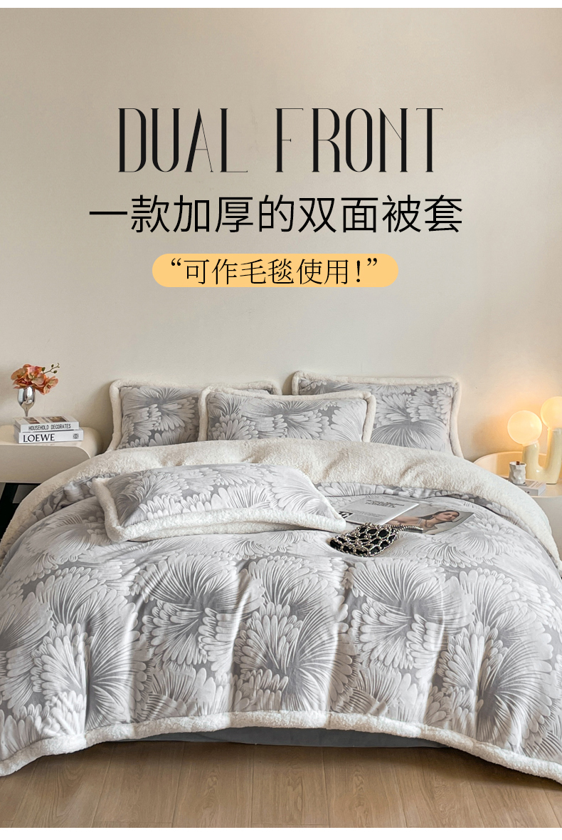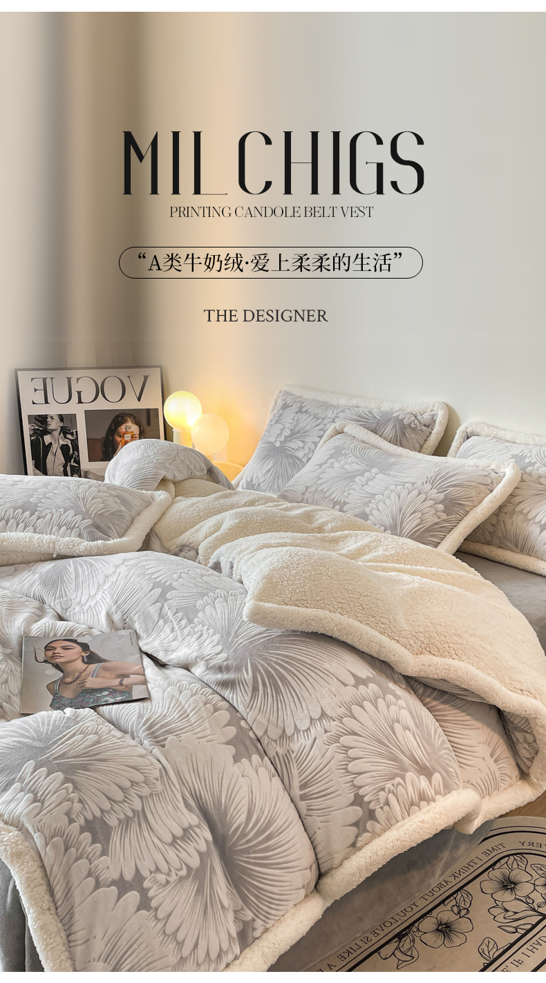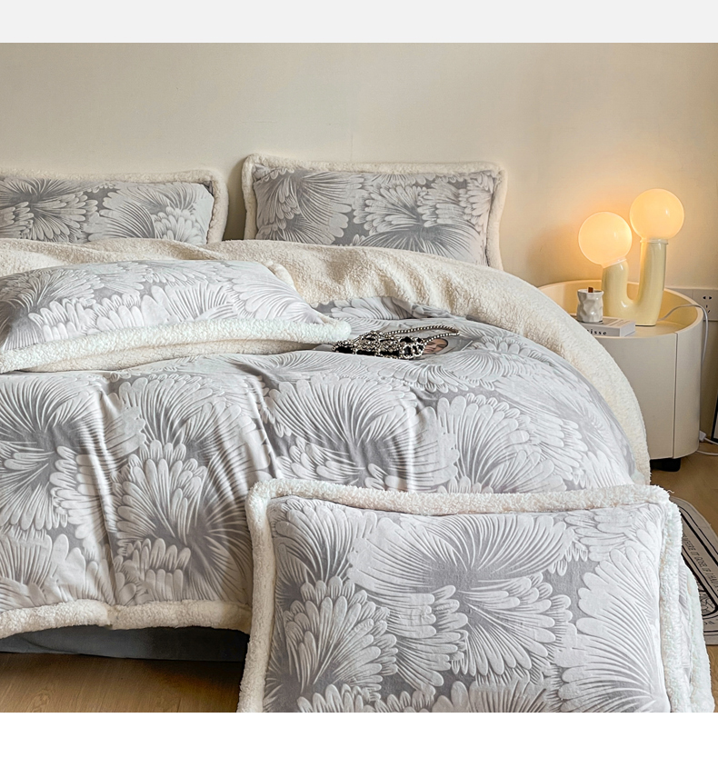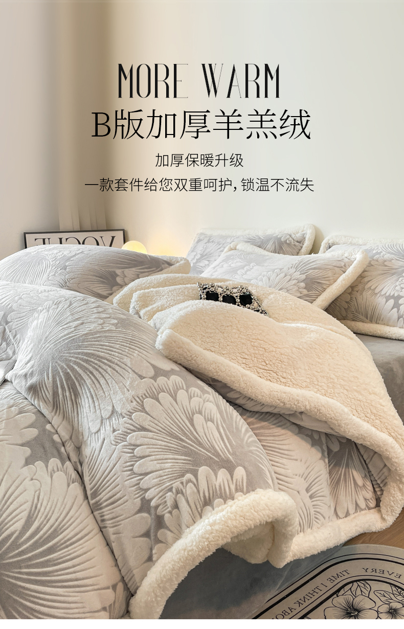 商品名称:慕晨 2024新款A类高克重简奢雕花牛奶绒240G羊羔绒双面加厚被套绒四件套 烟花-灰