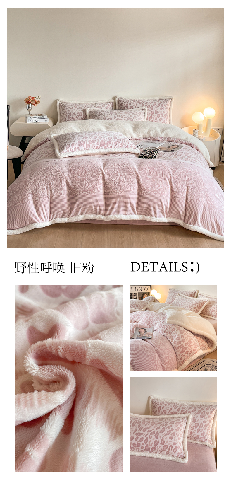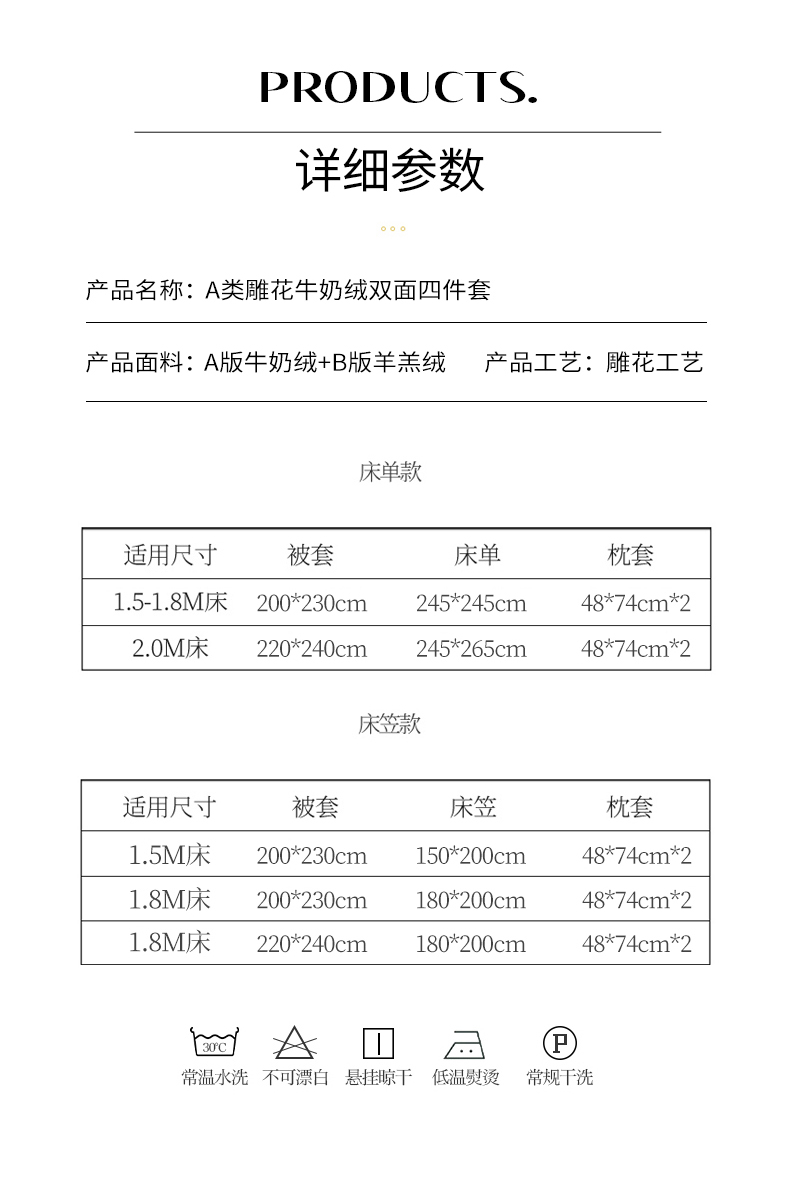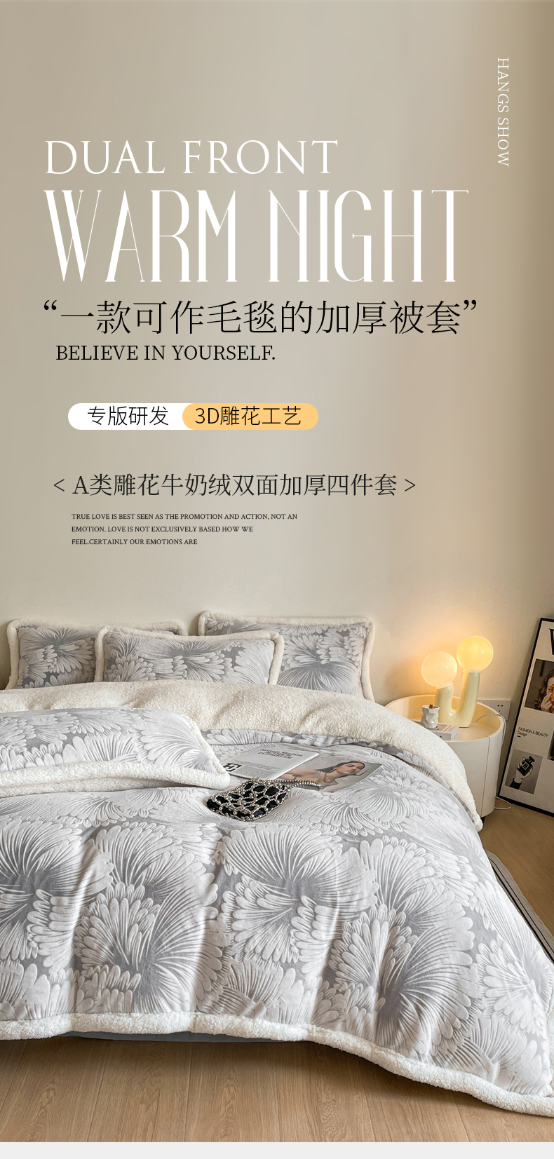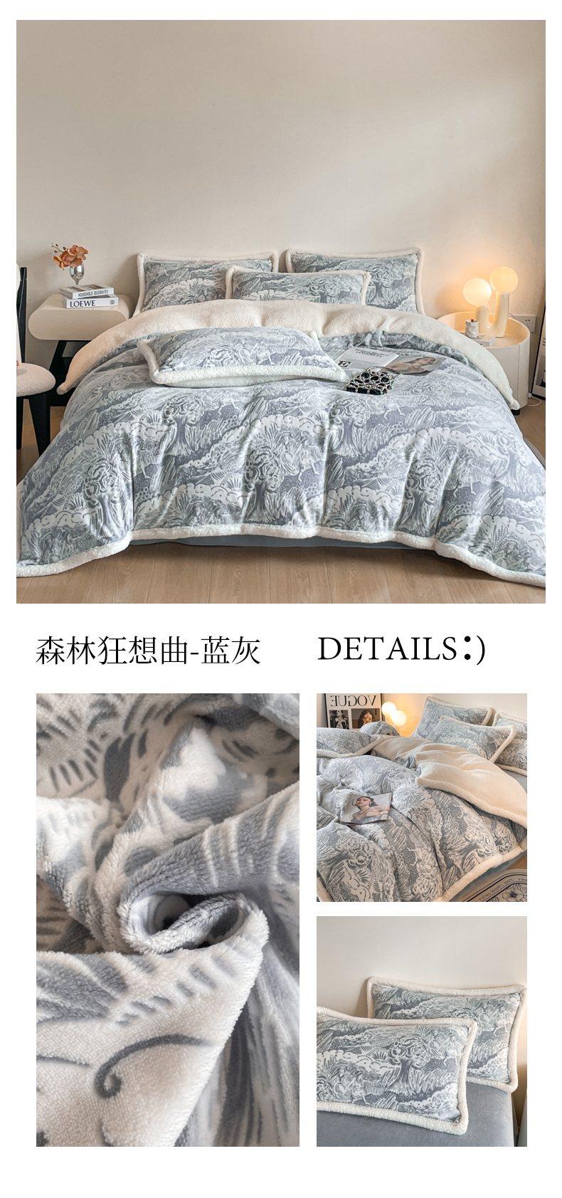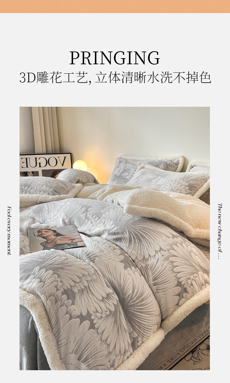 商品名称:慕晨 2024新款A类高克重简奢雕花牛奶绒240G羊羔绒双面加厚被套绒四件套 烟花-灰