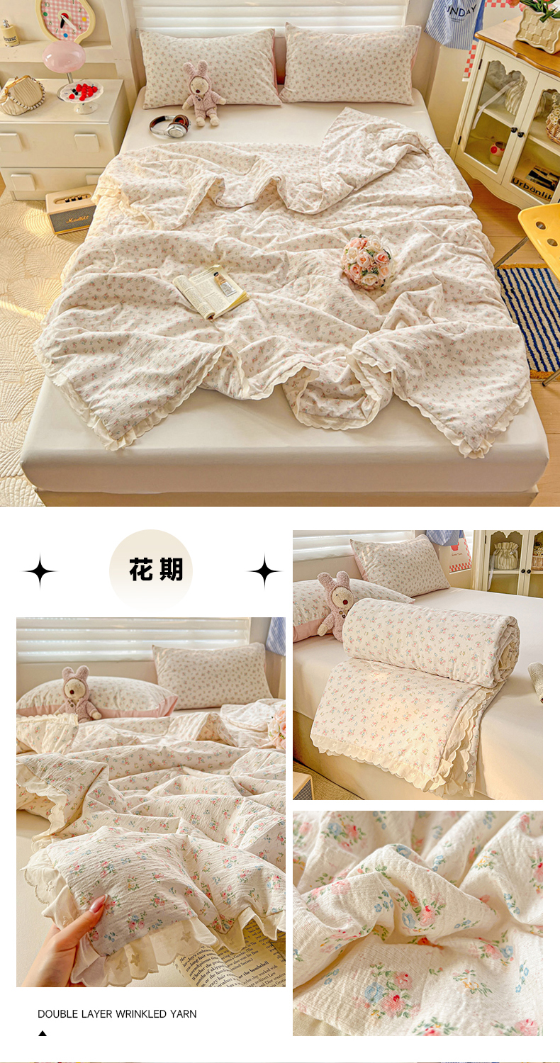 商品名称:一比一家纺 2025新款云感皱皱双层纱全棉纯棉花边单夏被夏凉被空调被系列 花期