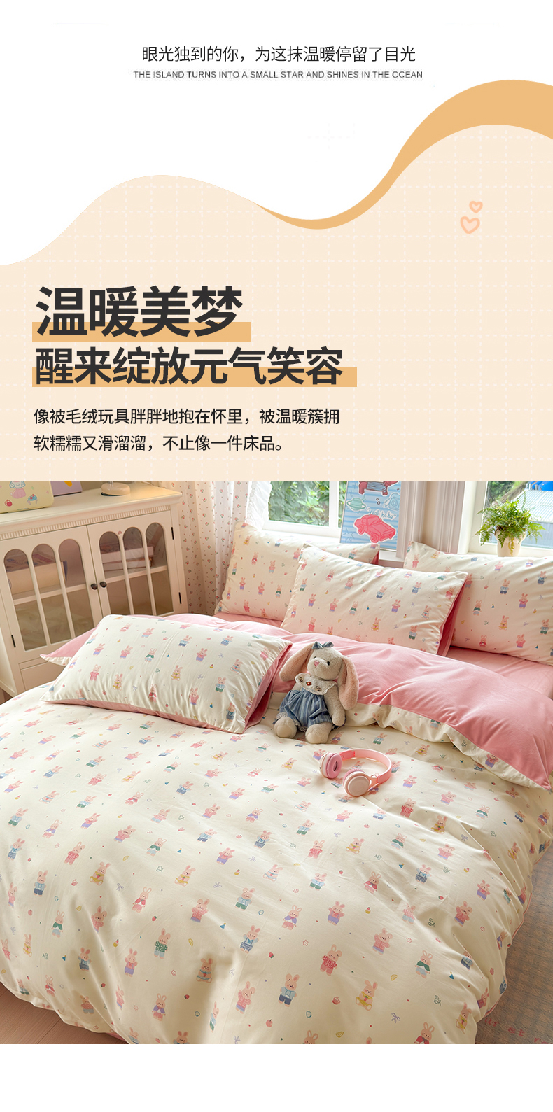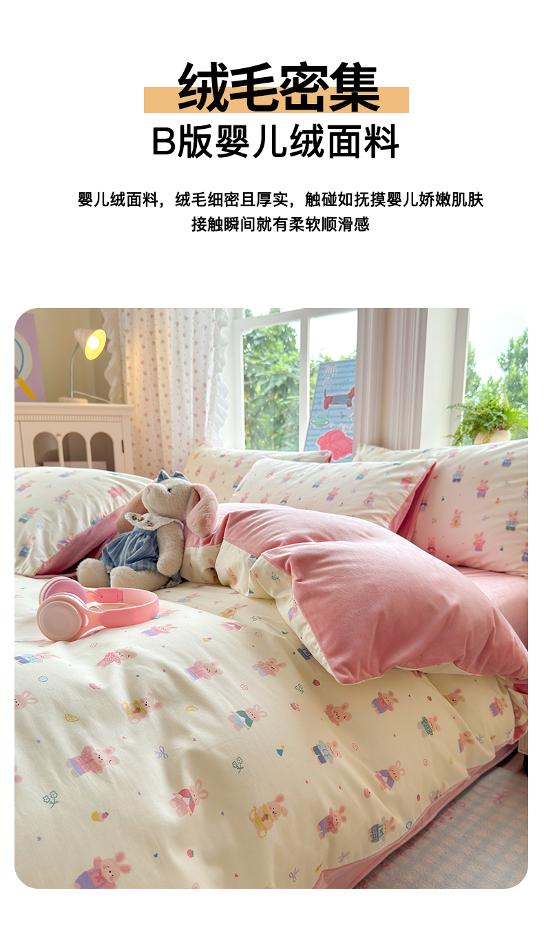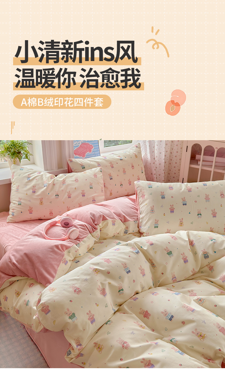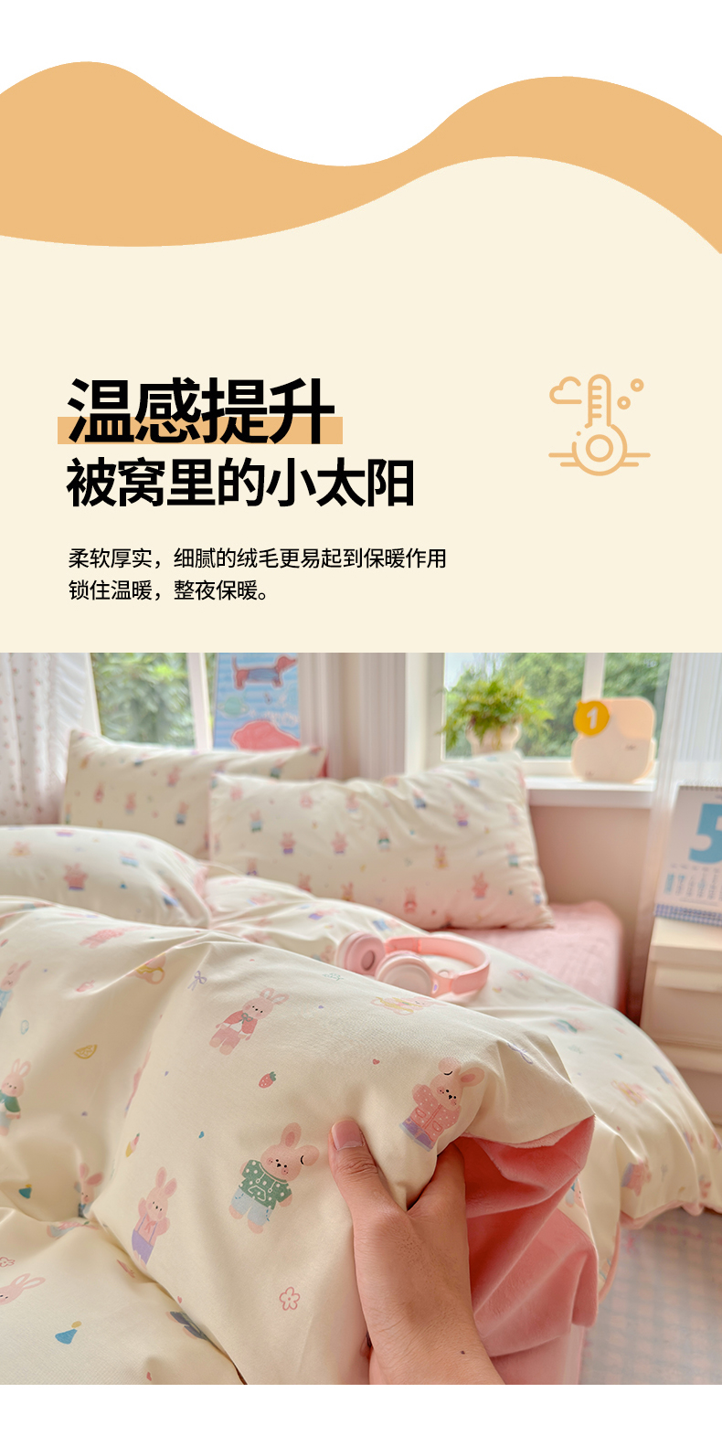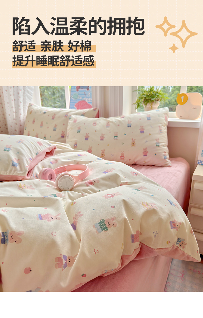 当前位置: 91家纺网 > 商品网购 > 床品套件 > 四件套 > 全棉普通四件套 > 清雅福 2025秋冬新品全棉印花棉加绒四件套系列 棉绒-果冻兔