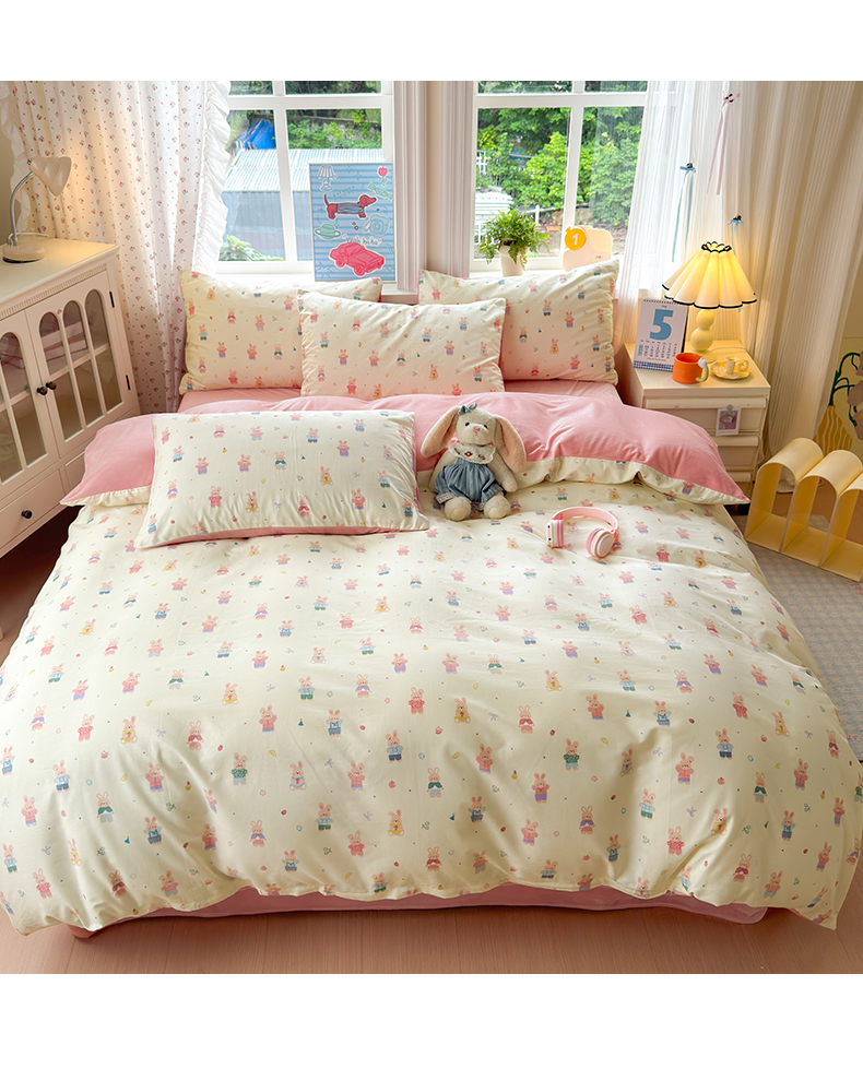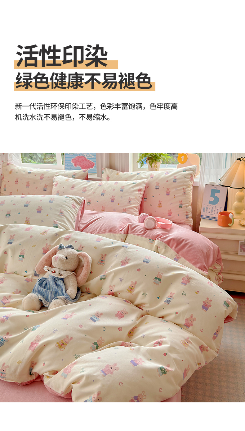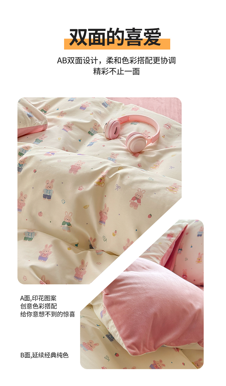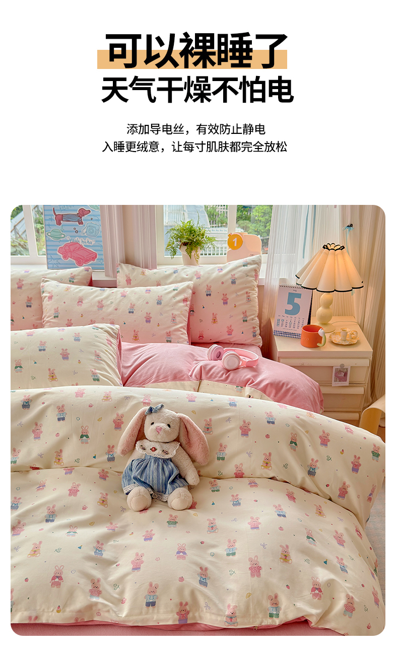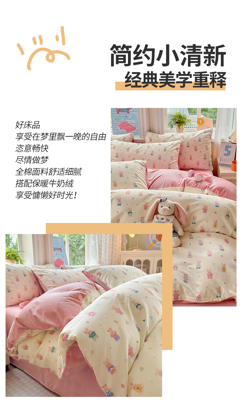 当前位置: 91家纺网 > 商品网购 > 床品套件 > 四件套 > 全棉普通四件套 > 清雅福 2025秋冬新品全棉印花棉加绒四件套系列 棉绒-果冻兔