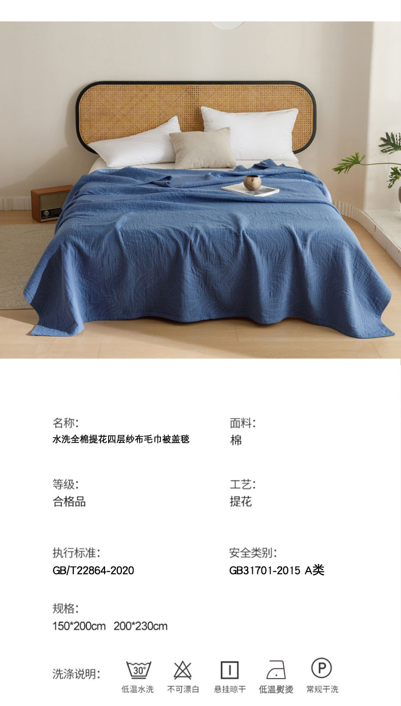 商品名称:朴尔家纺-毛巾被 2026春夏新款纯色四层立体三角树叶水洗全棉纯棉纱布系列盖毯毛巾被夏凉被空调被 提花树叶-宝蓝
