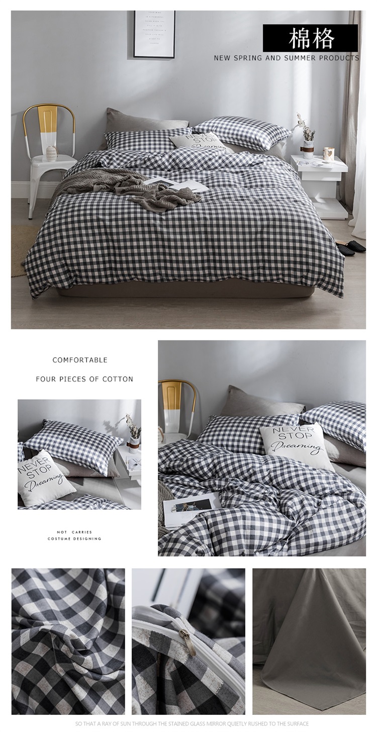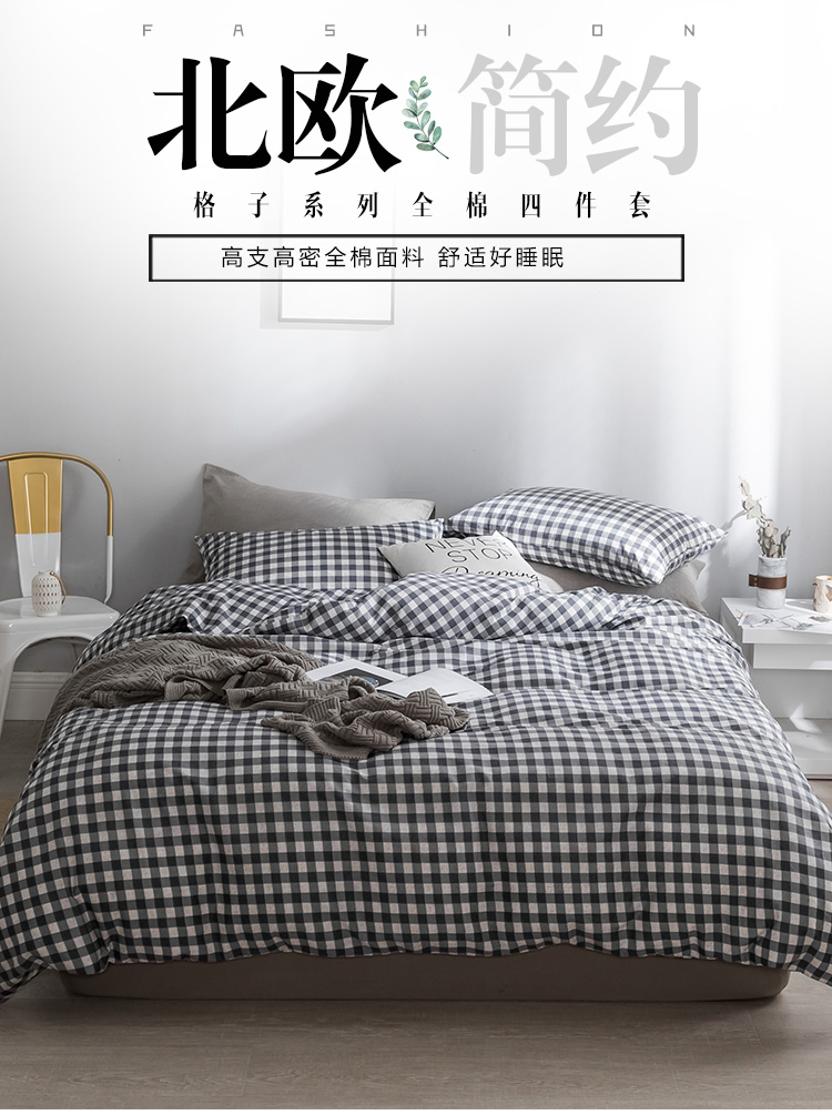 艾沁家纺 北欧简约格子条纹系列全棉四件套床单款棉格