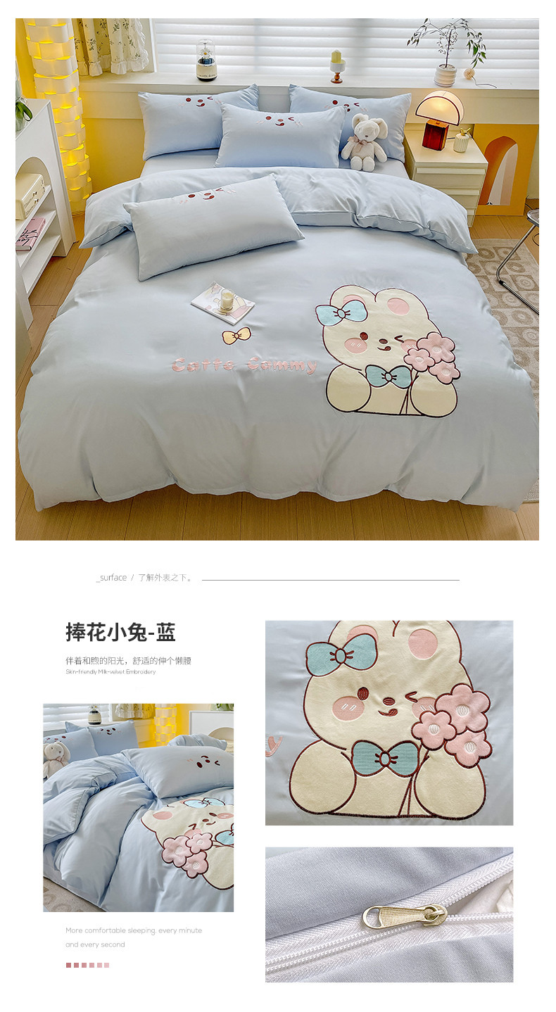 N先生 2024秋冬亲肤水洗棉贴布绣四件套-捧花小兔系列 捧花小兔-蓝