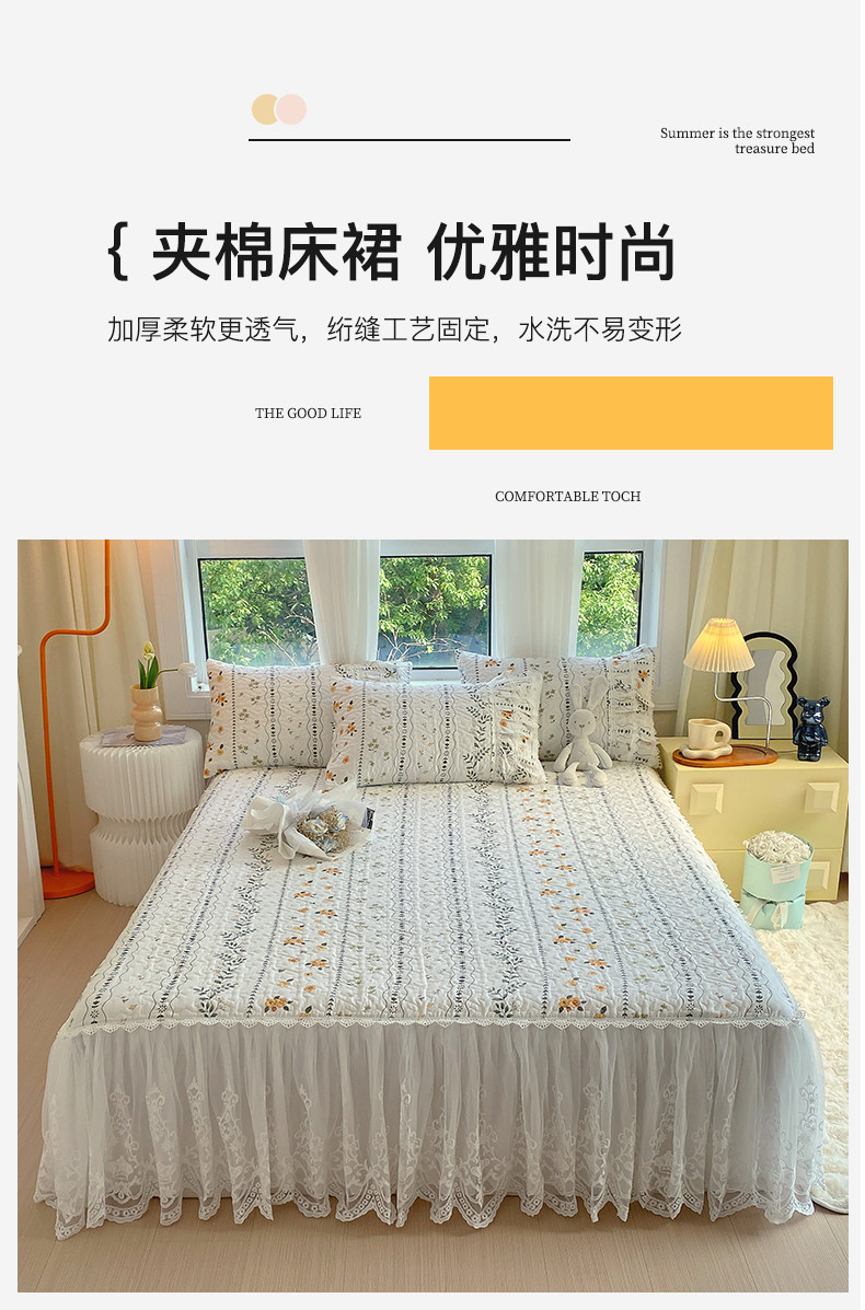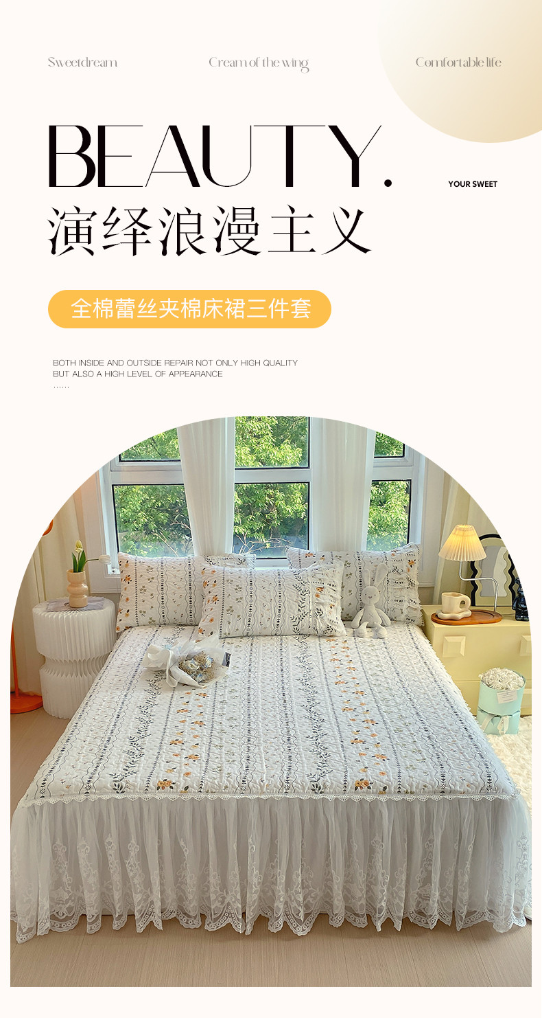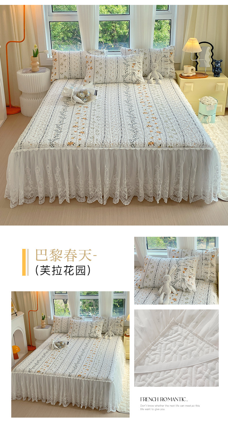 • 91家纺网 家纺一手货源 找家纺 罗艺轩 2024新款全棉蕾丝夹棉床裙巴黎春天系列三件套 芙拉花园