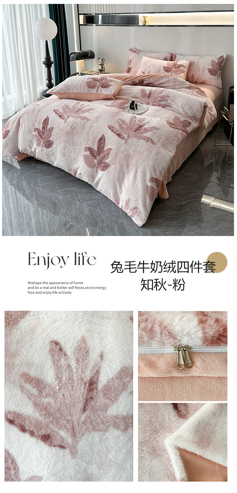 商品名称:富缦庭 2024新款标准8.5斤350克兔毛绒印花四件套 知秋-粉