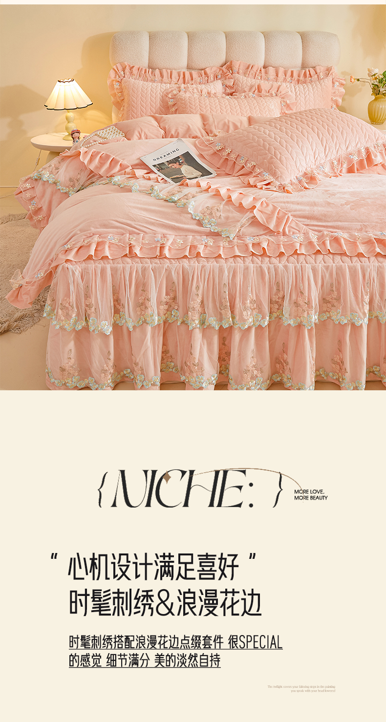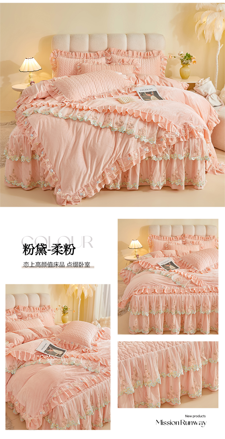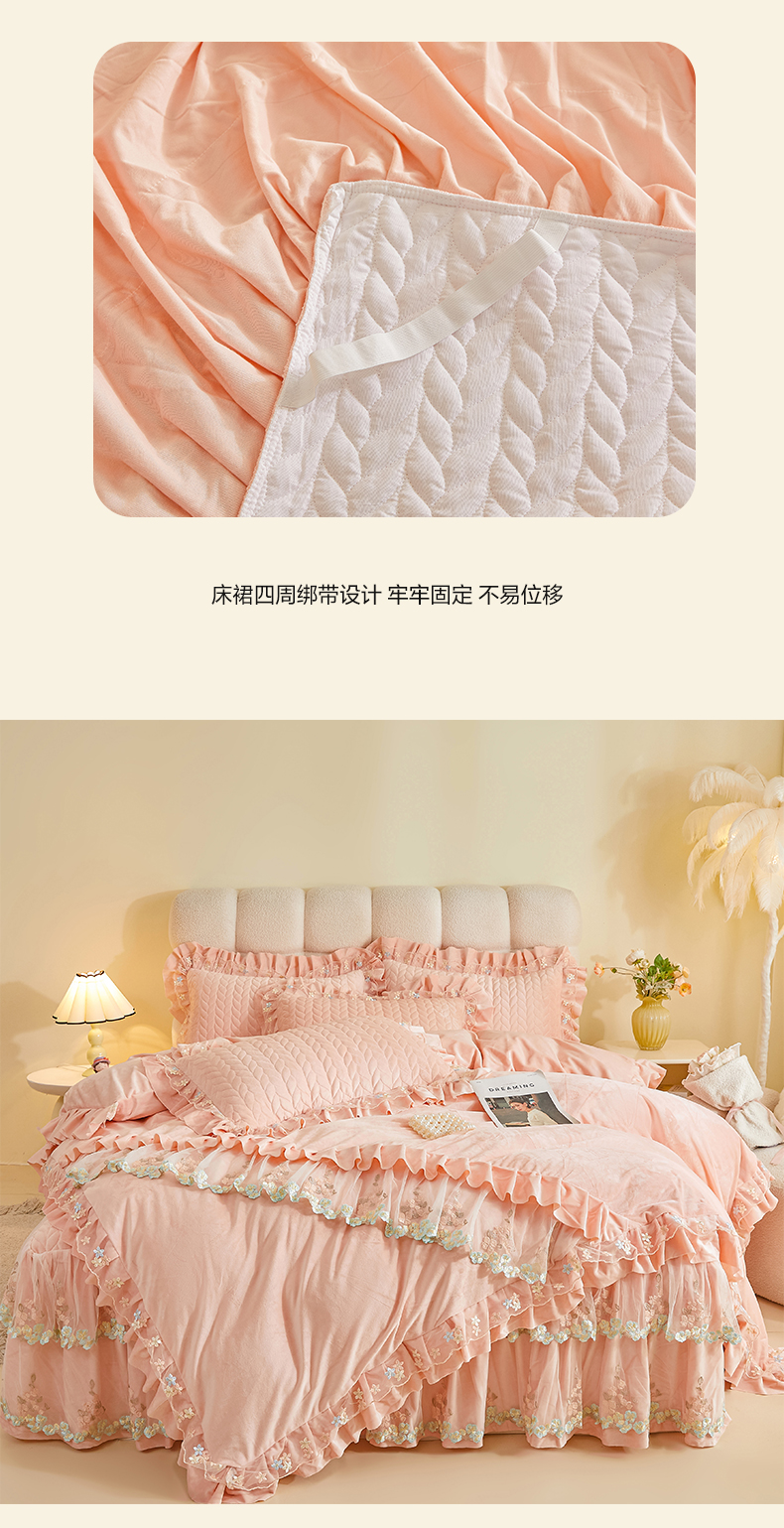 瑞宝 2025新款高克重宝宝绒刺绣床裙四件套-粉黛 粉黛-桃夭粉