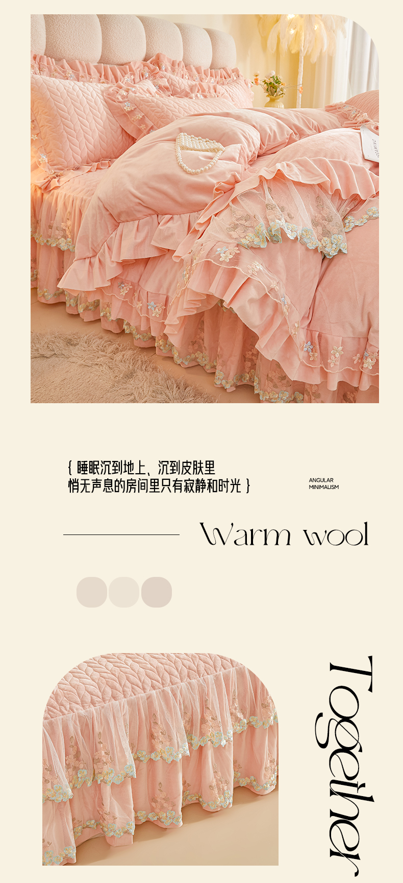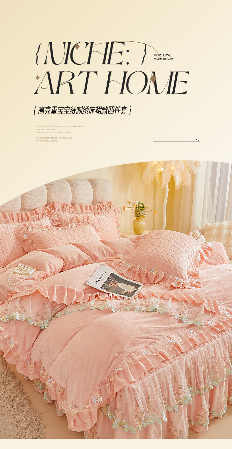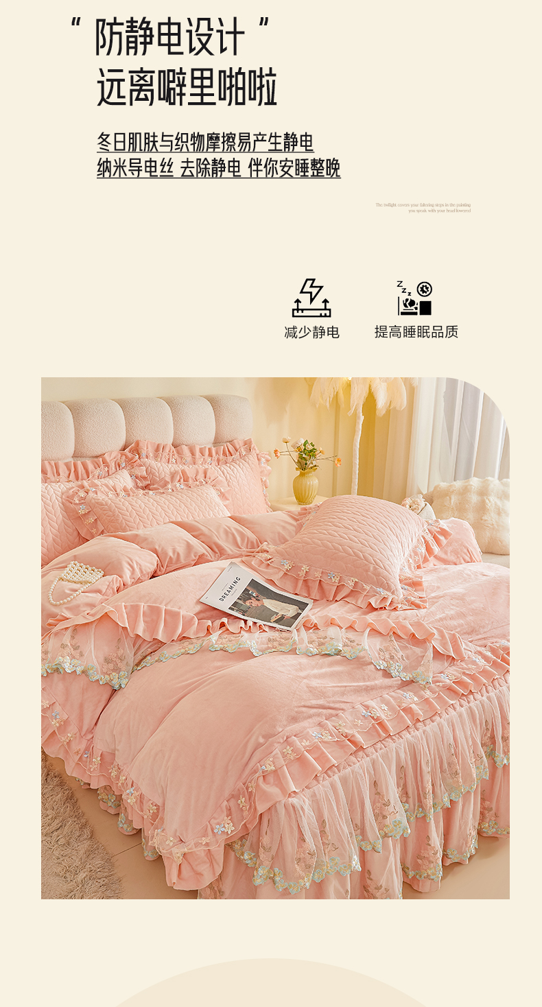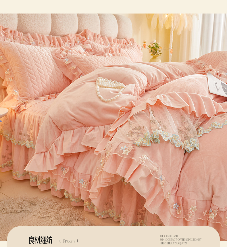 瑞宝 2025新款高克重宝宝绒刺绣床裙四件套-粉黛 粉黛-桃夭粉