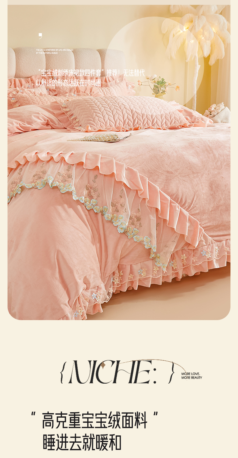 商品名称:瑞宝 2025新款高克重宝宝绒刺绣床裙四件套-粉黛 粉黛-桃夭粉