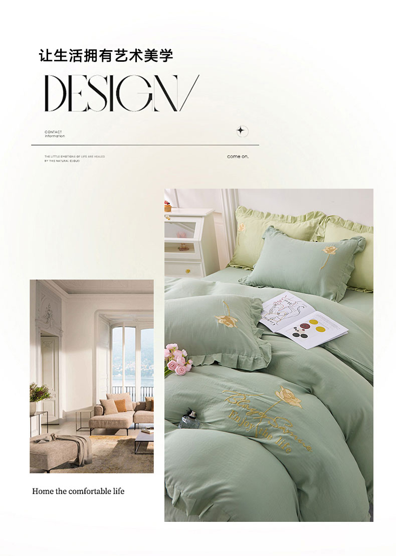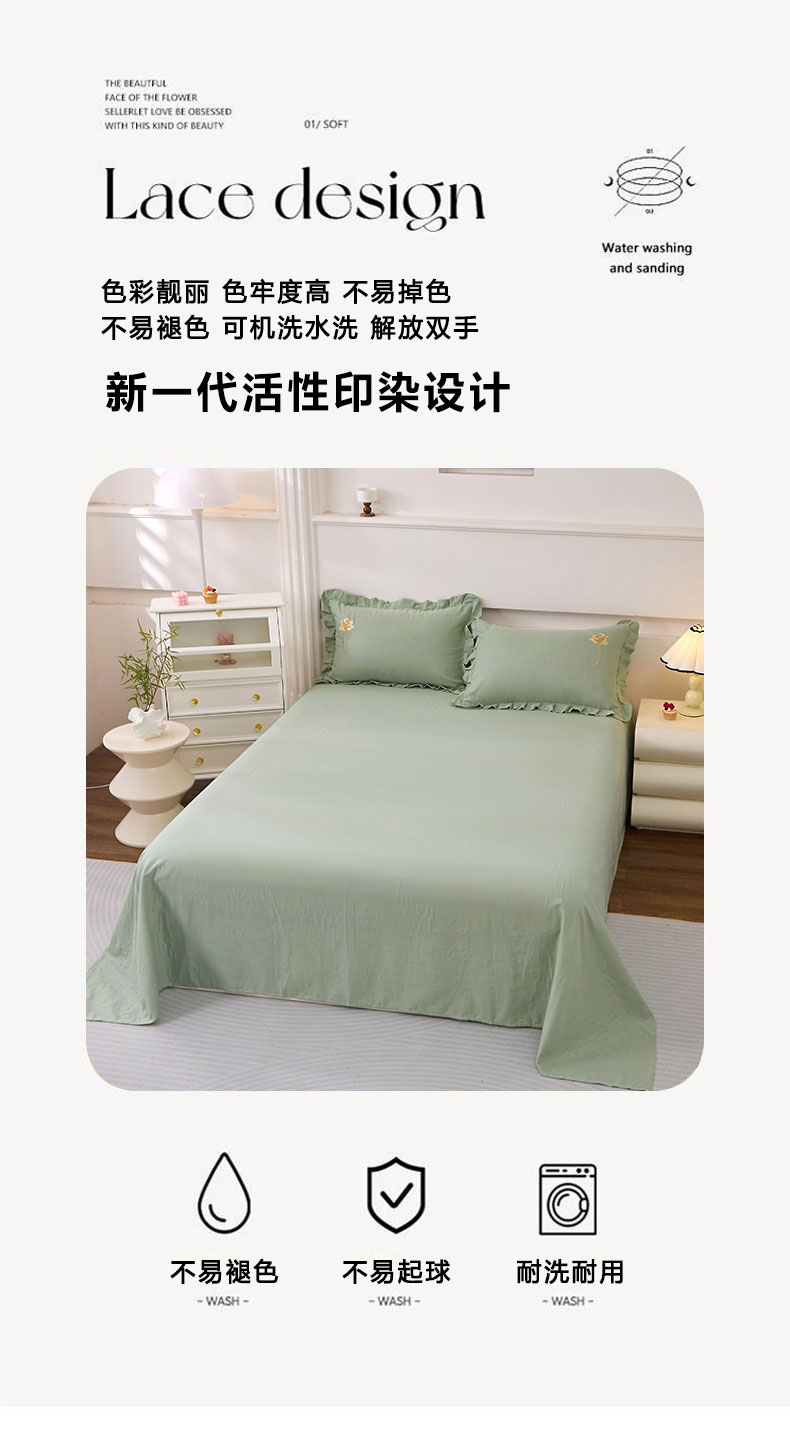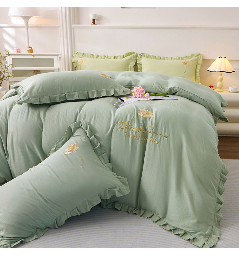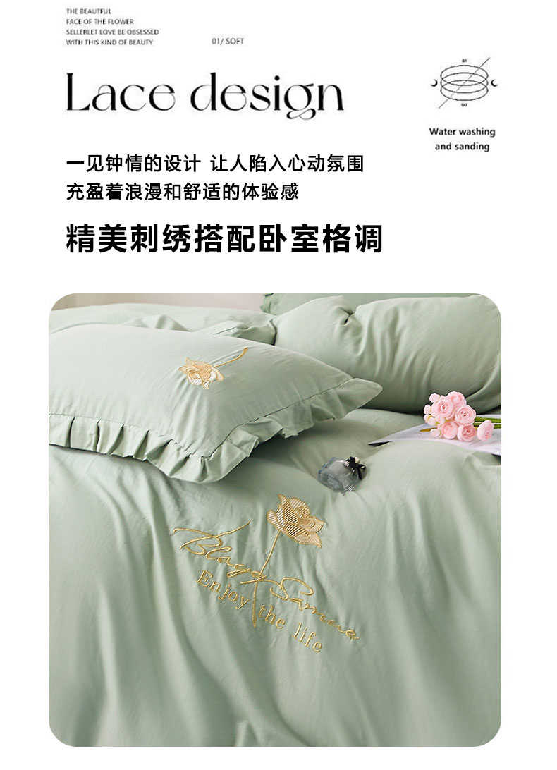 一比一家纺 2025新款全棉双层纱花边刺绣款四件套 绿芽