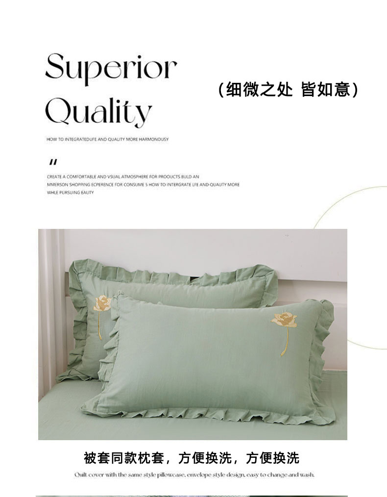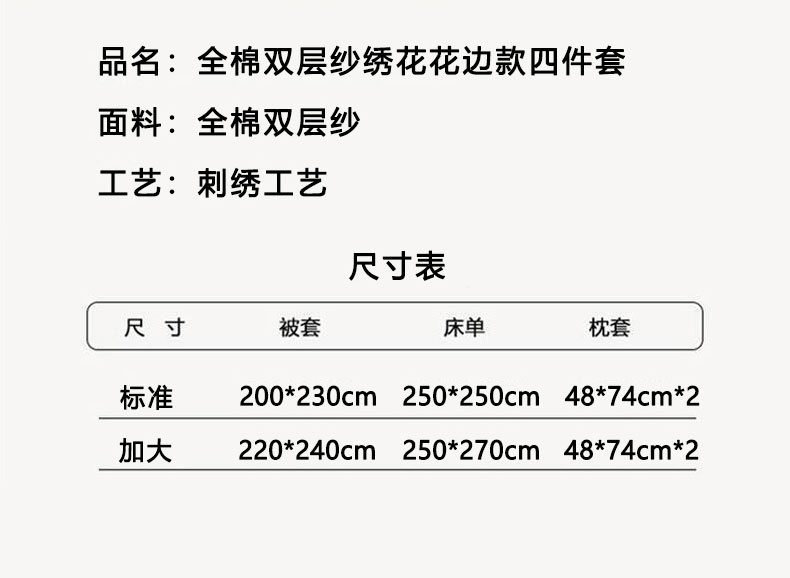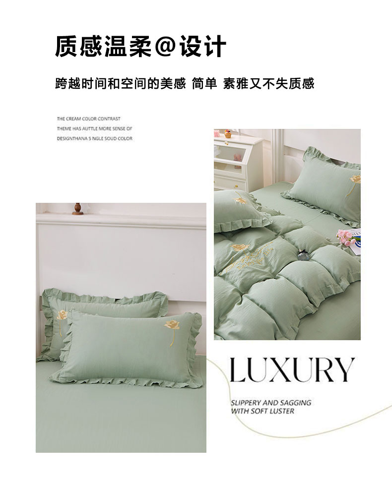 商品名称:一比一家纺 2025新款全棉双层纱花边刺绣款四件套 绿芽